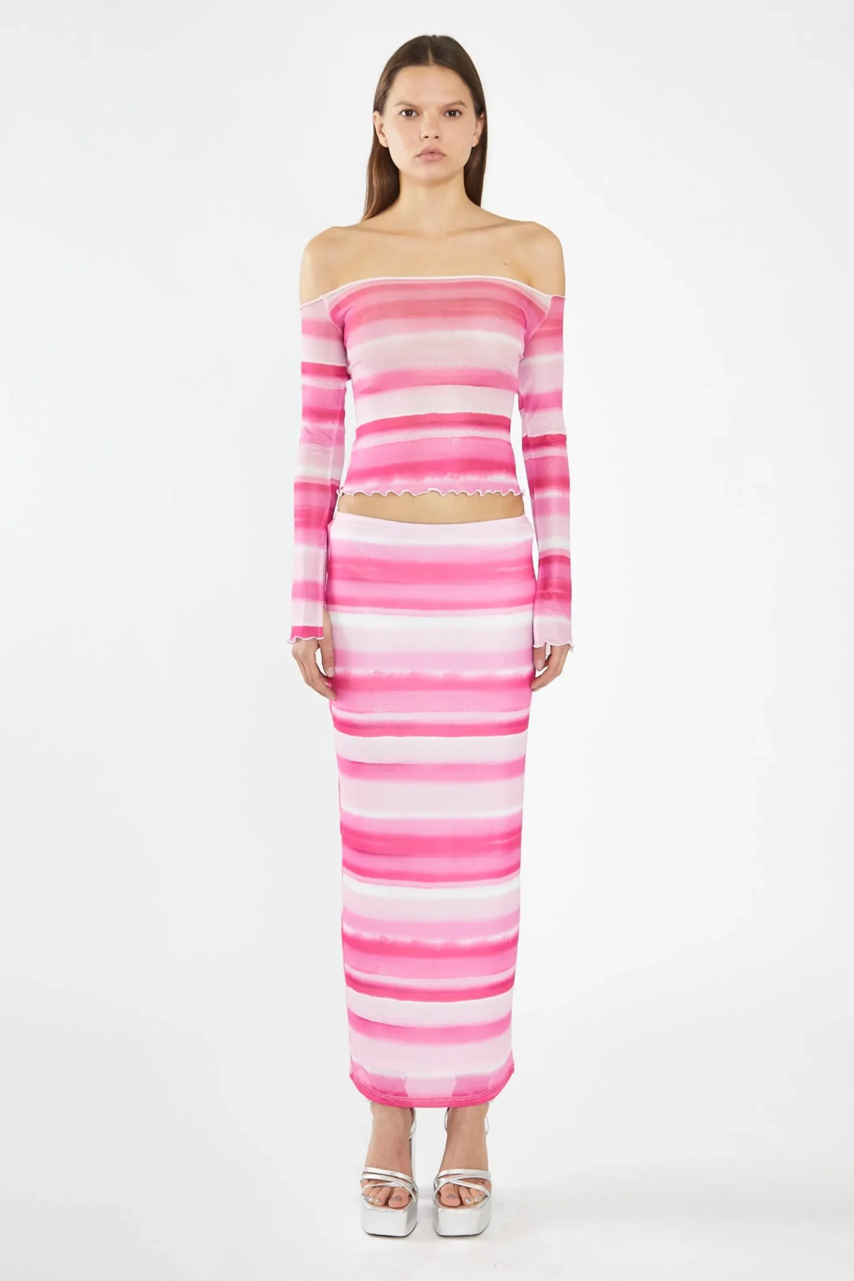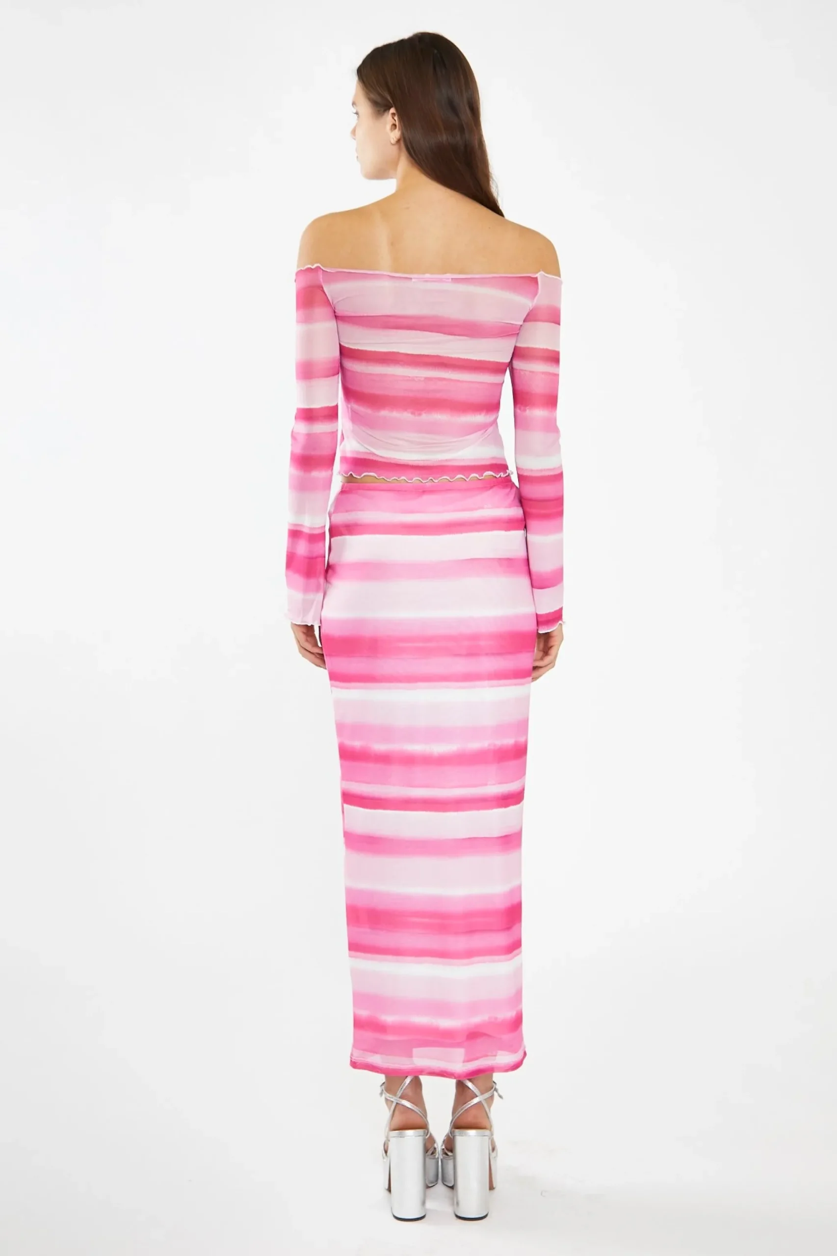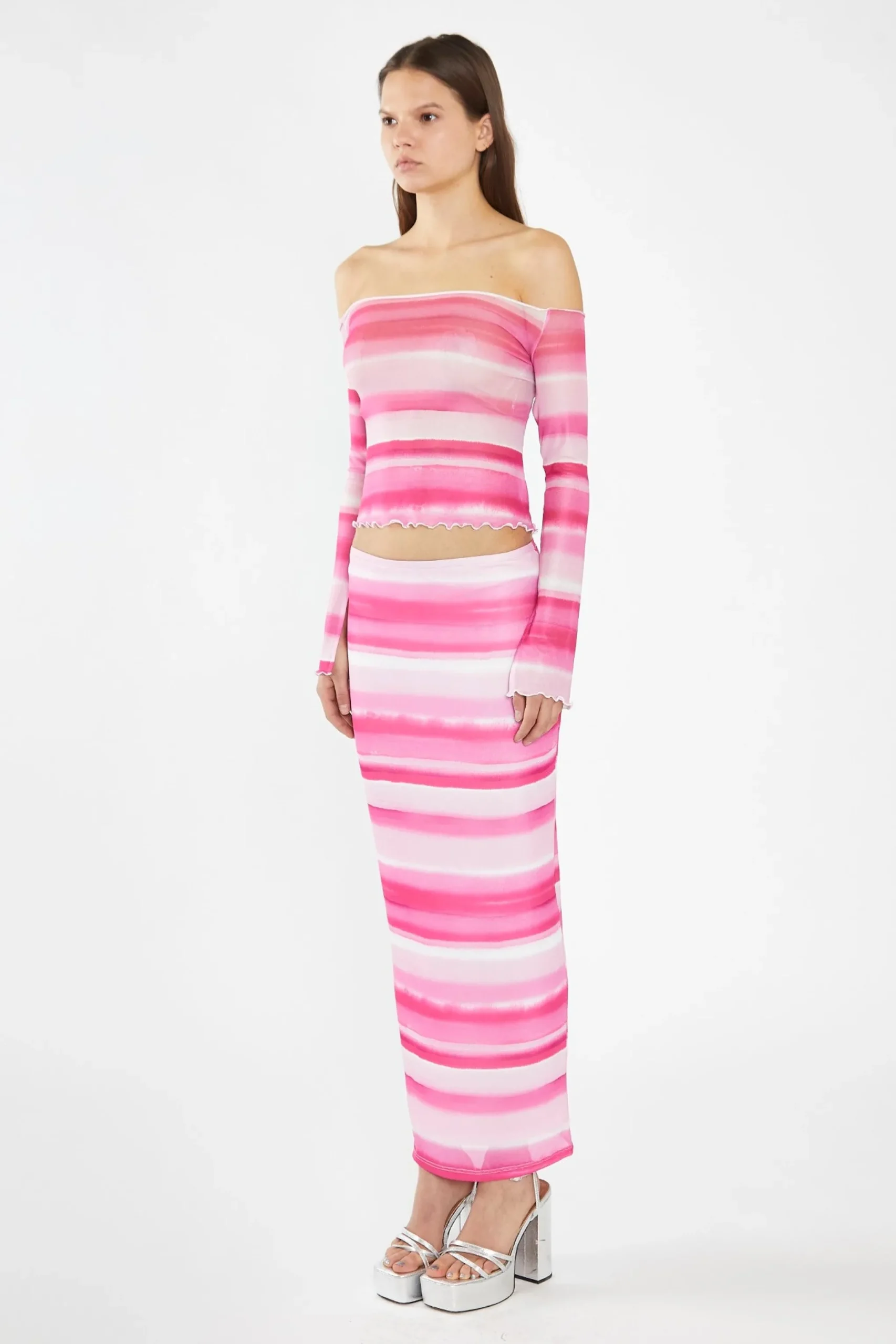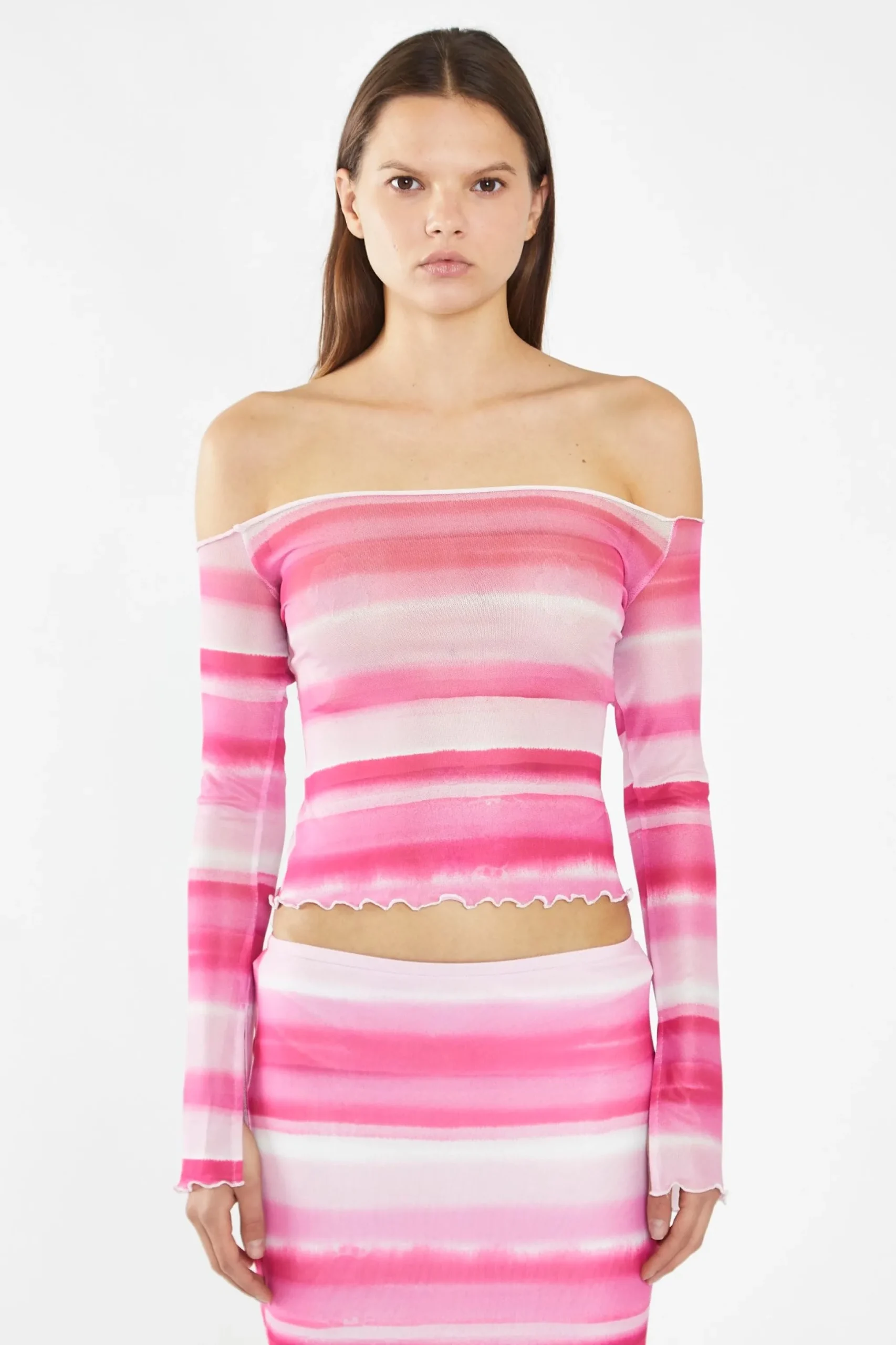 Glamorous Women’s Pink Ombre-Stripe Mesh Off the Shoulder -Top. This fun and flirty Pink Ombre-Stripe Mesh Top will make a statement for any occasion. The mesh fabric features bold ombré stripes and the off the shoulder silhouette is complete with long flared sleeves and lettuce hem detailing. Pair with the matching skirt and you’ll be ready to party in this fashionable ensemble!