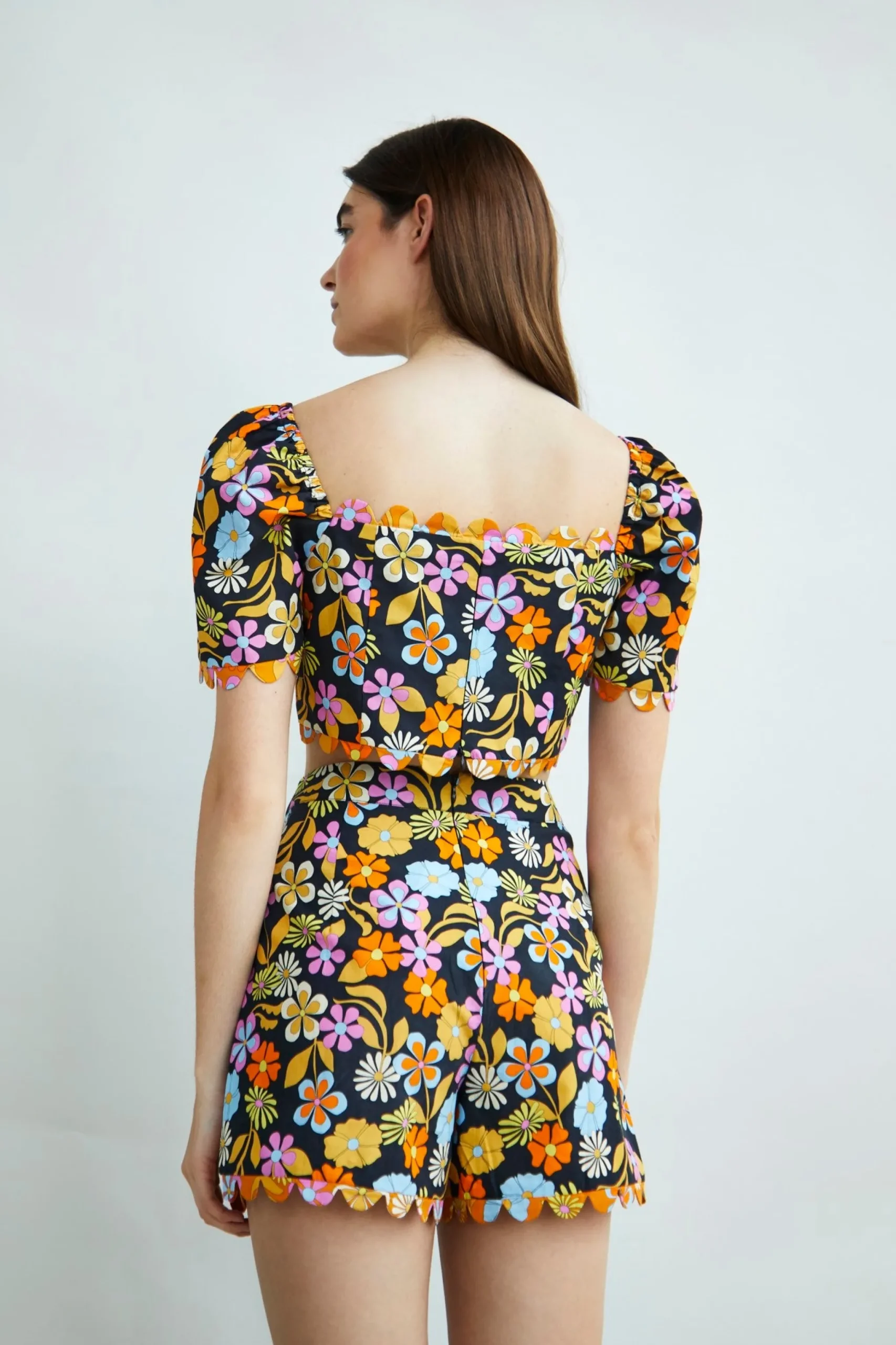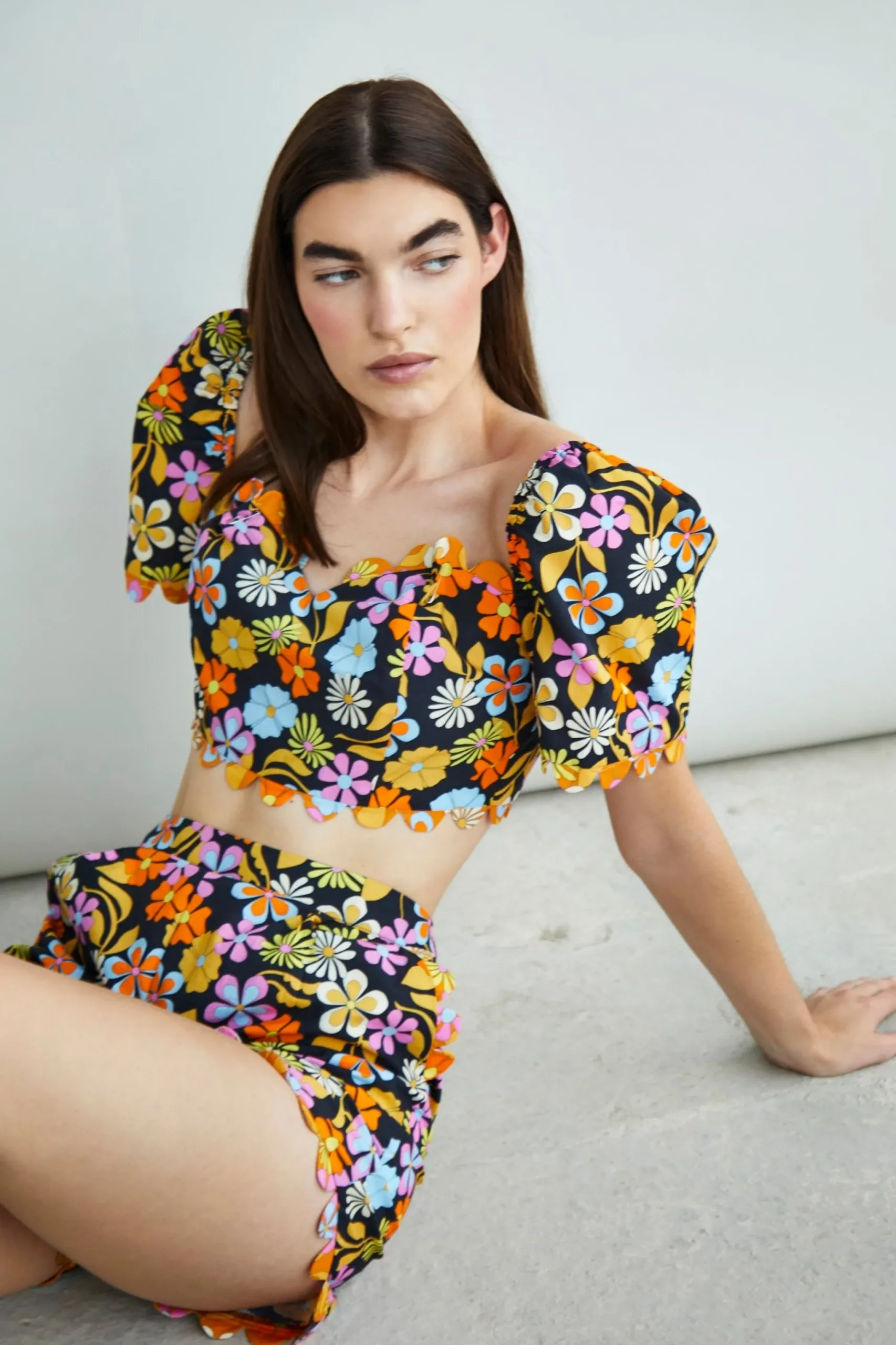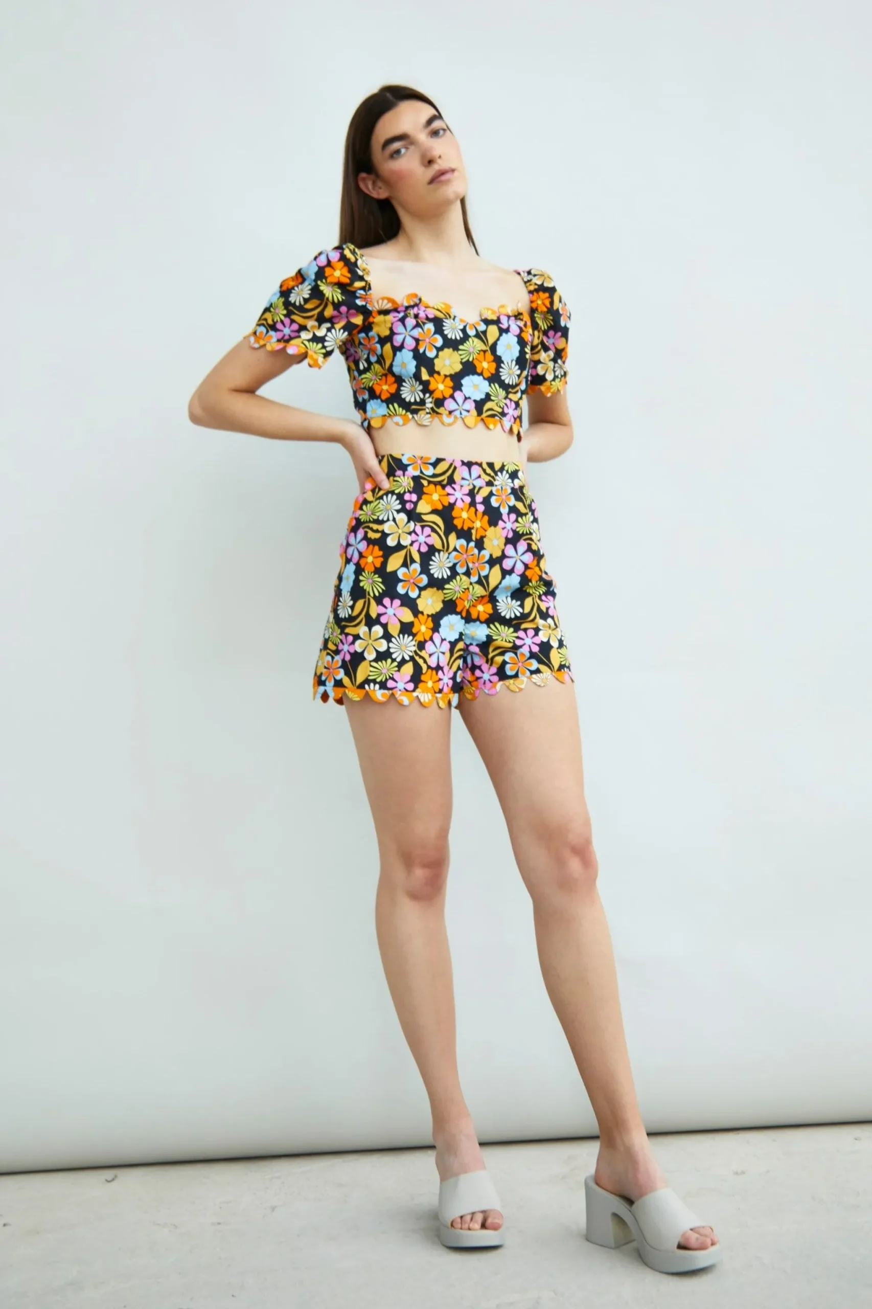 Glamorous Collection Bright Floral Mix Print Scallop Edge Shorts. These shorts are perfect for your wardrobe this season! Featuring pleats and scallop trim details. Looks fab paired with some cute strappy heels and the matching crop top for the ultimate stylish look!