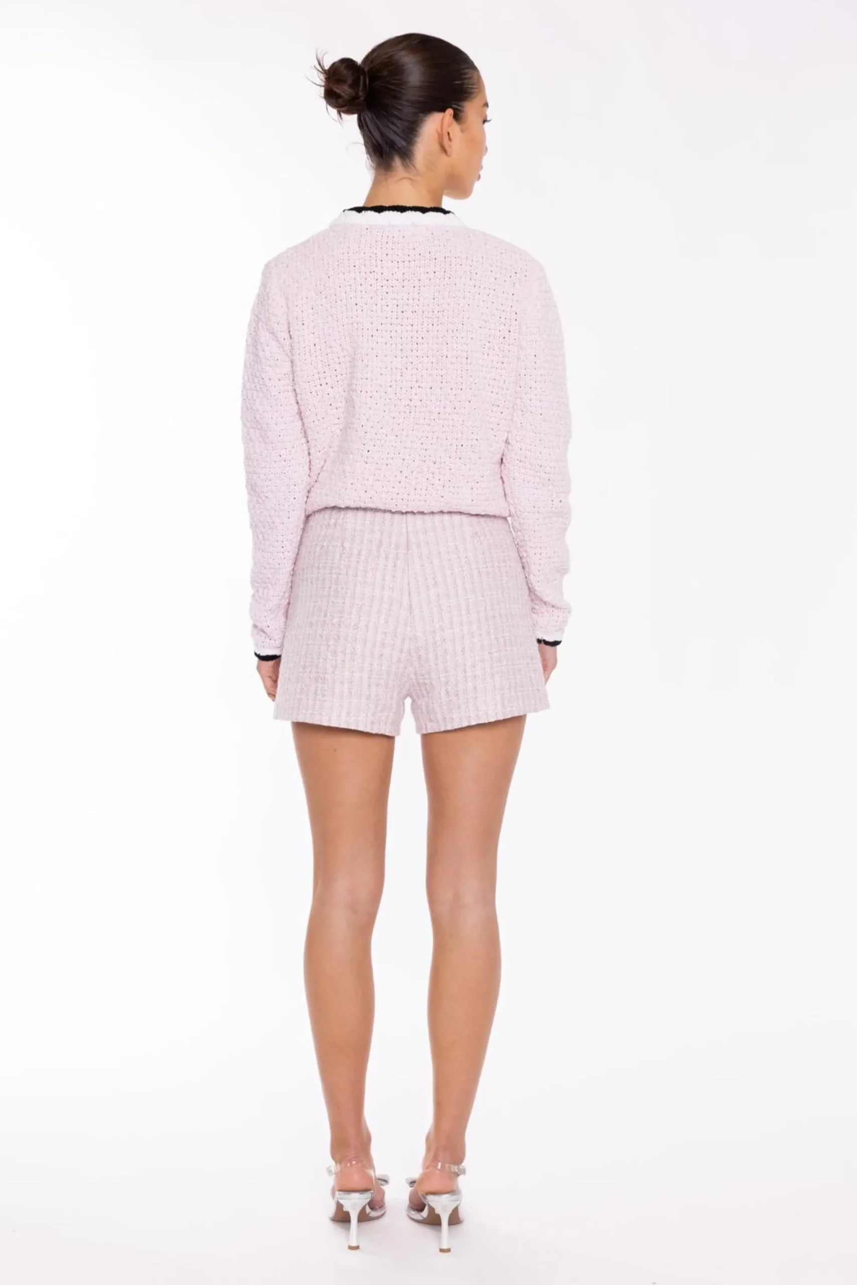 Glamorous Women’s Pink-White Tweed Mini Shorts. Elevate your summer style with our chic Pink-White Tweed Mini-Shorts. Crafted from a luxurious tweed fabric, these shorts boast a playful yet polished look, perfect for any occasion. The addition of pearl diamante buttons and patch pockets adds a touch of elegance, while the matching blazer completes the ensemble for a cohesive, put-together vibe. Embrace the warmth of the season in comfort and style with this versatile set. Pair it with your favourite tank top and sandals for a casual daytime look, or dress it up with heels and a blouse for a night out. Elevate your wardrobe with this chic and effortless tweed mini-shorts set.
