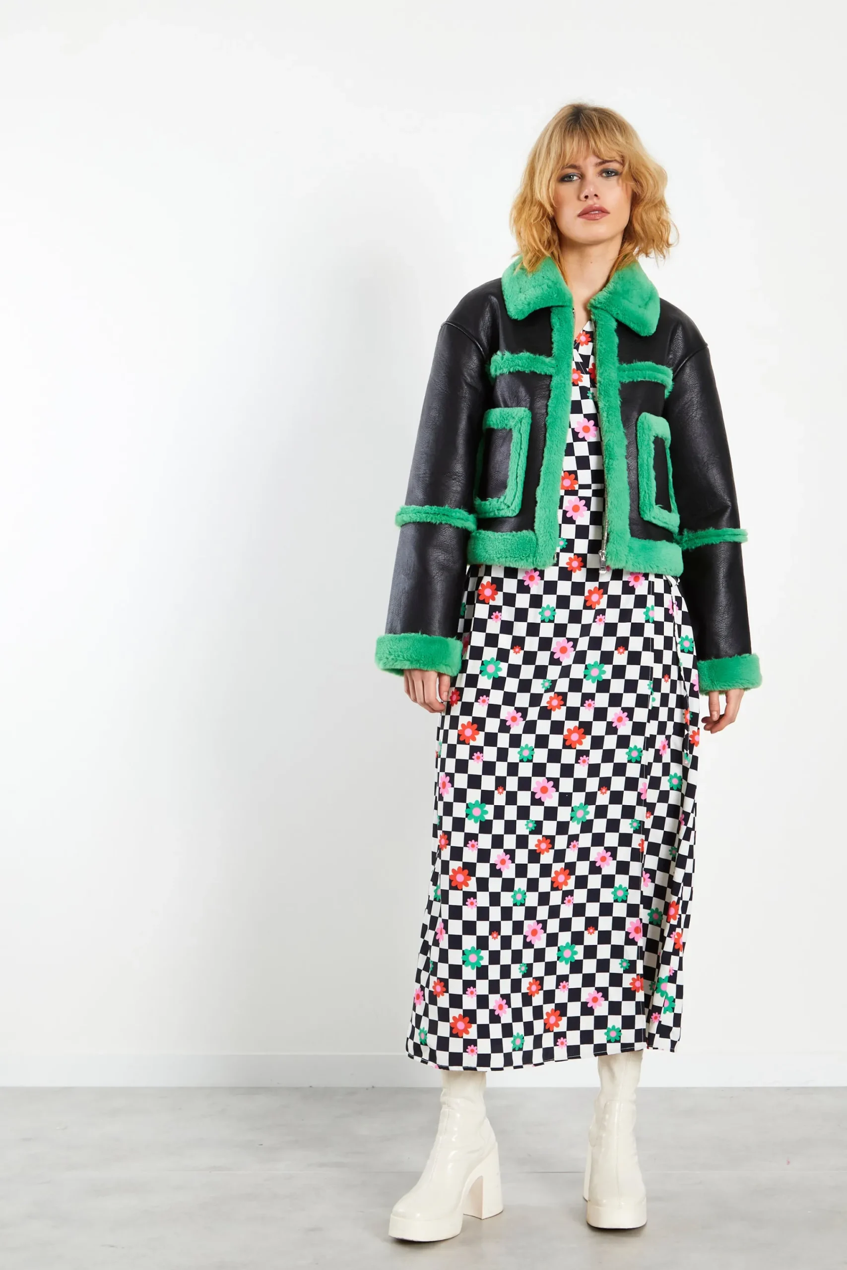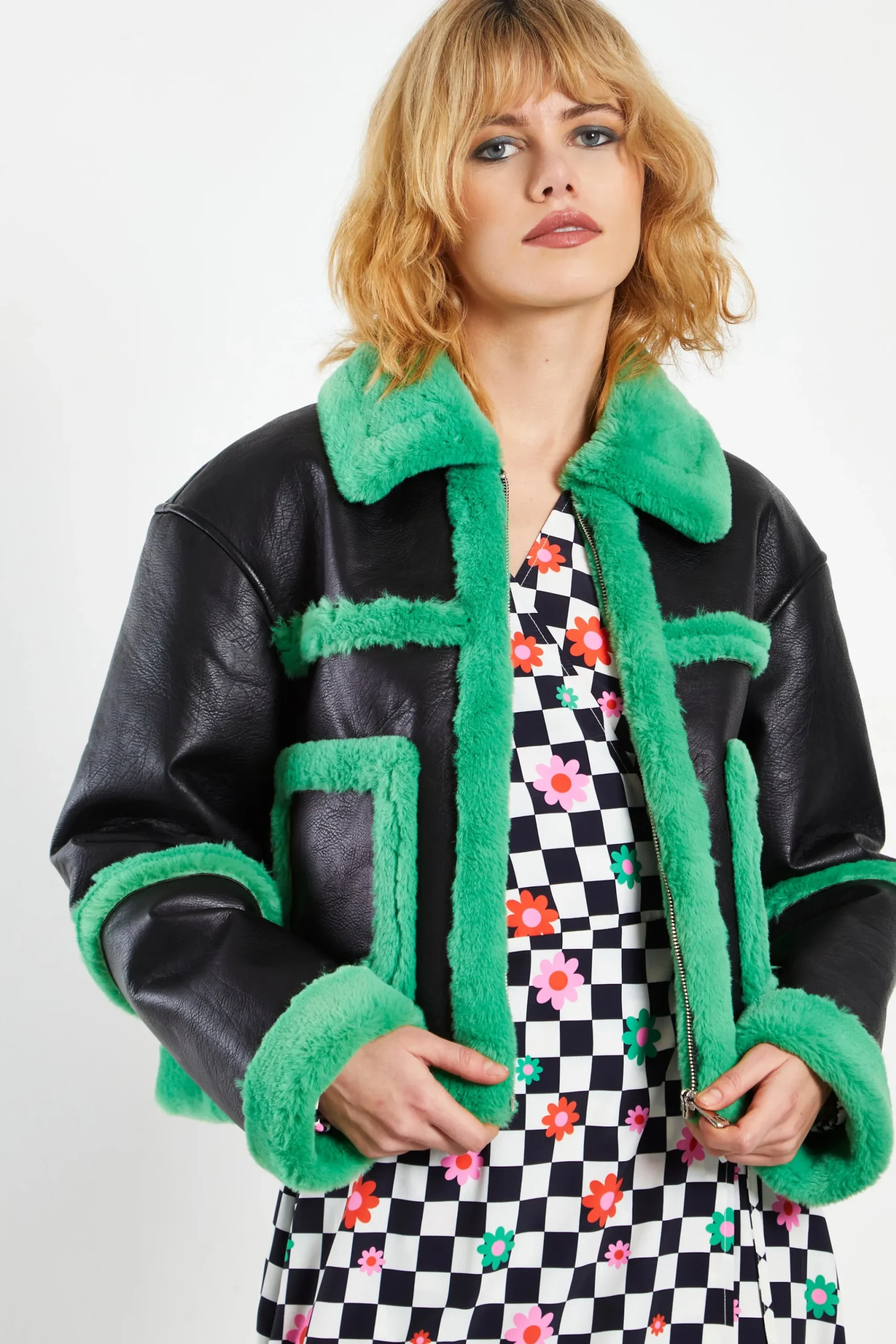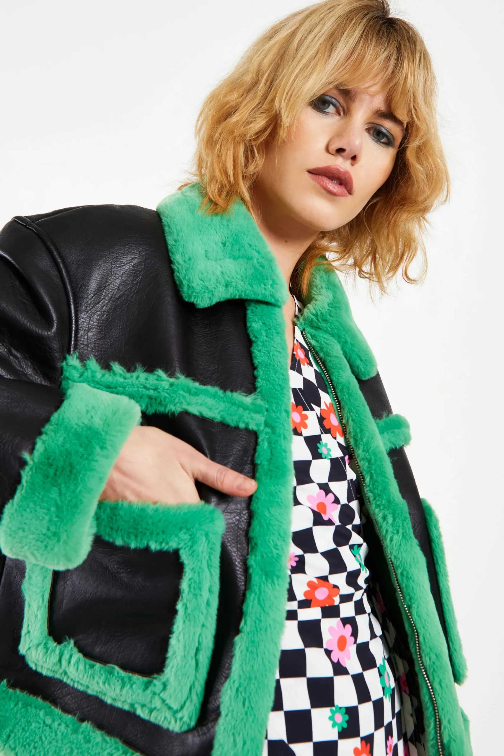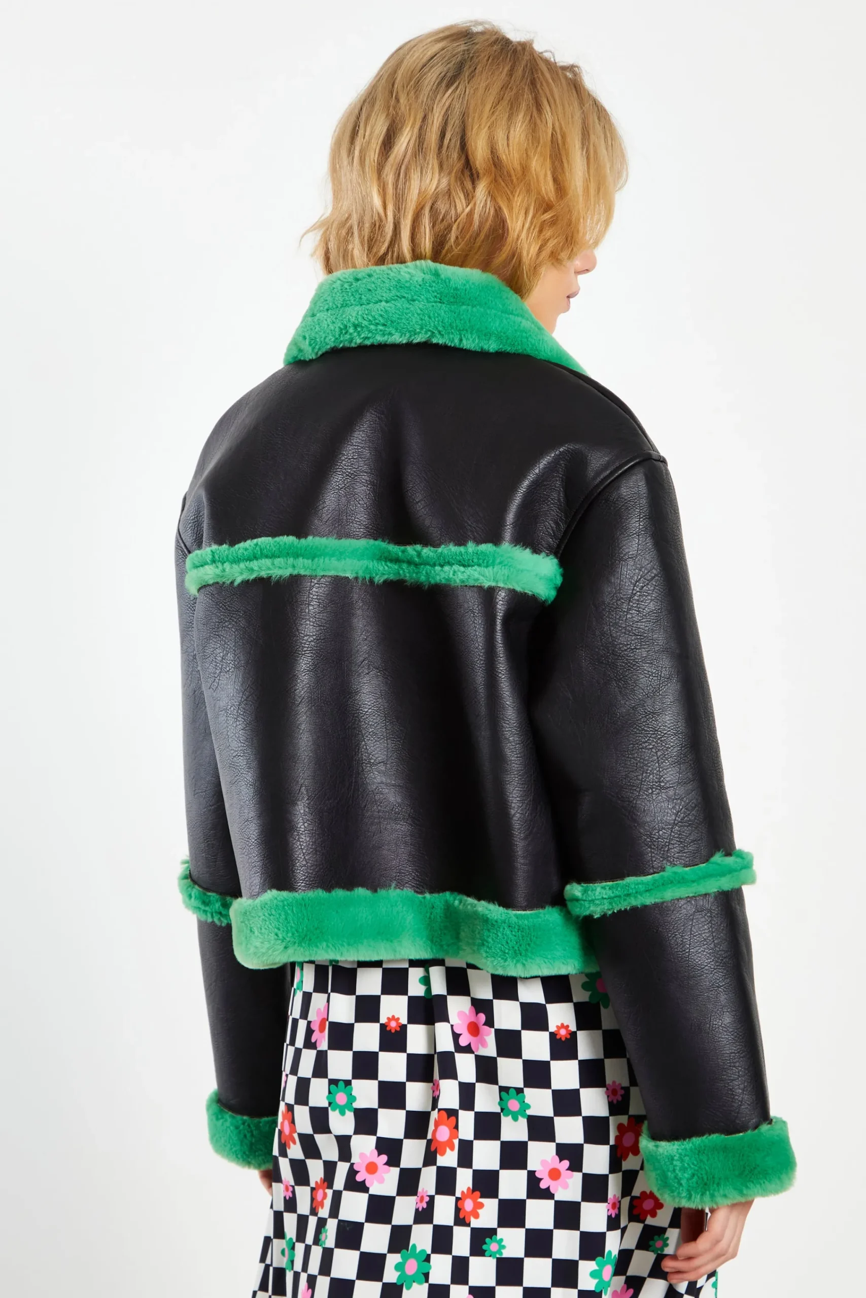Glamorous Black Green Cropped Shearling Trim Coat. Fashion forward and chic we love this coat here at Glamorous. With a cropped fit and contrasting shearling trim detail, you cannot go wrong with this look.