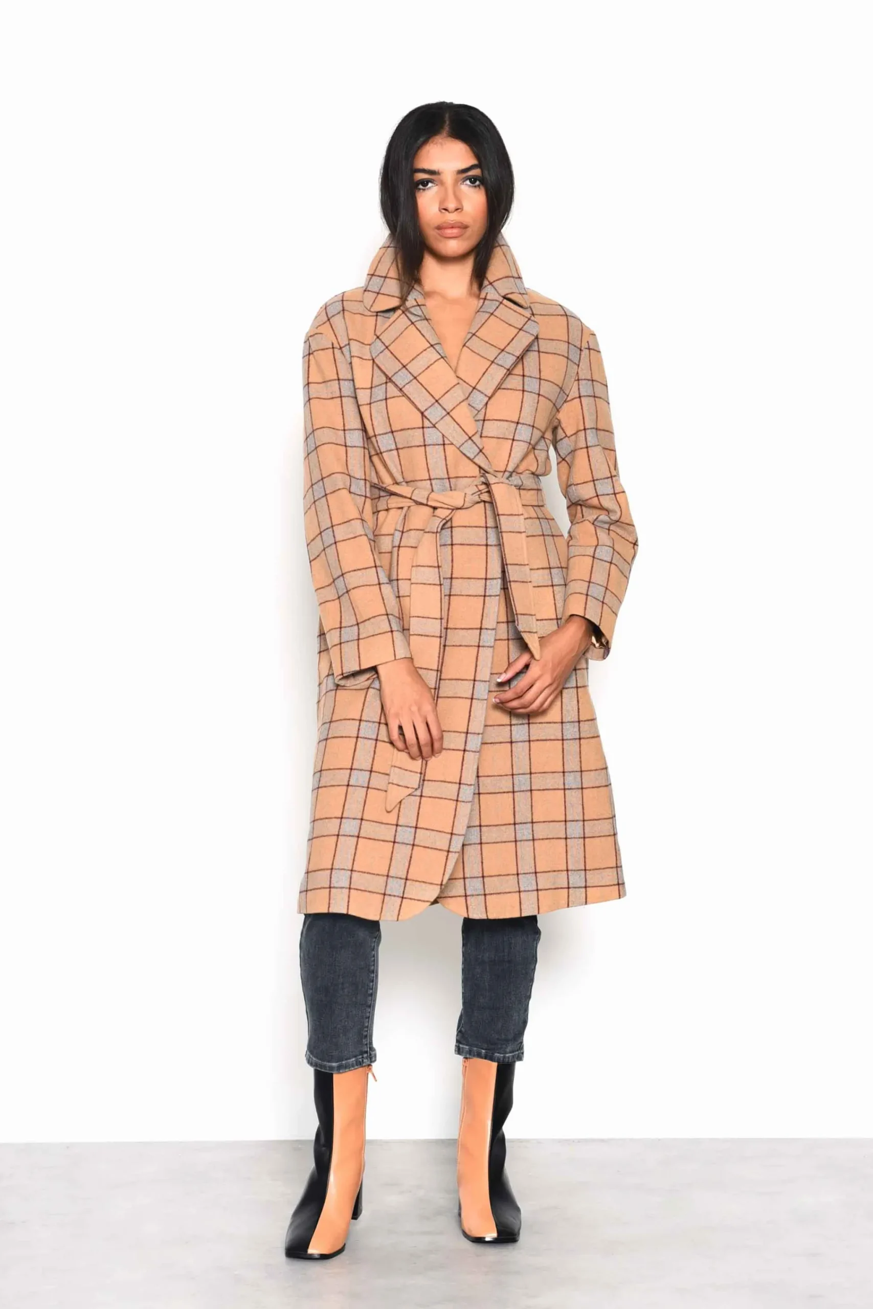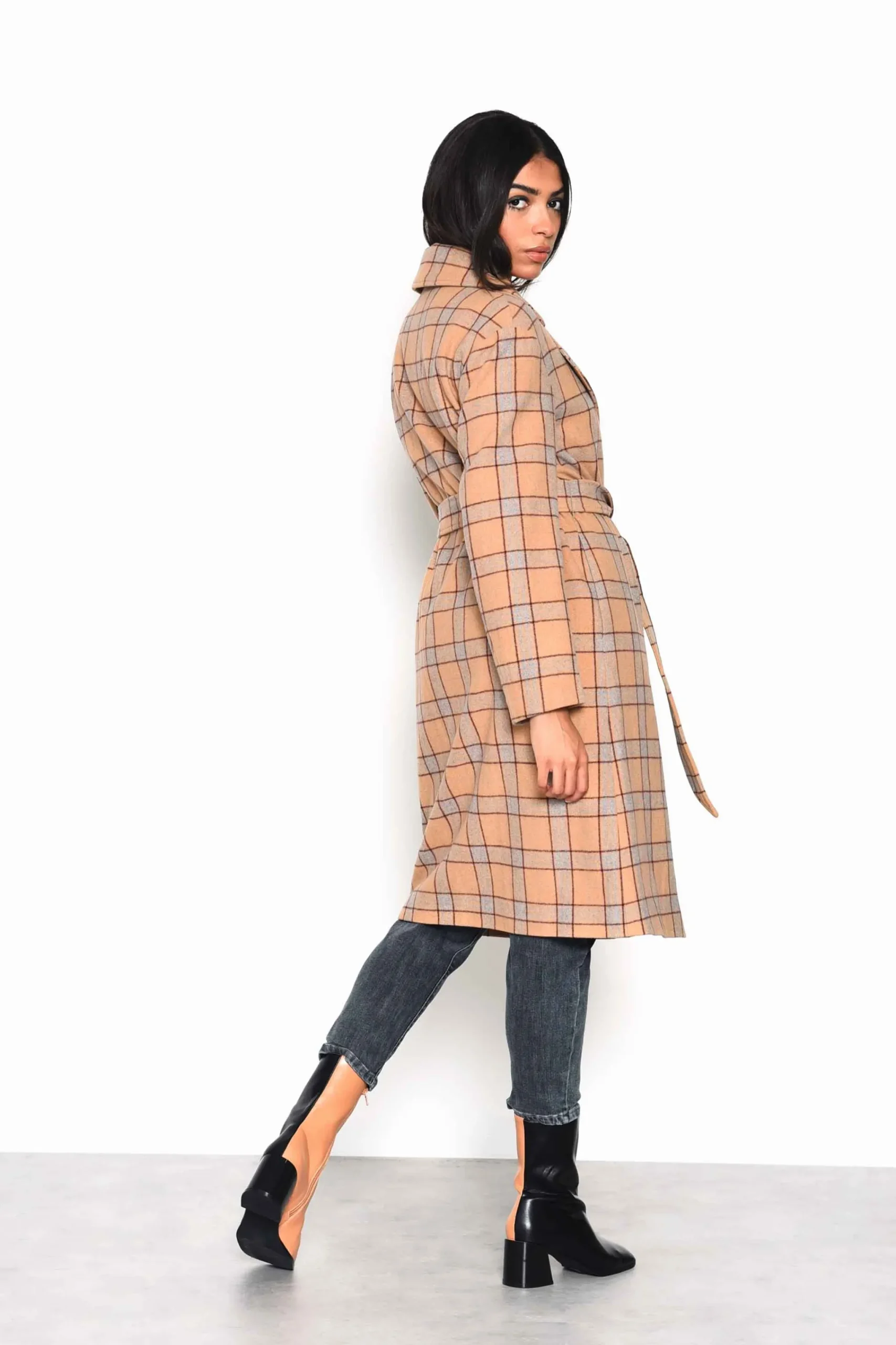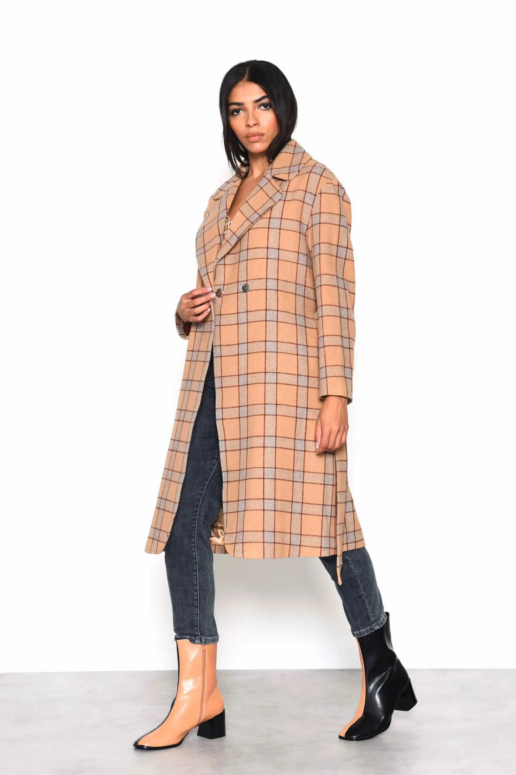 Glamorous Camel Multi Check Double Breasted Longline Coat with Waist belt. This coat is perfect for Autumn! Featuring a double breasted fit, longline length and waist belt, the coat is a must have!