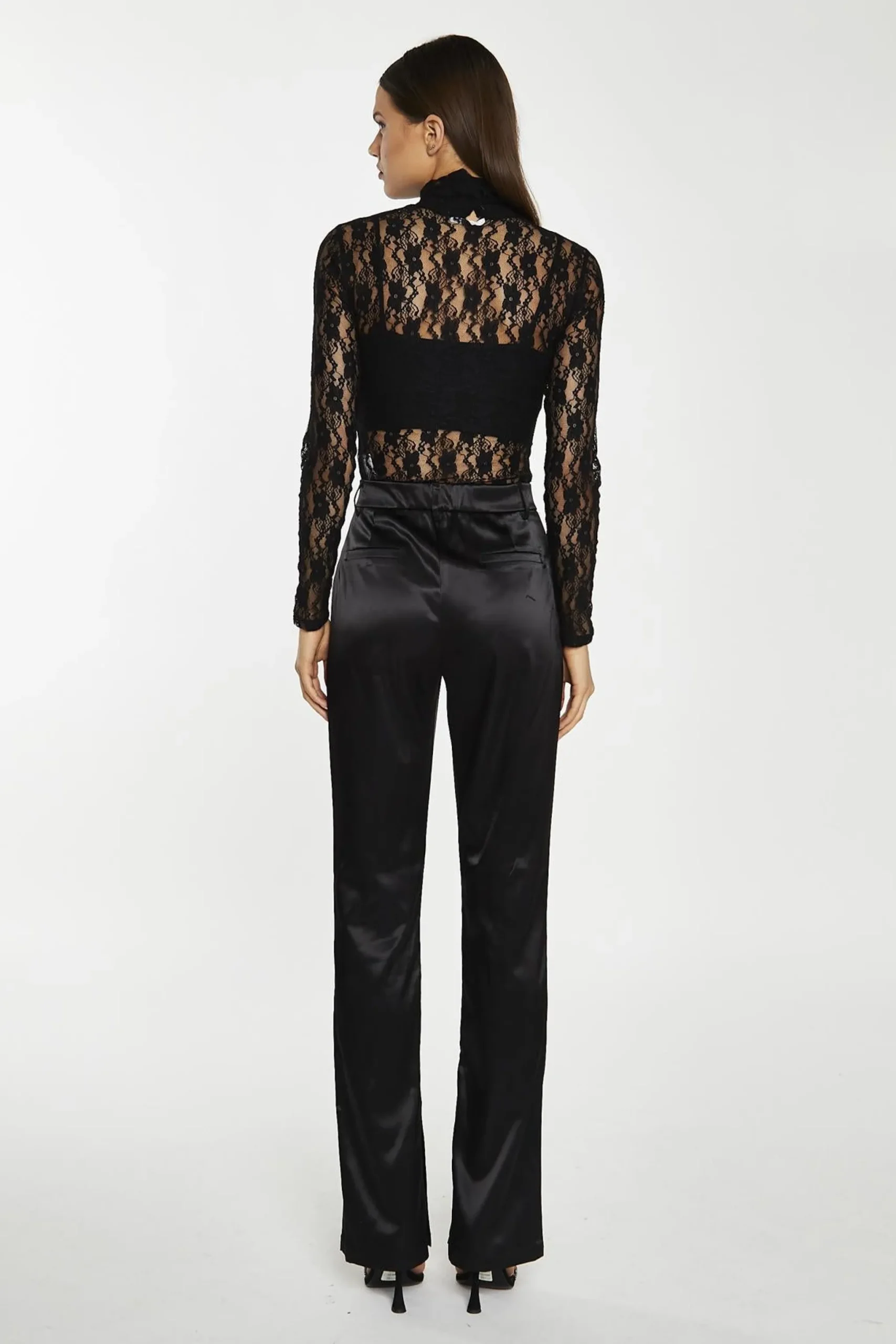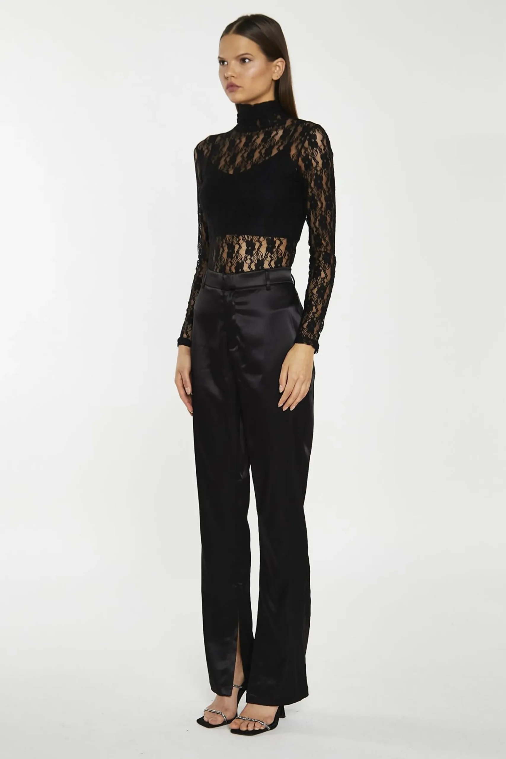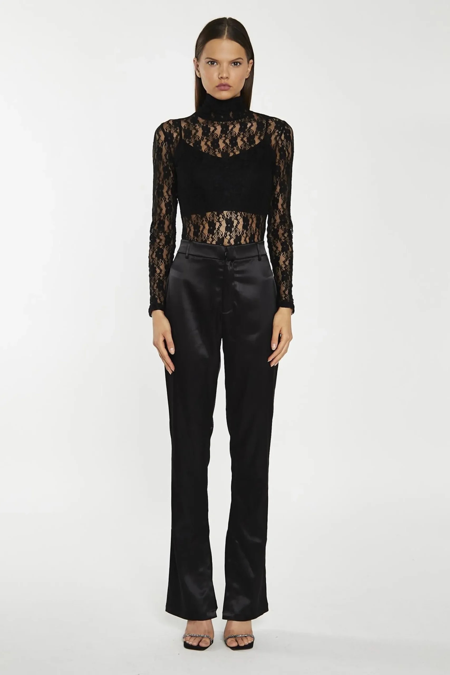 Glamorous Women’s Black-Lace High-Neck Bodysuit. This black lace high neck bodysuit is a stunning blend of elegance and comfort. The delicate lace fabric adds a touch of romance and intrigue, while the high neckline gives it a classy, refined look. Long, skinny fit sleeves hug your arms, creating a sleek silhouette that’s both flattering and cozy. The bodycon fit accentuates your curves in all the right places, making you feel confident and stylish. For added convenience, there’s a plastic popper opening at the bottom, ensuring easy wear and removal. This versatile piece can be dressed up or down – pair it with a high-waisted skirt and heels for a night out, or throw on some jeans and a blazer for a more casual yet put-together look. The bodysuit’s design makes it perfect for layering under jackets or cardigans when the weather gets cooler. It’s the kind of wardrobe staple that you’ll find yourself reaching for time and time again, thanks to its timeless style and comfortable fit.