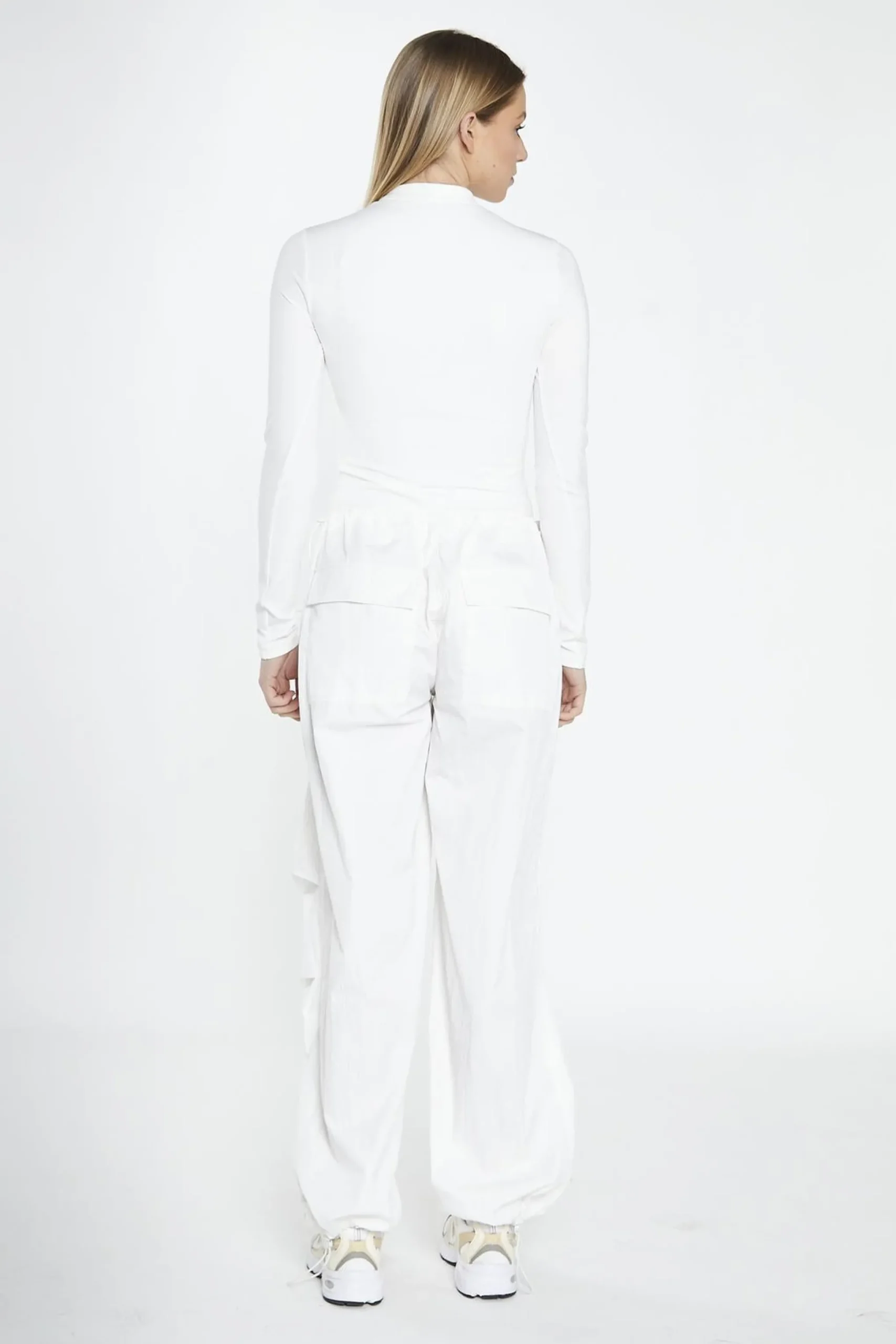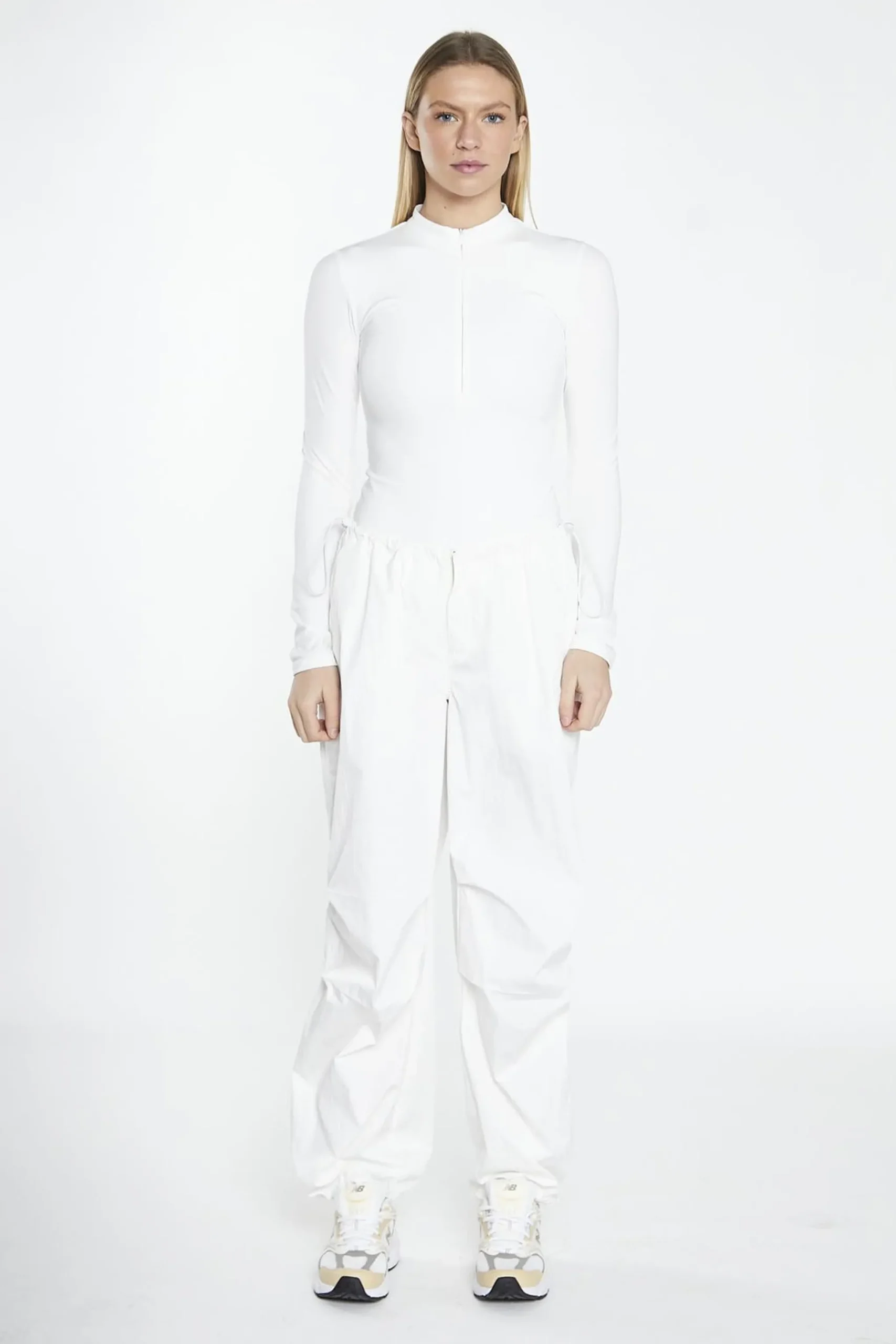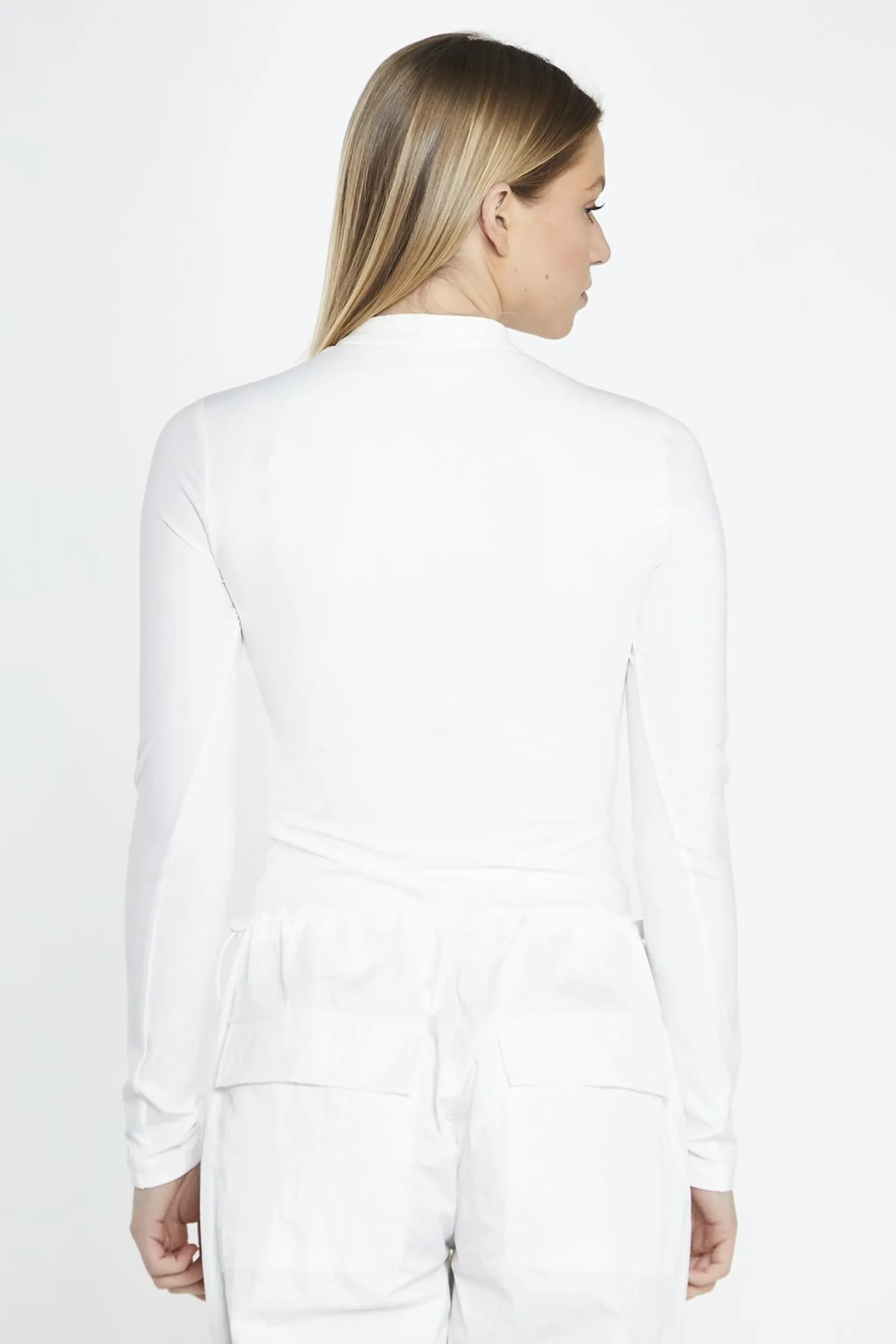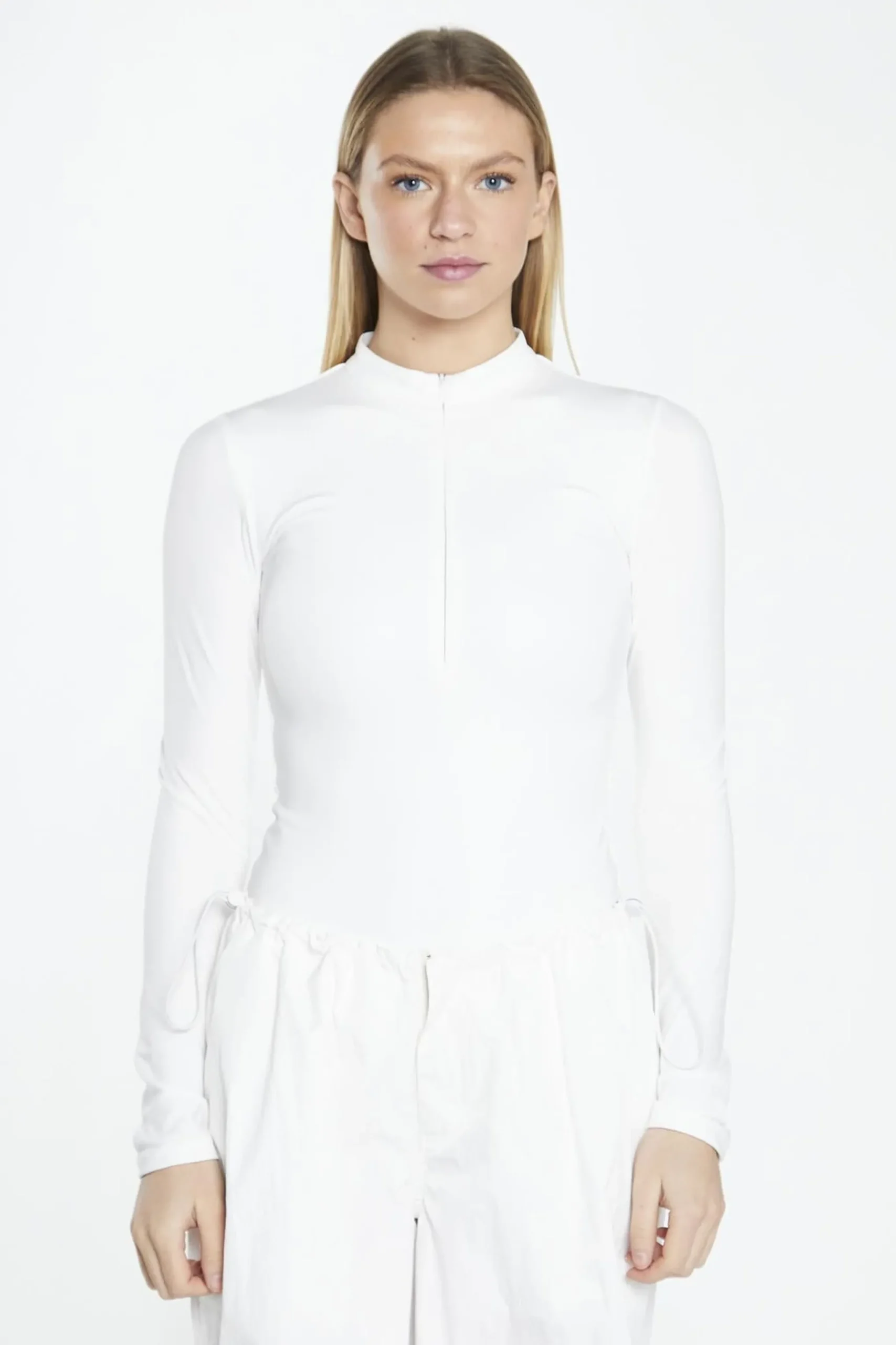 Glamorous Women’s Off White Long-Sleeve Zip-Up Bodysuit. Dress to impress in this perfect Off White Long-Sleeve Zip-Up Bodysuit! This bodycon fit will hug all the right curves, while the high neck and long sleeves provide a look that’s chic-yet-comfy. Style under one of our perfectly tailored suit sets for a that modern city girl look!