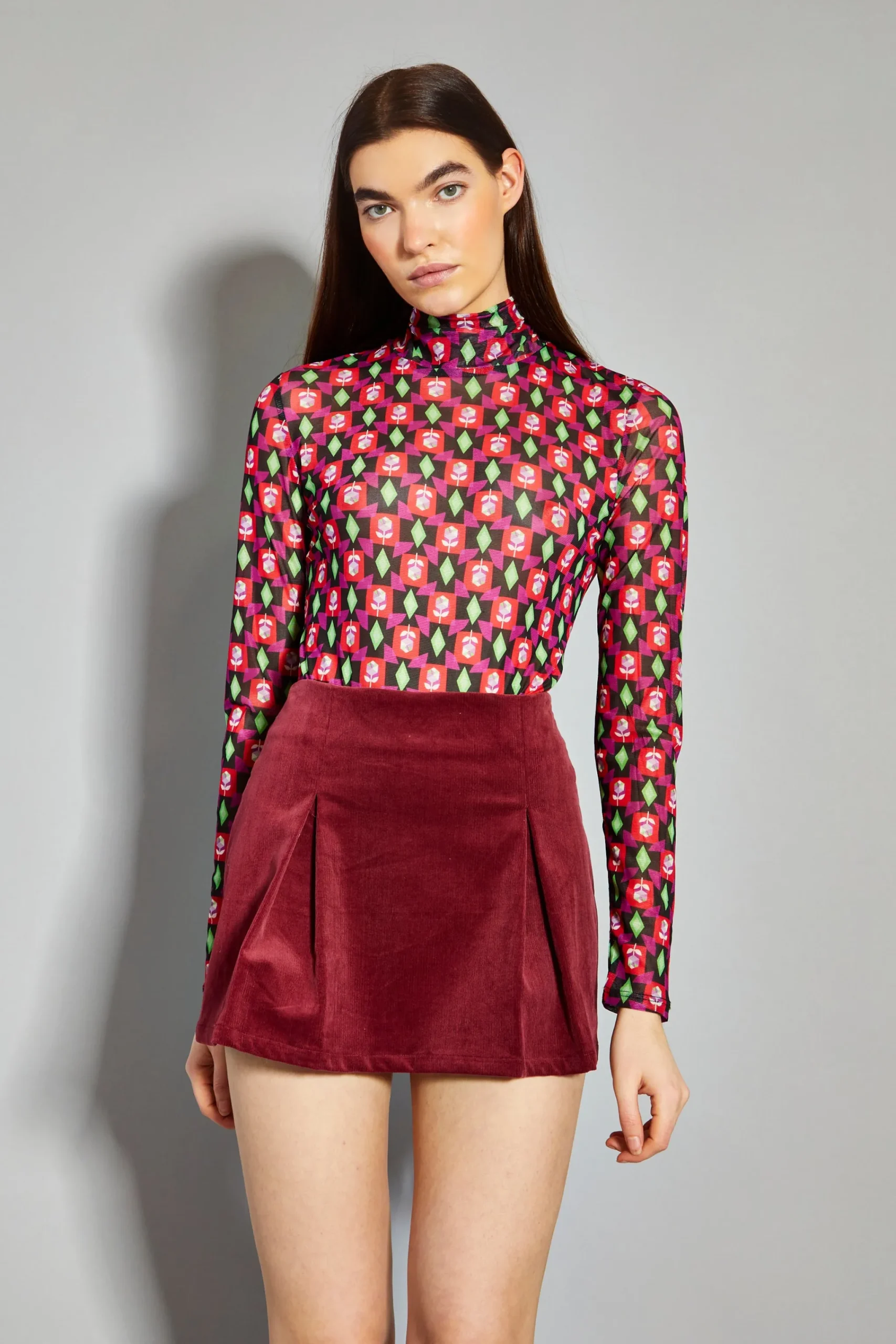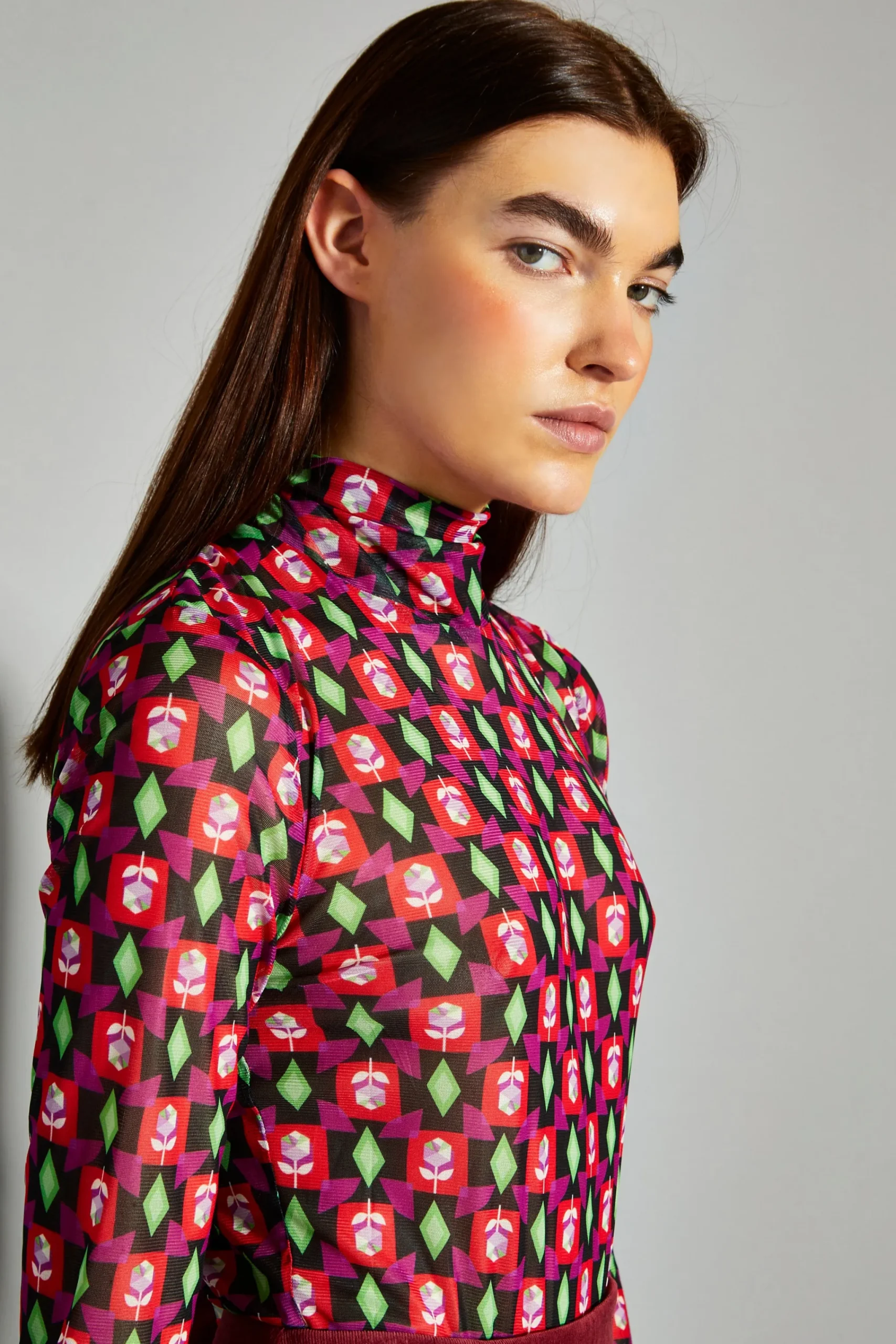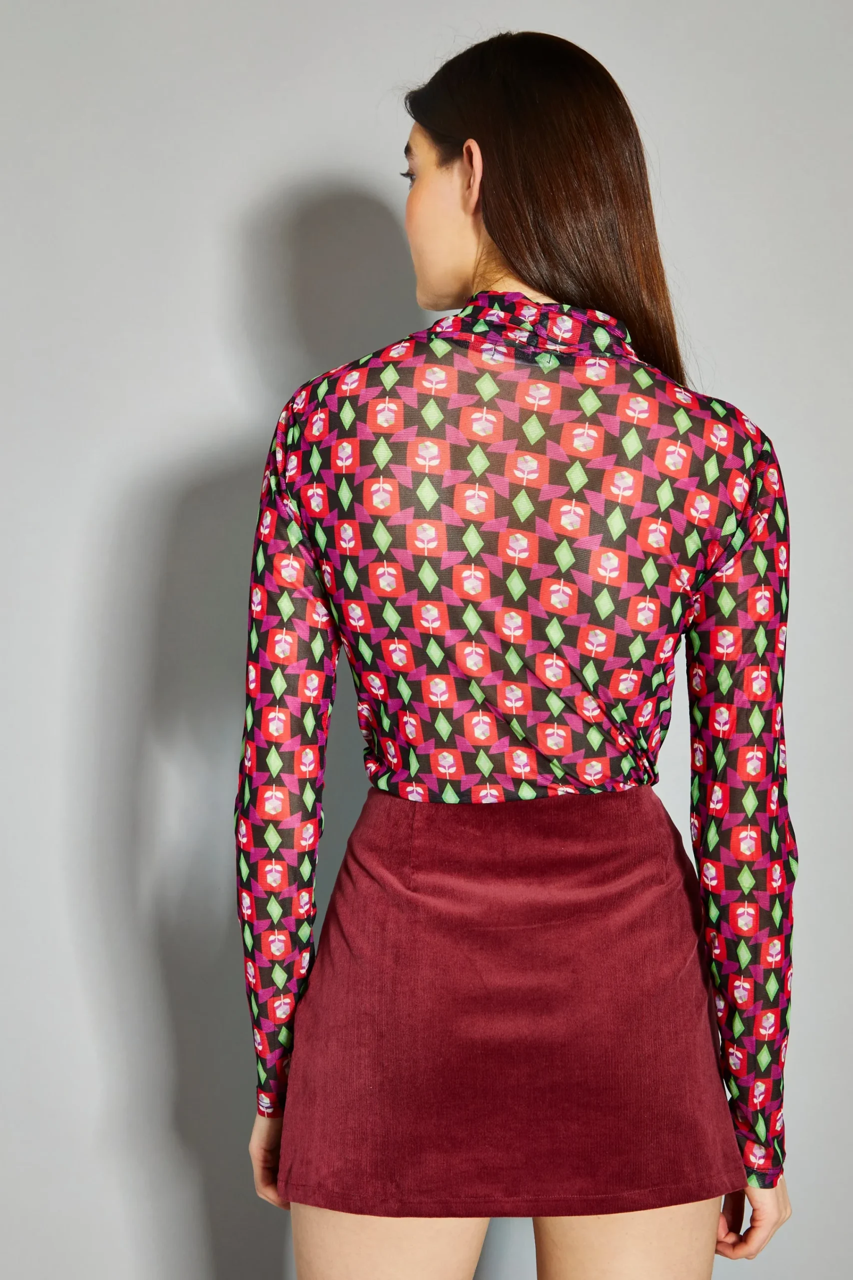 Glamorous Rose Multi Geo Print Mesh High Neck Bodysuit. We cant get enough of this mesh bodysuit featuring a high neckline and stunning rose geometric print. Style with a mini skirt and knee high boots for the ultimate fashion forward look this season!