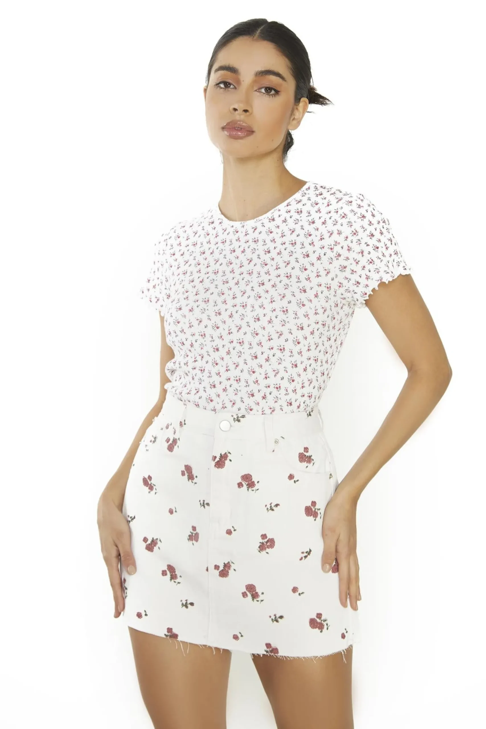 Glamorous Women’s White-Ditsy Pointelle Floral Lettuce-Hem Top. Add a dash of sweetness to your wardrobe with our White Ditsy Pointelle Floral Lettuce-Hem Short Sleeve-Top. This charming little number is like wearing a breath of fresh air – light, breezy, and oh-so-pretty. The delicate floral print scattered across the white background gives it a vintage-inspired feel that’s both romantic and playful. The pointelle detailing adds a touch of intricate texture, making this top a feast for the eyes and fingers alike. A crew neck keeps things classic, while the short sleeves are perfect for those warm days when you want to feel the sun on your skin. But the real star of the show? That adorable lettuce-hem, adding a fun, flirty finish that’s sure to make you smile. This top is like a mood-lifter in fabric form – just put it on and watch your day get a little brighter. Pair it with your favourite jeans for a casual lunch date, or tuck it into a skirt for a more polished look. It’s the kind of top that makes you want to twirl in front of the mirror, even if you’re just heading to the grocery store. Comfortable, cute, and effortlessly stylish, this top is ready to become your new go-to for days when you need a little extra pep in your step.