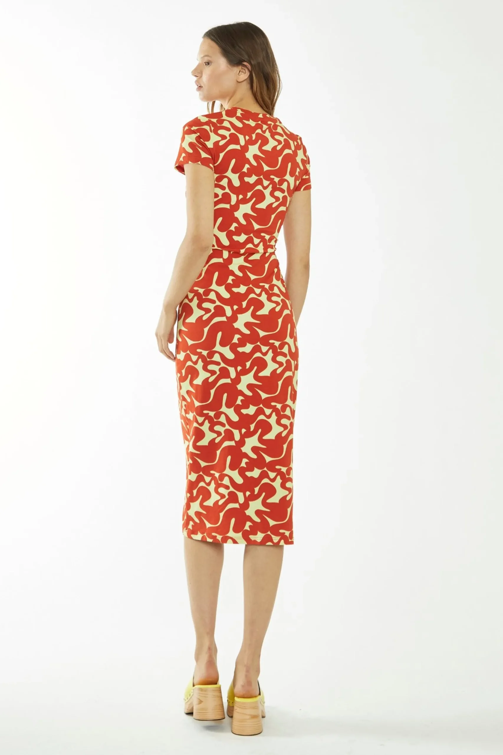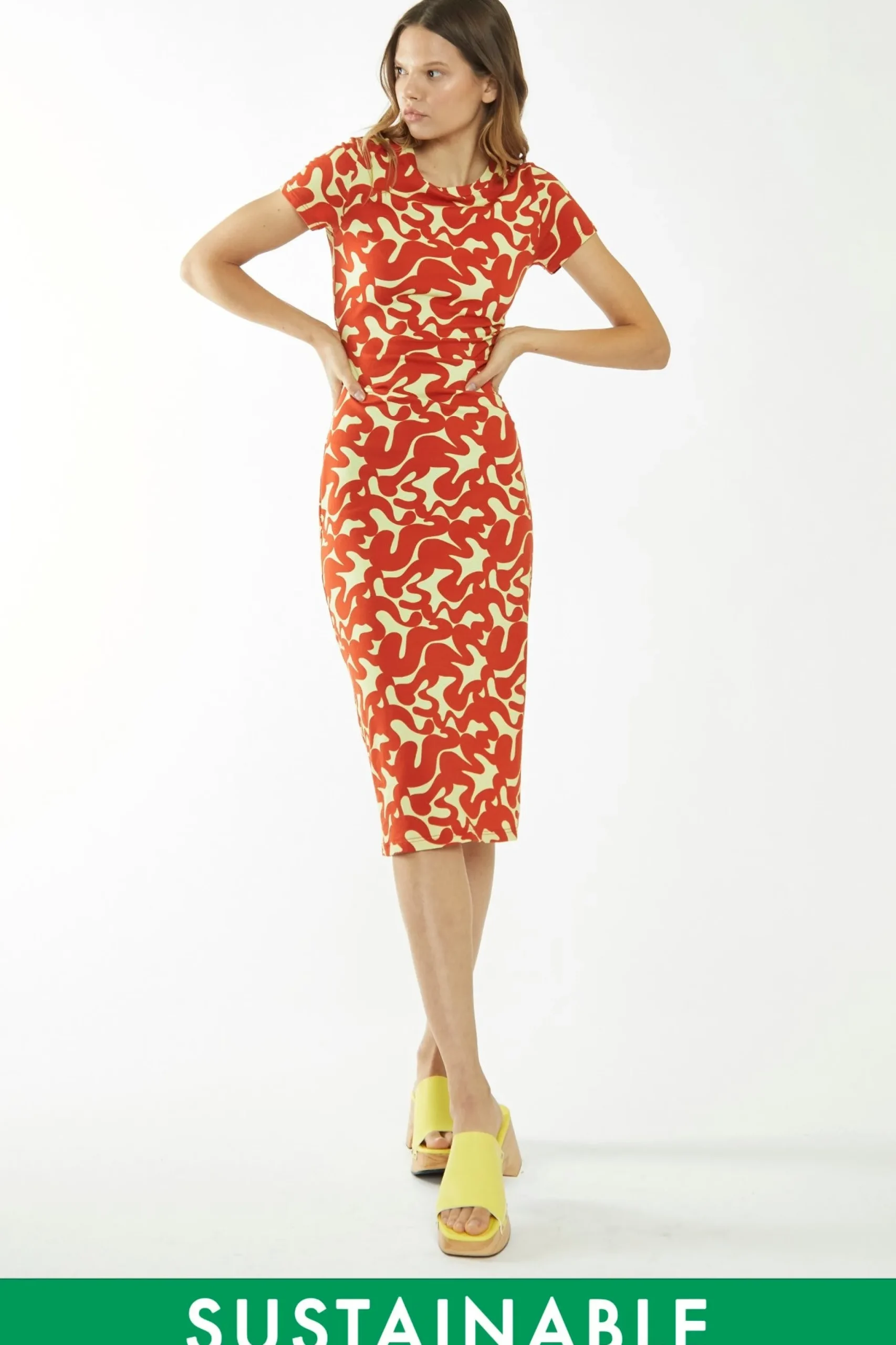 Glamorous Care Womens Banana-Orange Squiggle Jersey Midi Dress. Opt for a sustainable style with this stand out midi dress. With a bold print in a flattering midi fit, you wont regret adding this piece to your wardrobe! Elevate the look with some mule sandals for an on-trend vibe.