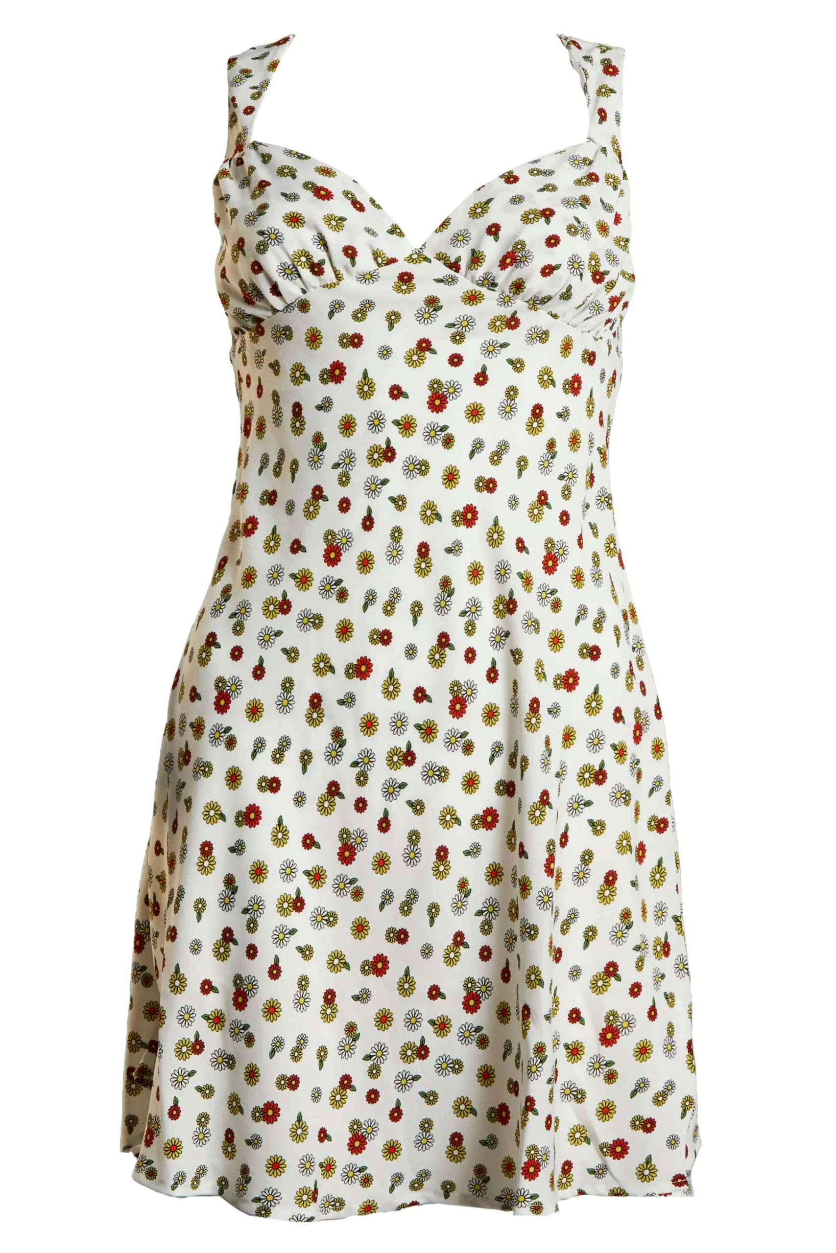 Glamorous Care White Ditsy Daisy Bias Cut Mini Dress with Wide Straps. Perfect for all occasions, this super flattering mini dress features wide straps, gathered bust details, with a bias cut fit. Make sure to pair with some chunky trainers for that chic daytime look.