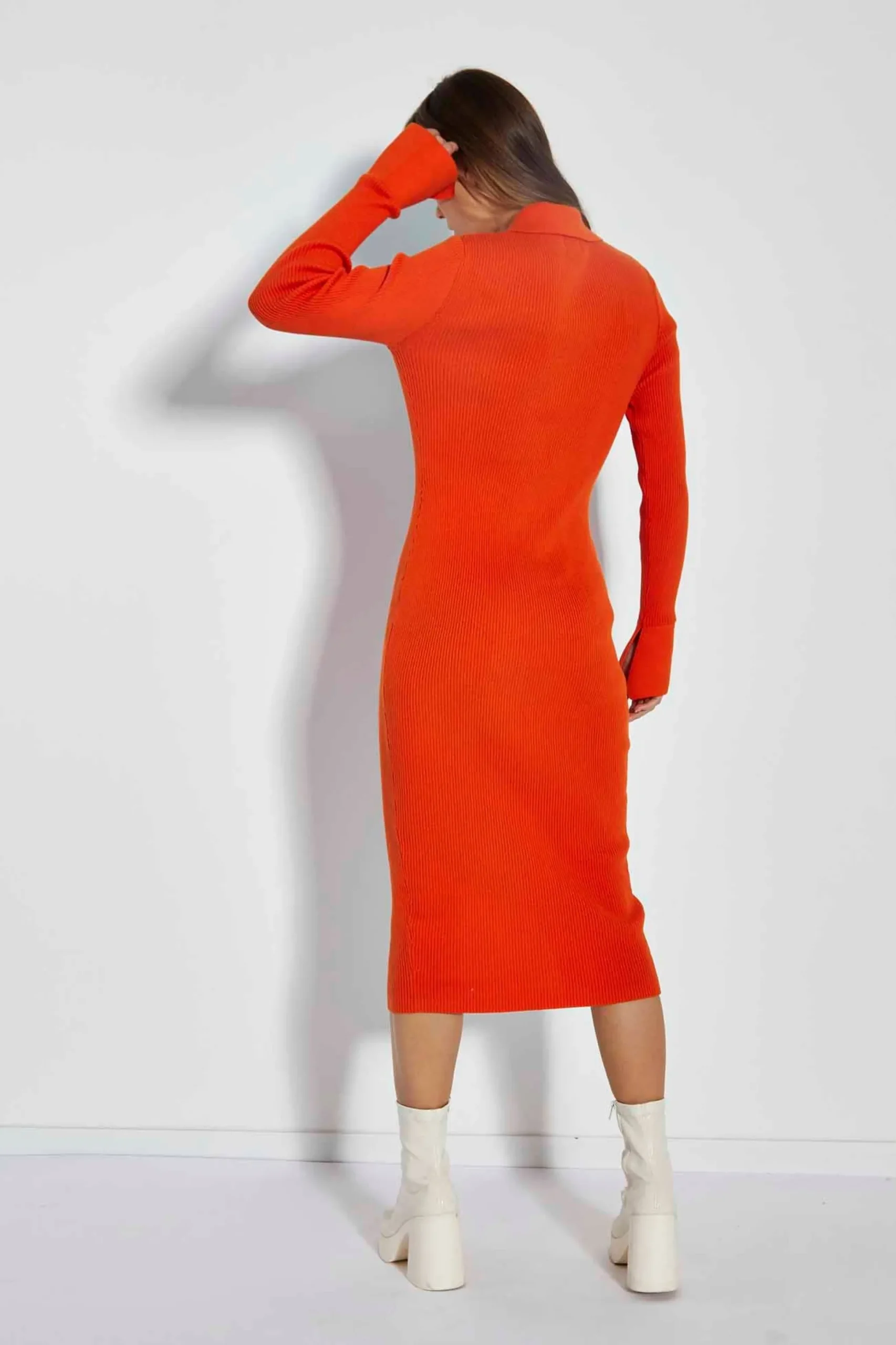 Glamorous Care Orange Button Though Midi Dress. Opt for a sustainable style with this gorgeous knitted midi dress. Featuring a button through design, with long cuffed sleeve and collar, we love this colourful piece here at Glamorous. Pair with boots for the daytime and heels for the evening!