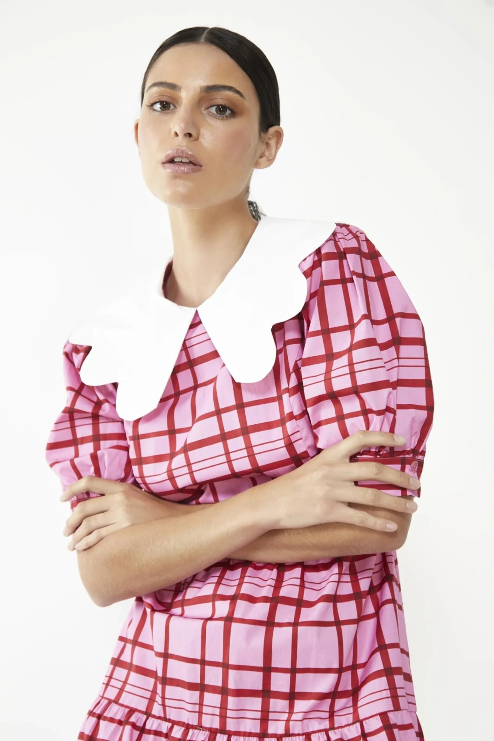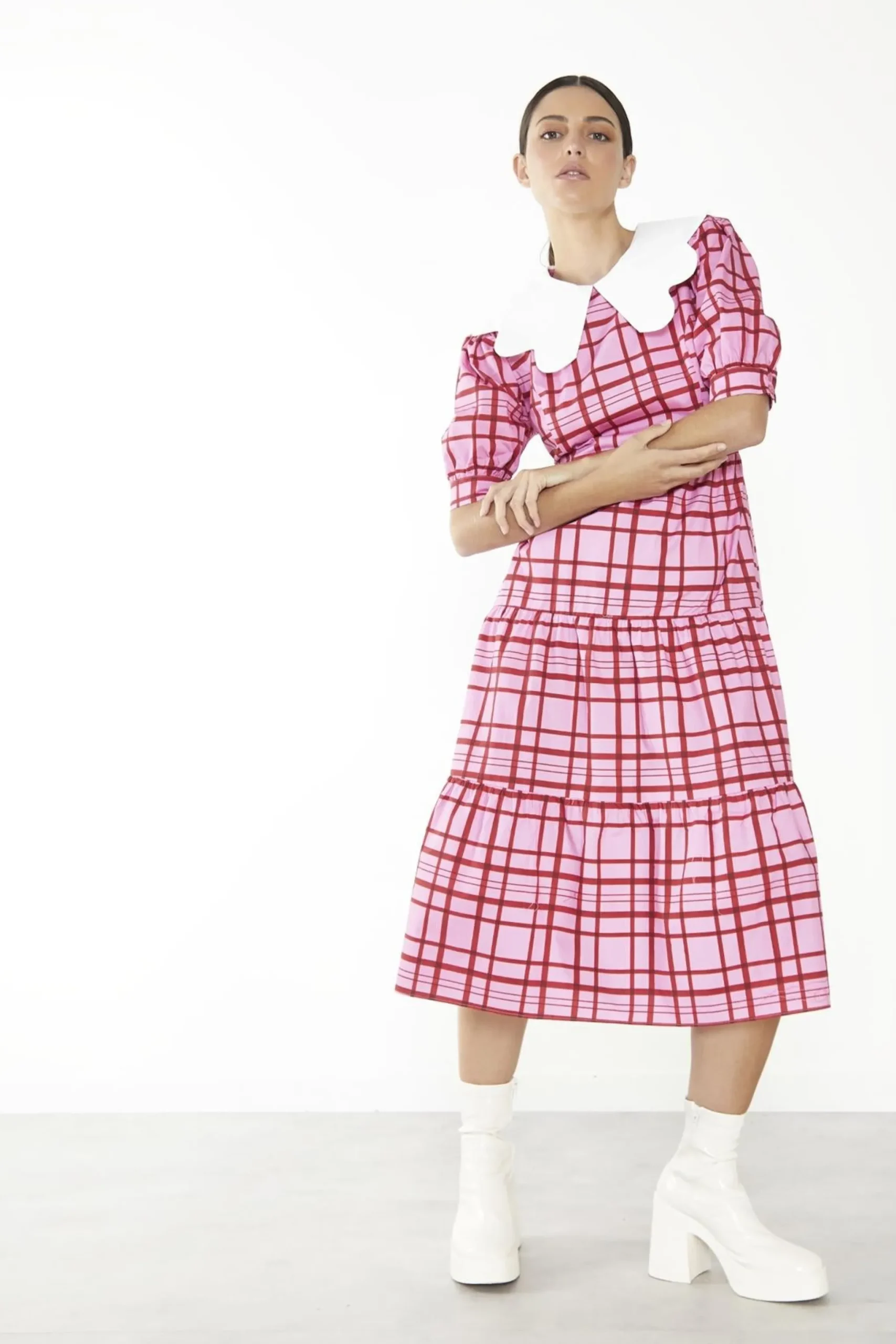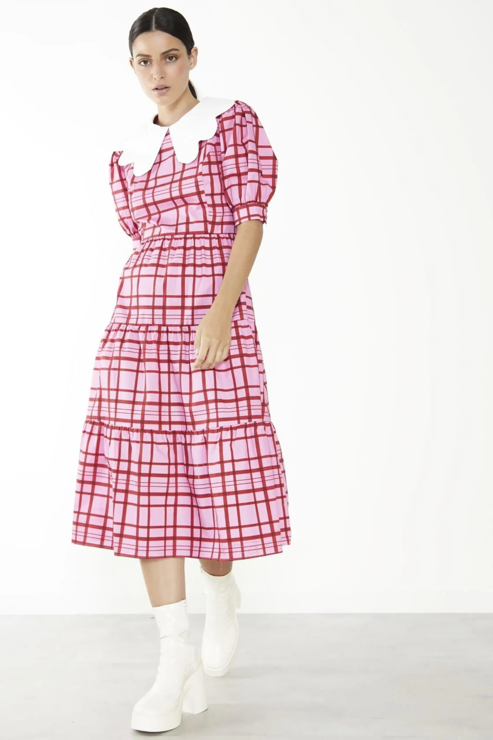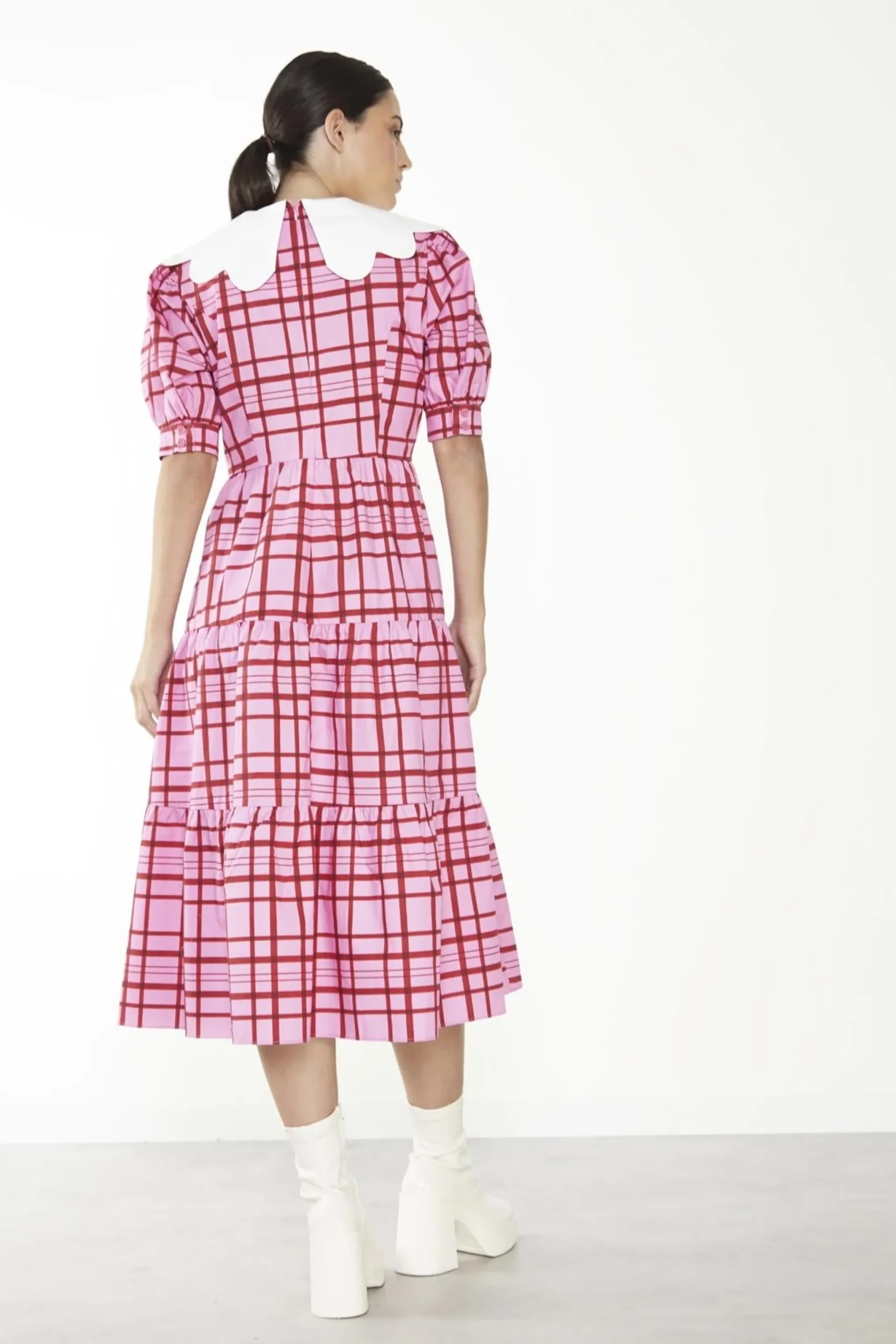 Glamorous Care Women’s Pink-Red Grid-Check Tiered Collared Midi-Dress. Embrace your inner romantic with this charming pink and red grid-check midi dress. Crafted from organic cotton, it’s a comfortable and eco-friendly choice that’s perfect for all-day wear. The oversized scalloped collar adds a playful, vintage-inspired touch, while the tiered skirt creates a flattering, flowing silhouette. The puff sleeves lend a touch of drama, balancing the midi length for a look that’s both feminine and fashion-forward. Whether you’re heading to the office or out for brunch with friends, this dress is sure to turn heads. Pair it with your favourite sneakers for a casual-cool vibe, or dress it up with heeled boots and delicate jewellery for a night out. The vibrant colour combination and classic check pattern make it a versatile piece that can be styled in countless ways. So why not add a little playfulness to your wardrobe with this charming midi dress?.