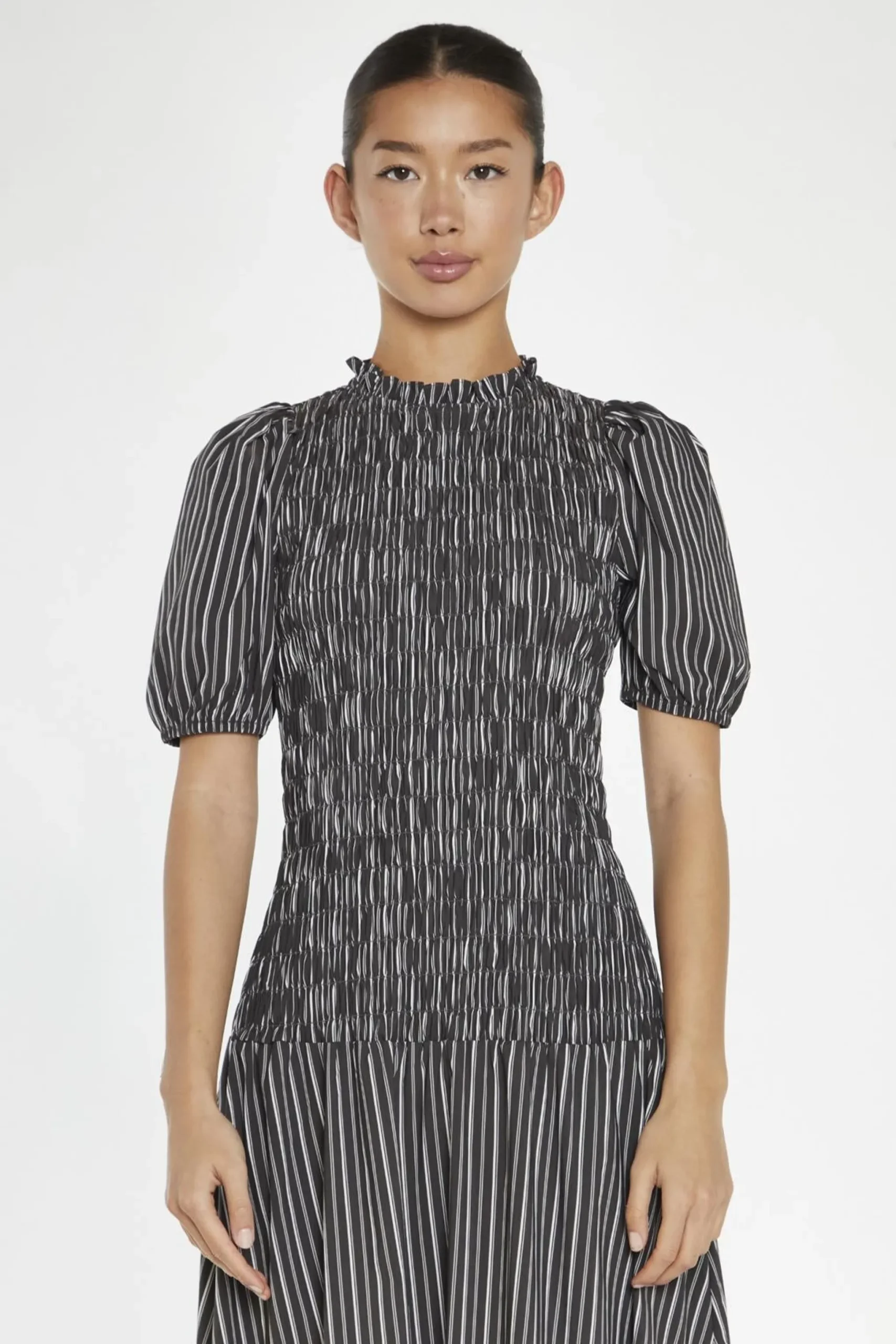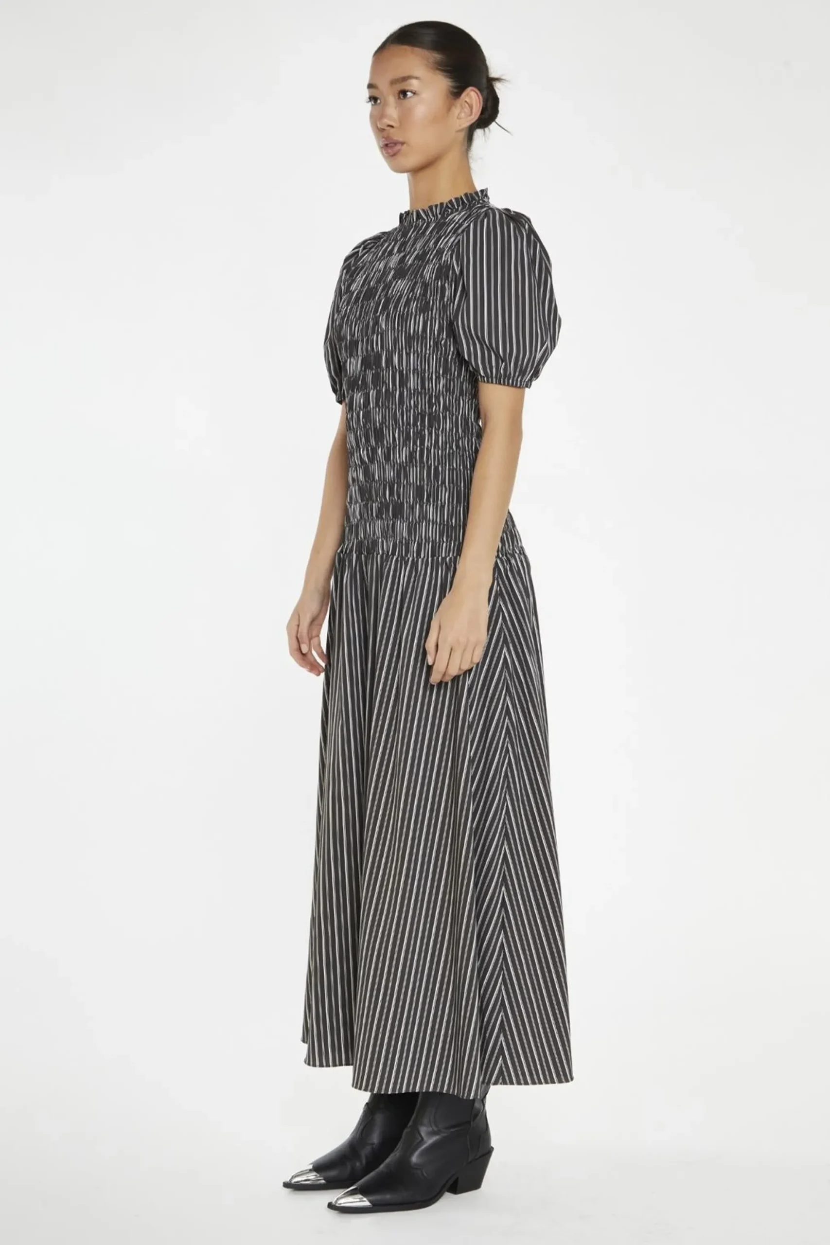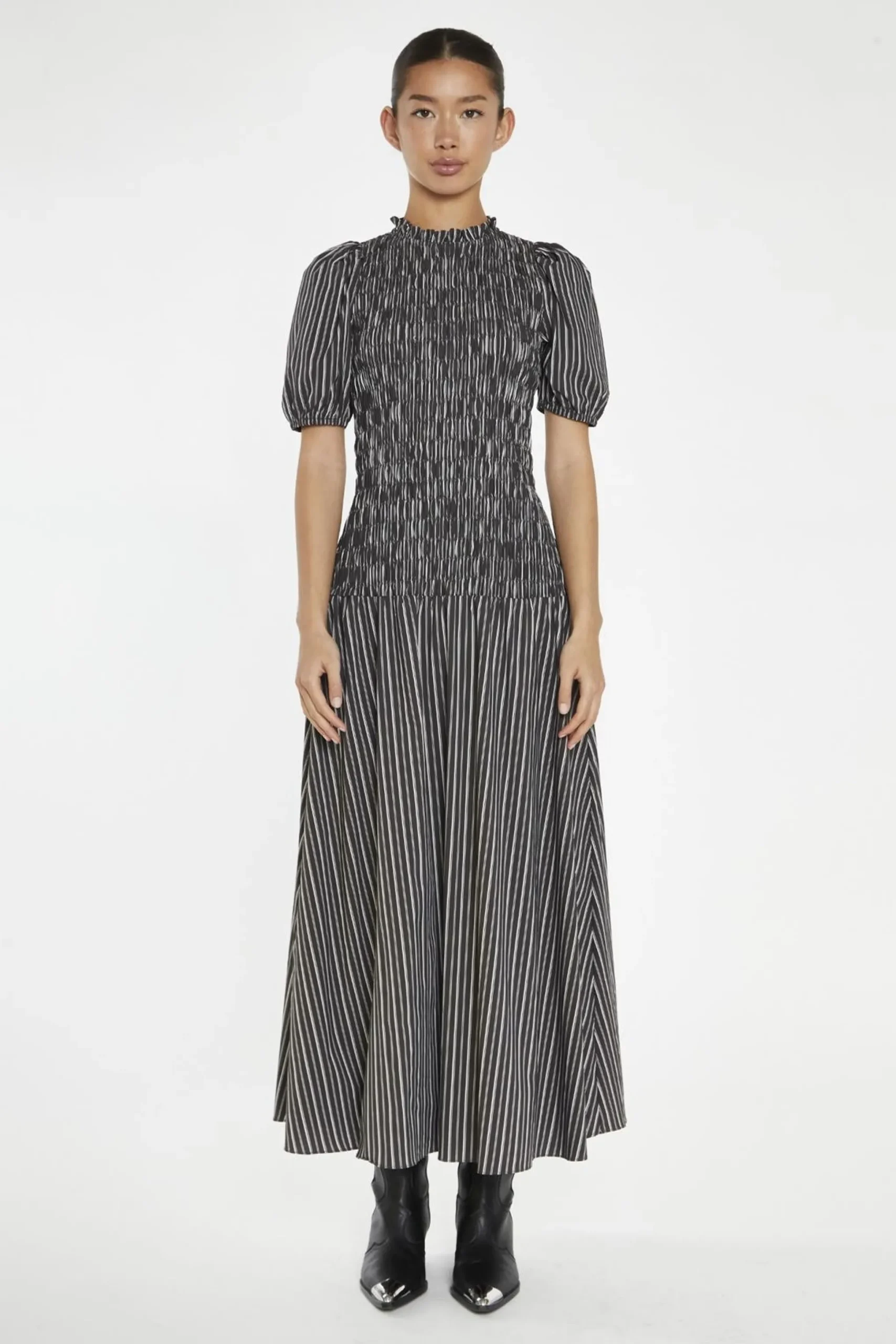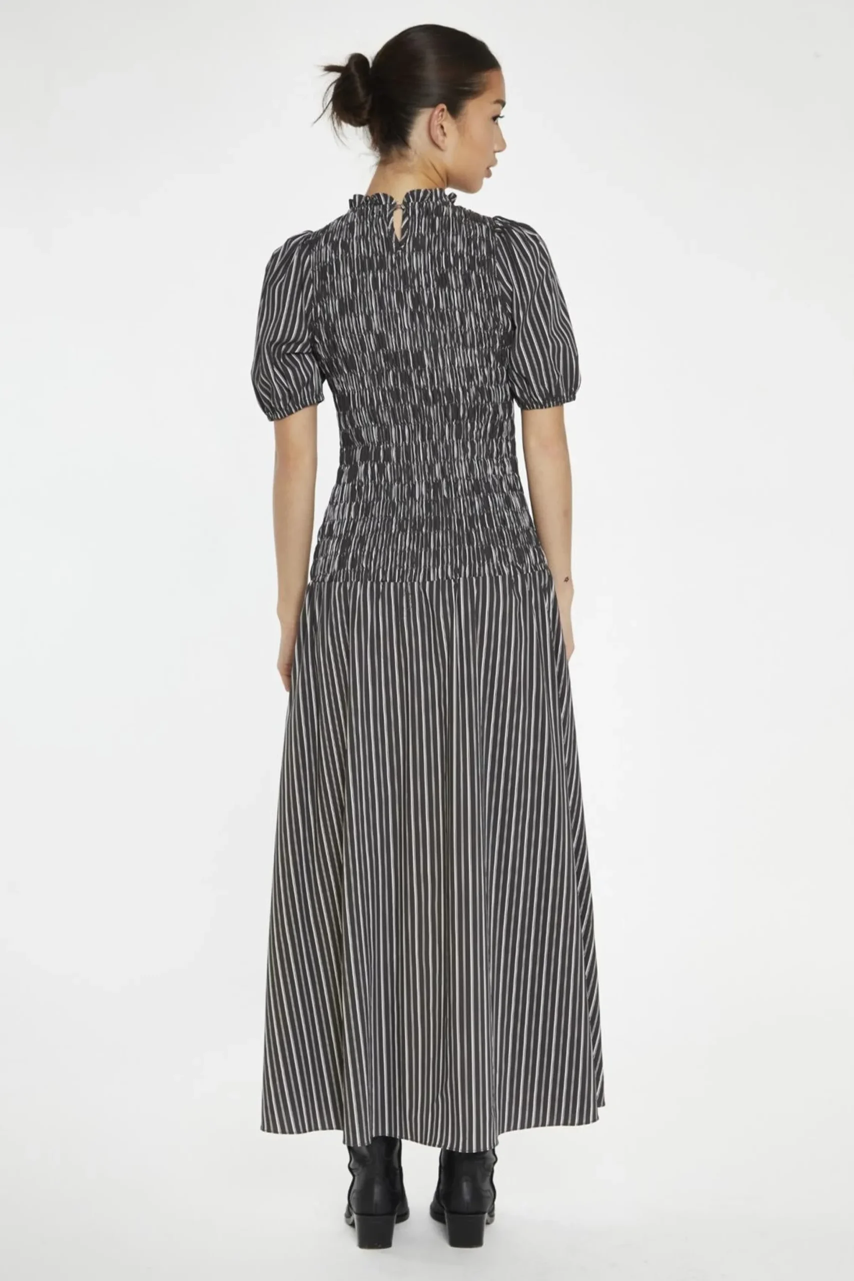 Glamorous Women’s Brown-White Stripe Shirred Bodice Maxi-Dress. This stunning maxi-dress is a must-have for your wardrobe. The shirred bodice creates a flattering, figure-hugging silhouette, while the dropped waist and high neckline add a touch of elegance. The puff sleeves lend a romantic flair, and the maxi length ensures you’ll feel comfortable and confident all day long. The brown and white striped pattern adds a timeless, versatile appeal that can be dressed up or down. Whether you’re attending a special event or simply running errands, this dress is sure to turn heads and make you feel your best.