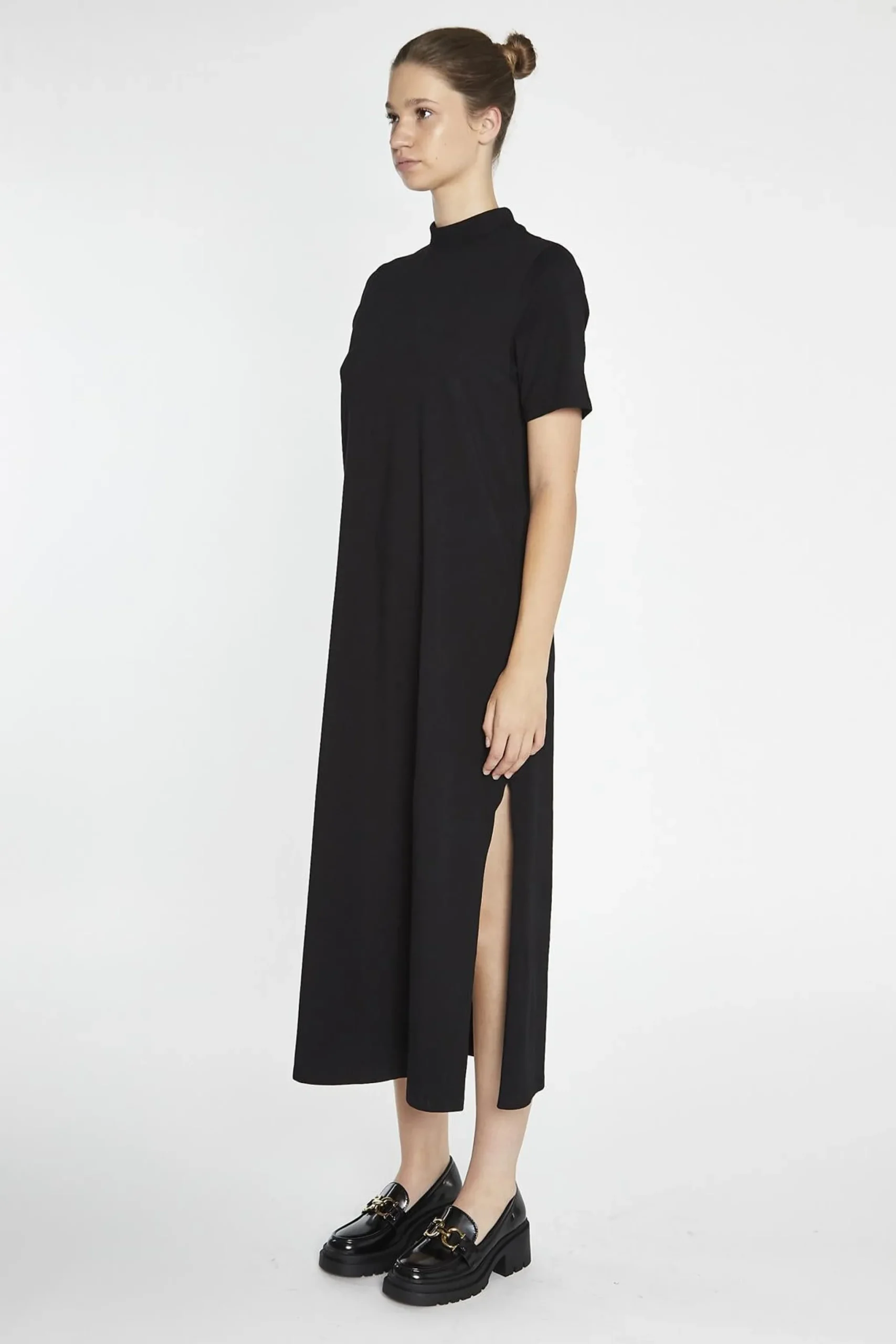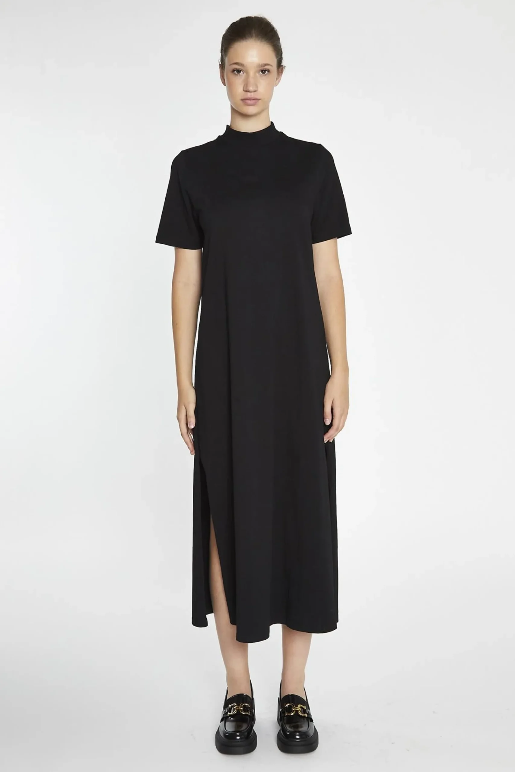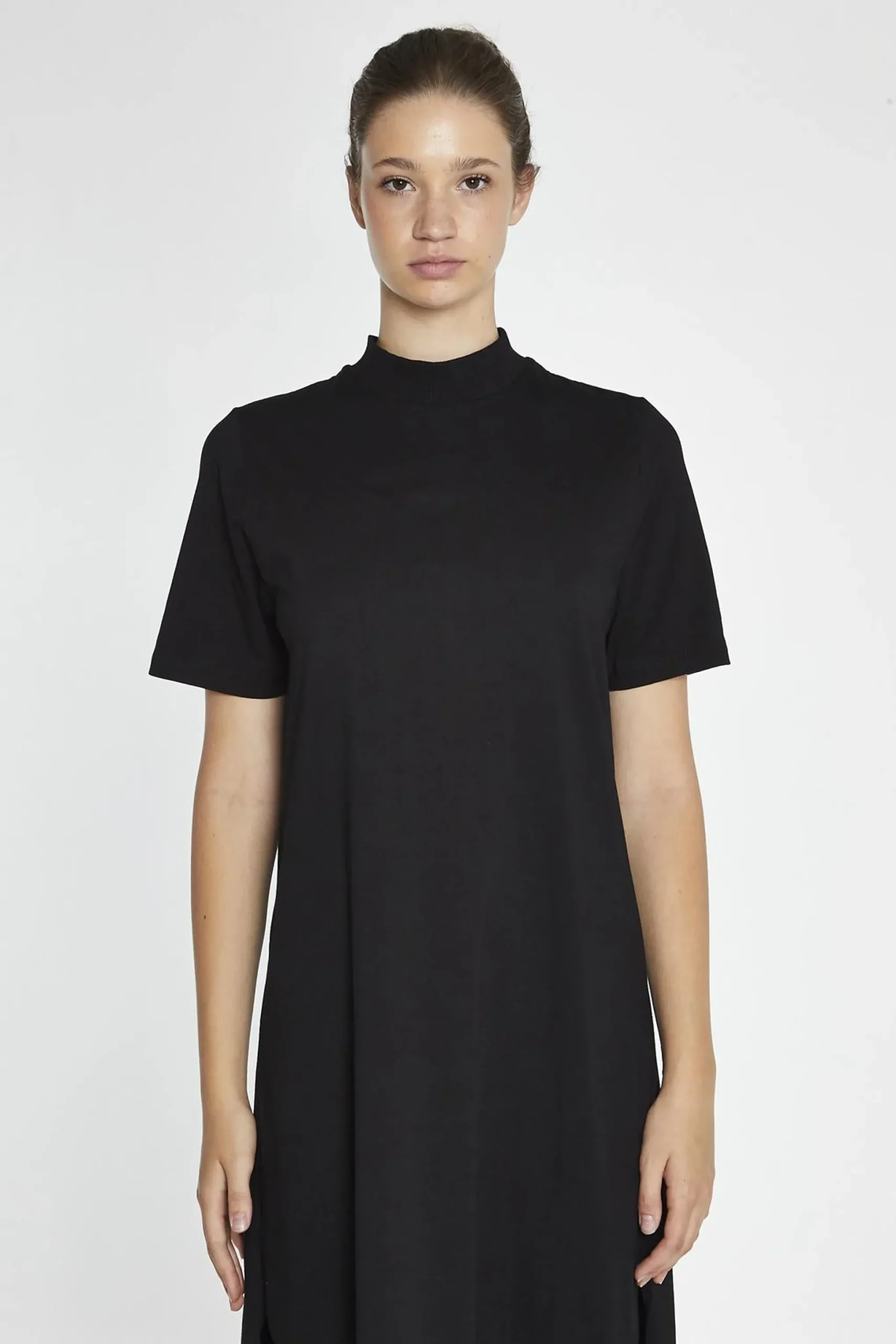 Glamorous Women’s Black High-Neck T-Shirt Midi-Dress. Looking for a wardrobe staple that’s both comfortable and stylish? Check out this black high-neck t-shirt midi dress. The high neckline creates a flattering, modest silhouette that’s perfect for everyday wear. The t-shirt dress silhouette is both relaxed and versatile, making it easy to dress up or down. The side split adds a touch of modern flair, while the midi length hits that sweet spot between short and long. Pair this dress with sneakers and a denim jacket for a casual-cool vibe, or dress it up with heeled ankle boots and a statement necklace for a night out. The soft, stretchy fabric ensures you’ll feel comfortable all day long, while the classic black colour makes it easy to mix and match with your favourite accessories. This dress is all about effortless style and comfort – so why not add it to your wardrobe?.