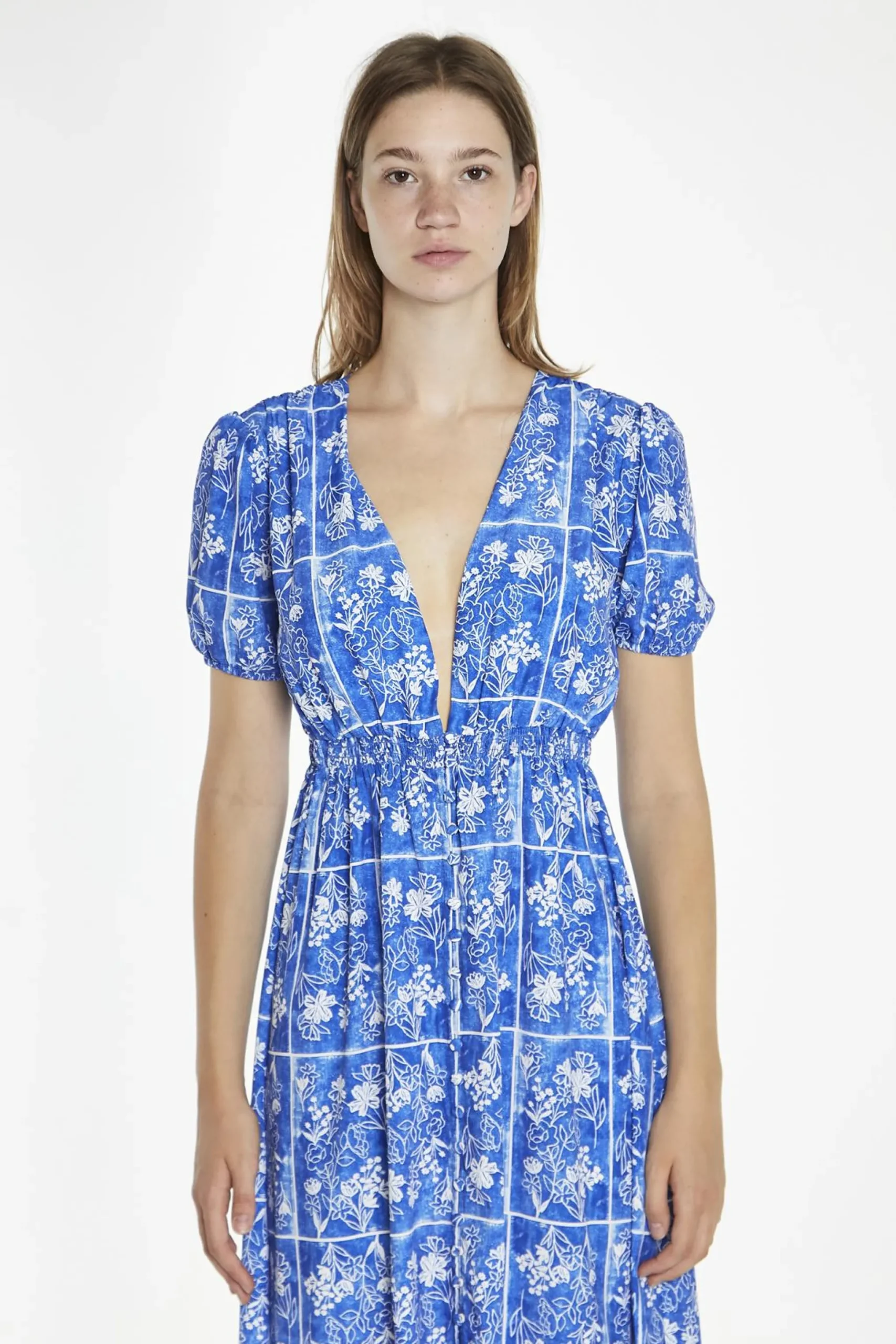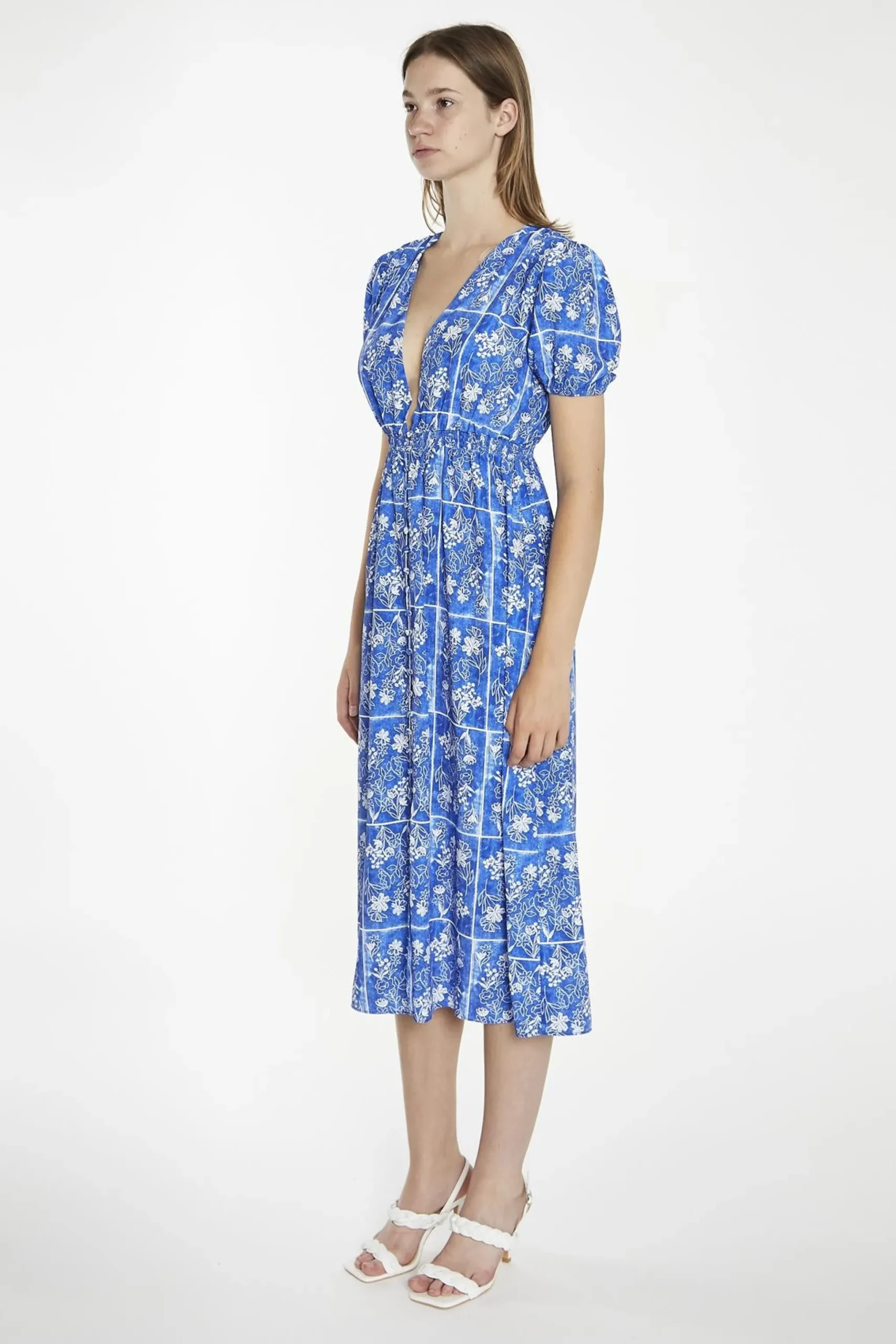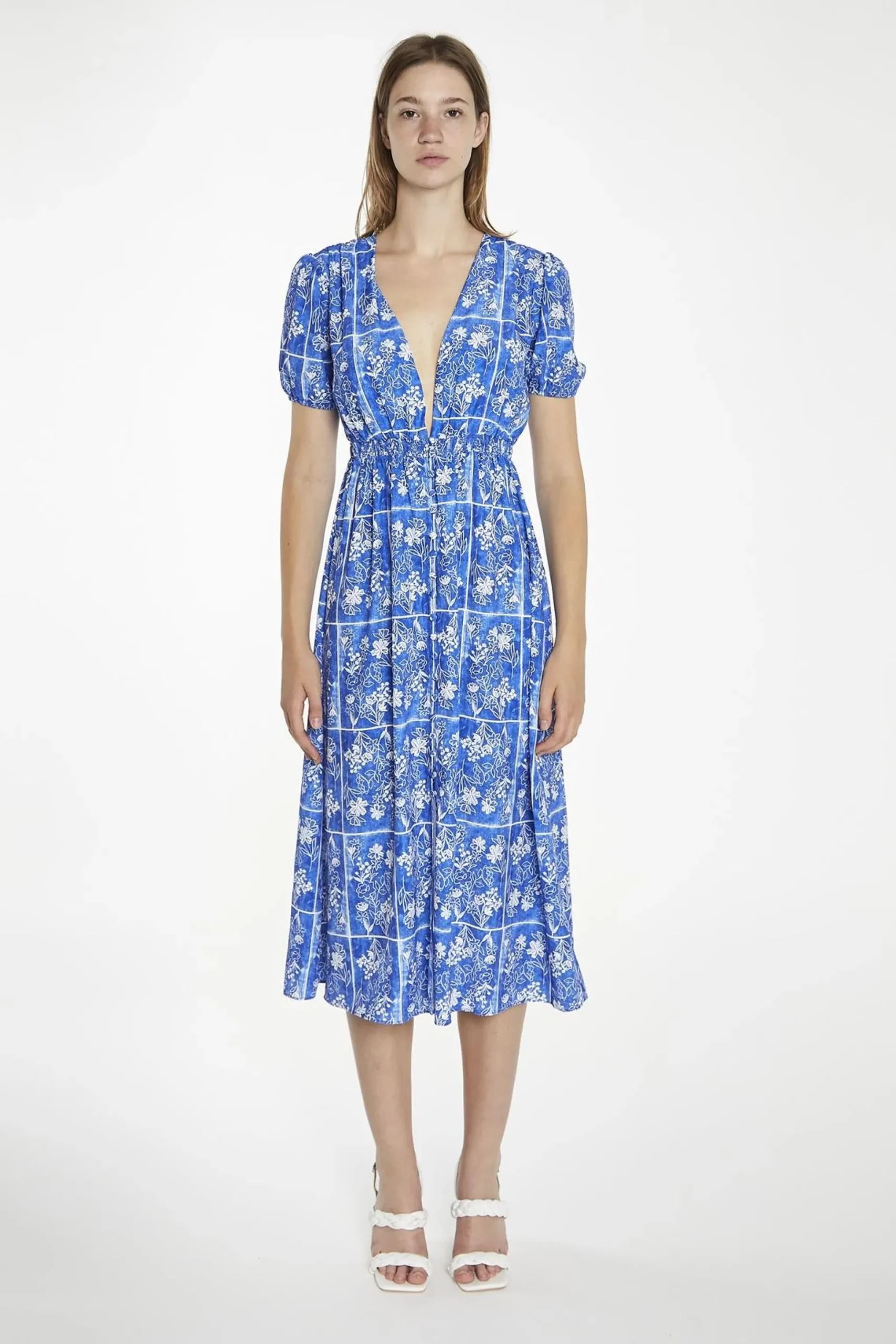 Glamorous Blue-Tile Button-Front Midaxi-Dress. Add a touch of charm to your wardrobe with our Blue-Tile Button-Front Midaxi-Dress. This delightful dress features a midaxi length, striking the perfect balance between midi and maxi for a versatile and elegant look. The button front adds a classic touch, making it easy to slip on and off while adding a bit of vintage flair. The deep V-neckline offers a flattering silhouette, perfect for showcasing your favourite necklace. Puff sleeves bring a playful and feminine element to the design, while the elasticated waistband ensures a comfortable and flexible fit that accentuates your waist. The blue-tile pattern adds a unique and eye-catching detail, making this dress a standout piece. Pair it with sandals for a casual day out or dress it up with heels for a special occasion. The lightweight fabric keeps you cool and comfortable, making it an ideal choice for warm weather. Enjoy the effortless style and comfort of this Blue-Tile Button-Front Midaxi-Dress, designed to make you feel confident and chic no matter where your day takes you..