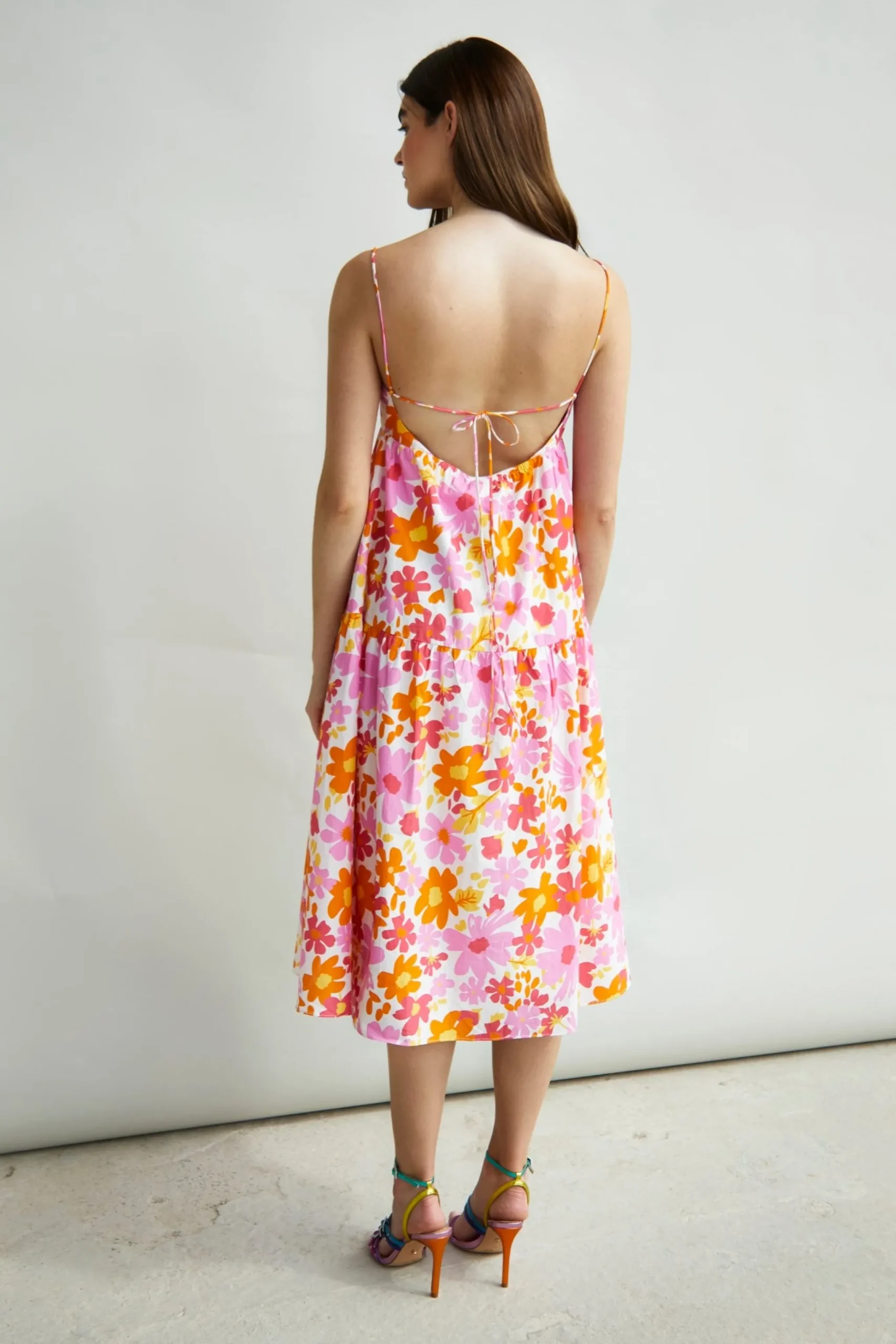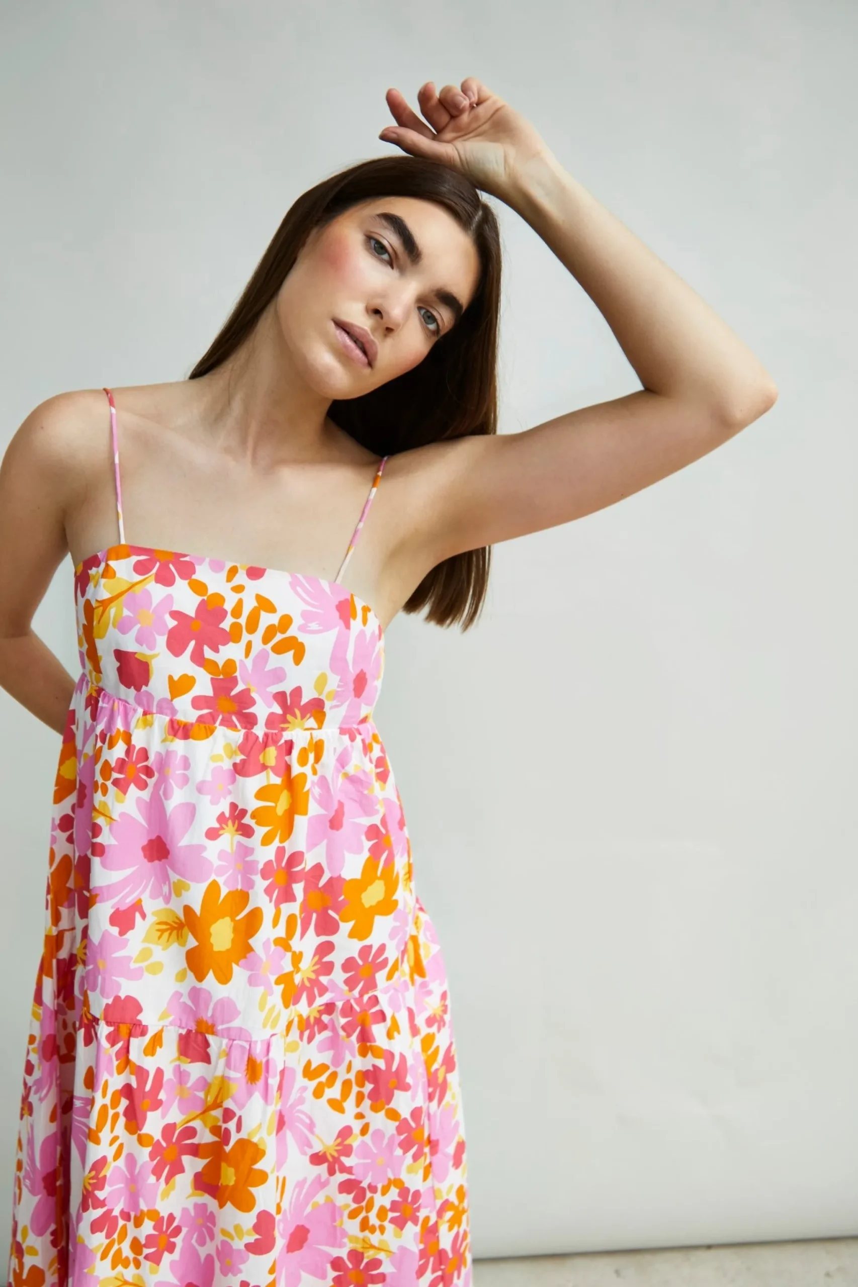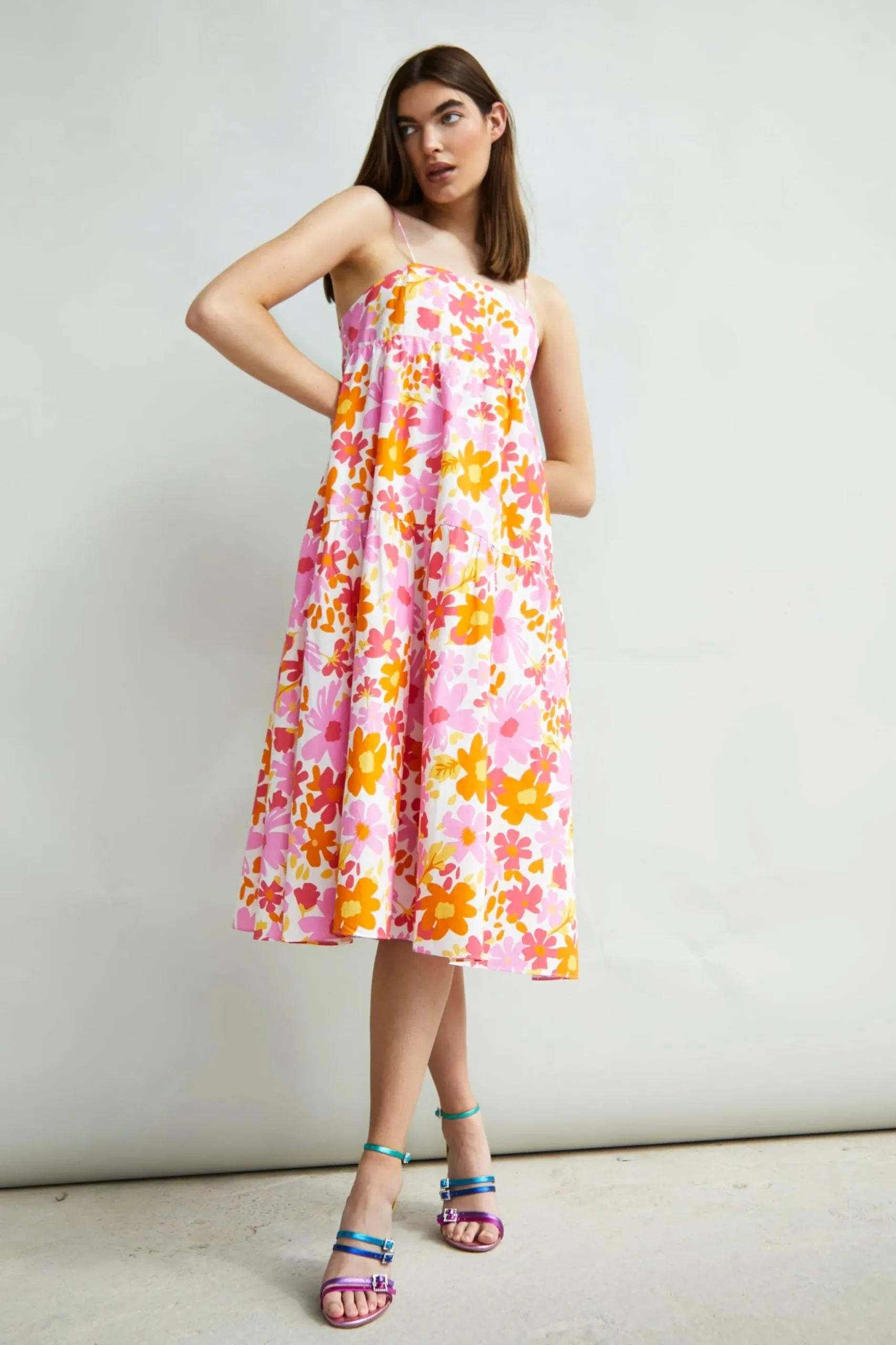 Glamorous Collection Pink Bright Floral Strappy Empire Line Midi Dress. Stylish and chic, we cant get enough of this new season floral print. This super flattering midi dress features an empire line fit, gathered tiers and strappy tie back details. Looks fab paired with some cute heeled sandals for an ultimate stylish look!