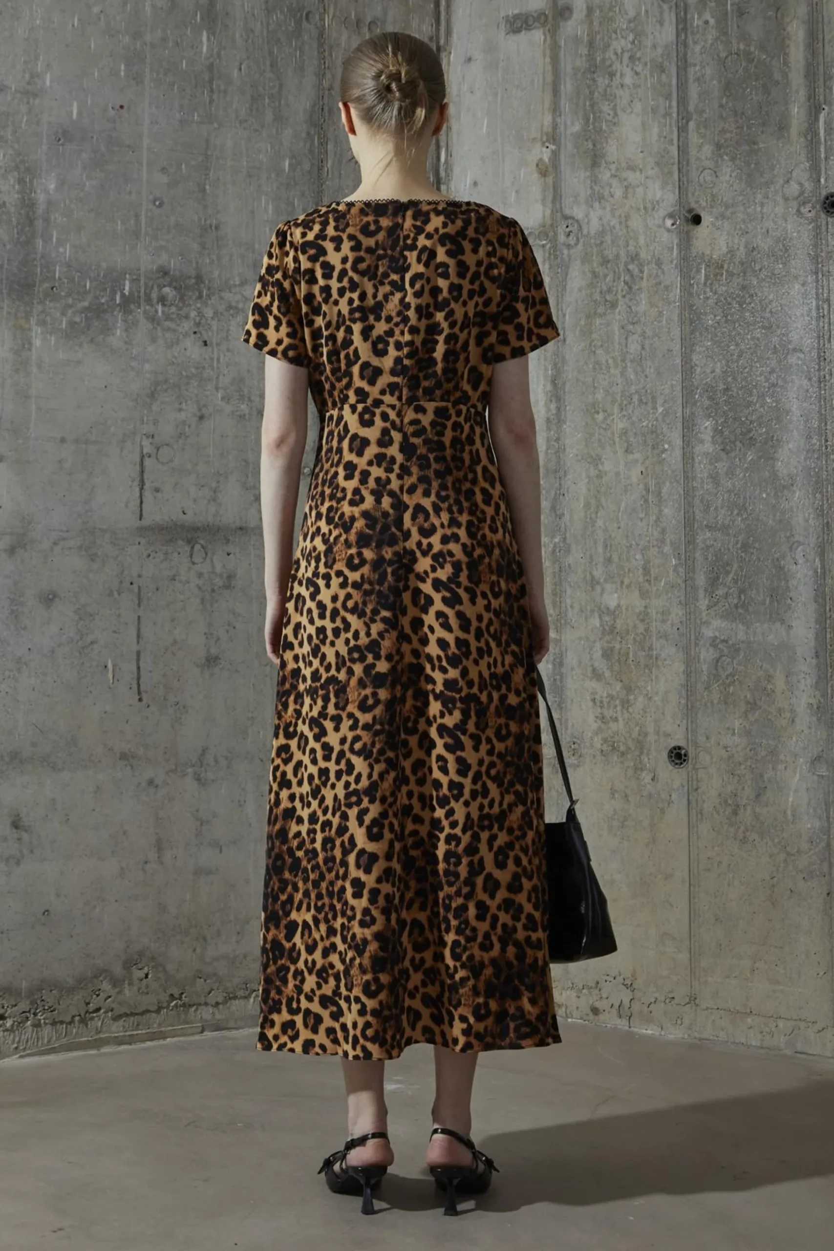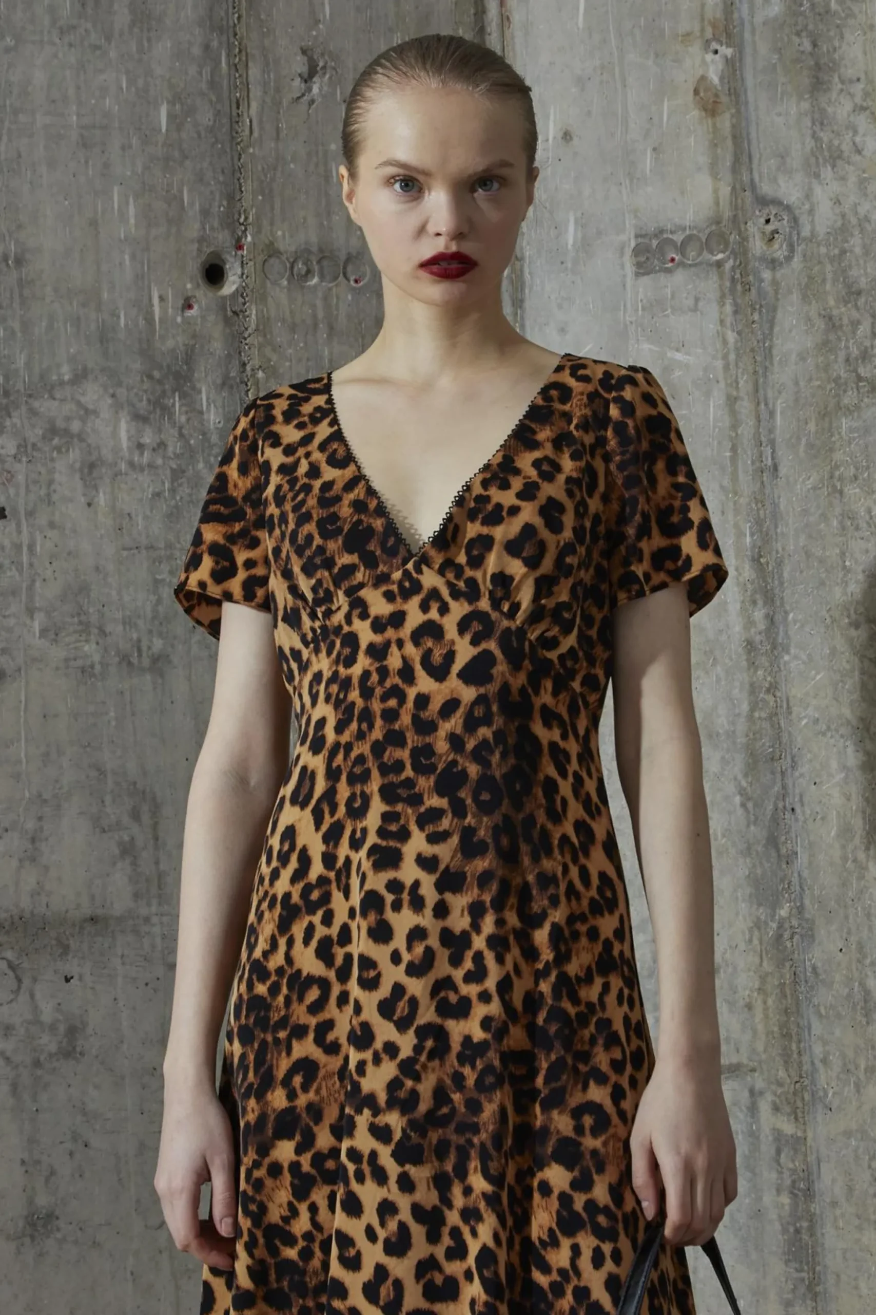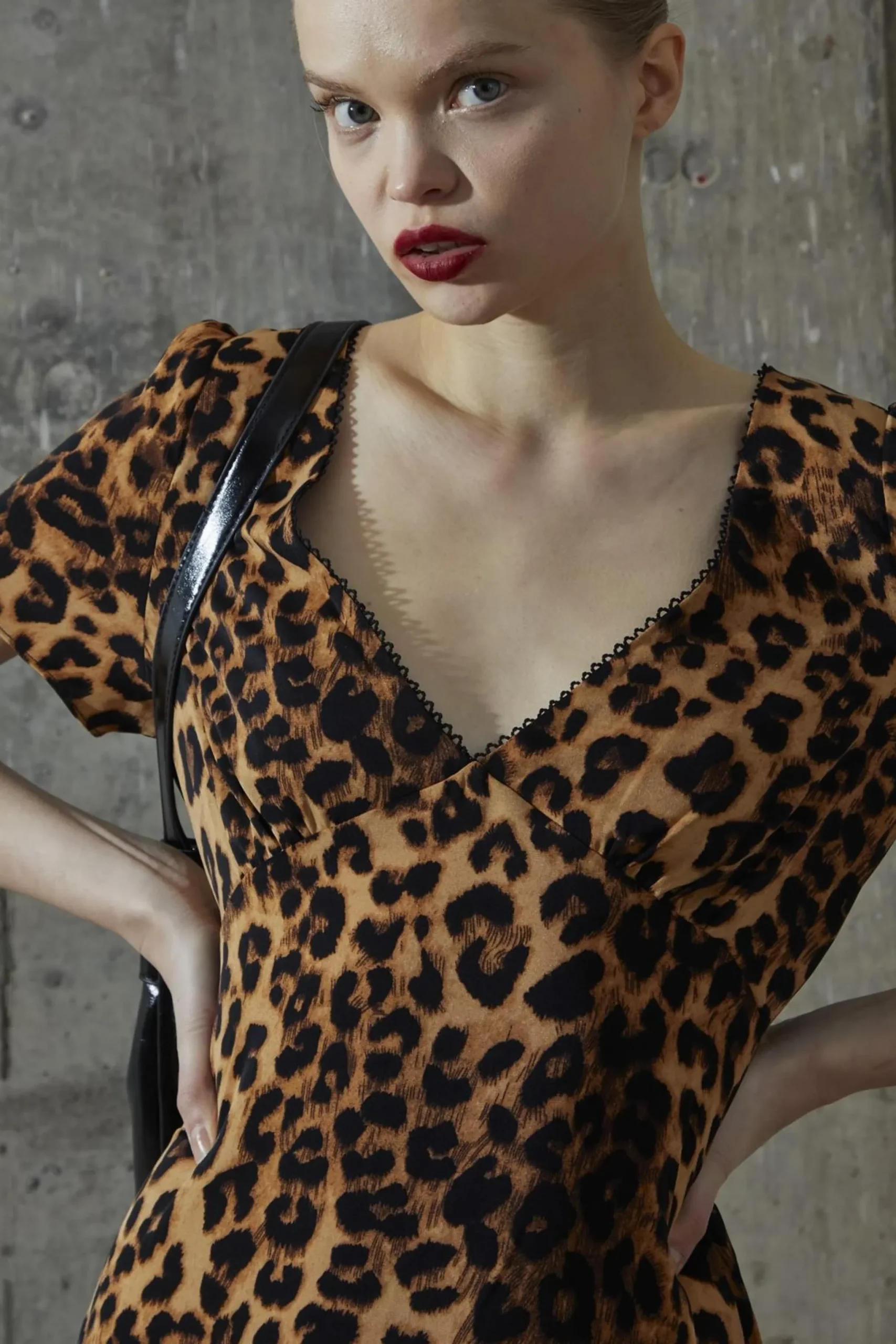 Glamorous Women’s Leopard V-neck Midi-Dress. Embrace your inner fashionista with our Leopard V-neck Midi-Dress! This classic tea dress shape flatters every figure, while the V-neck adds a touch of allure. The lace trim detailing adds a feminine flair, and the midi length is perfect for any occasion. Whether you’re attending a garden party or a night out with friends, this dress is sure to turn heads. Made with high-quality materials, this dress is both comfortable and stylish. Pair it with your favourite heels or boots for a complete look. Get ready to make a statement in this must-have piece!