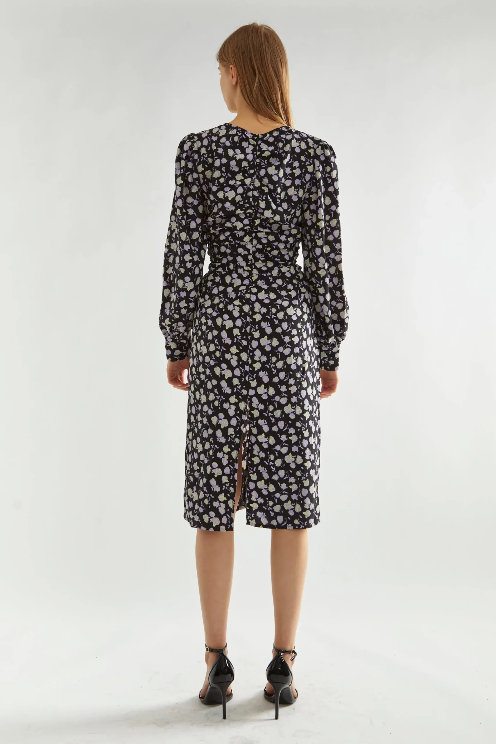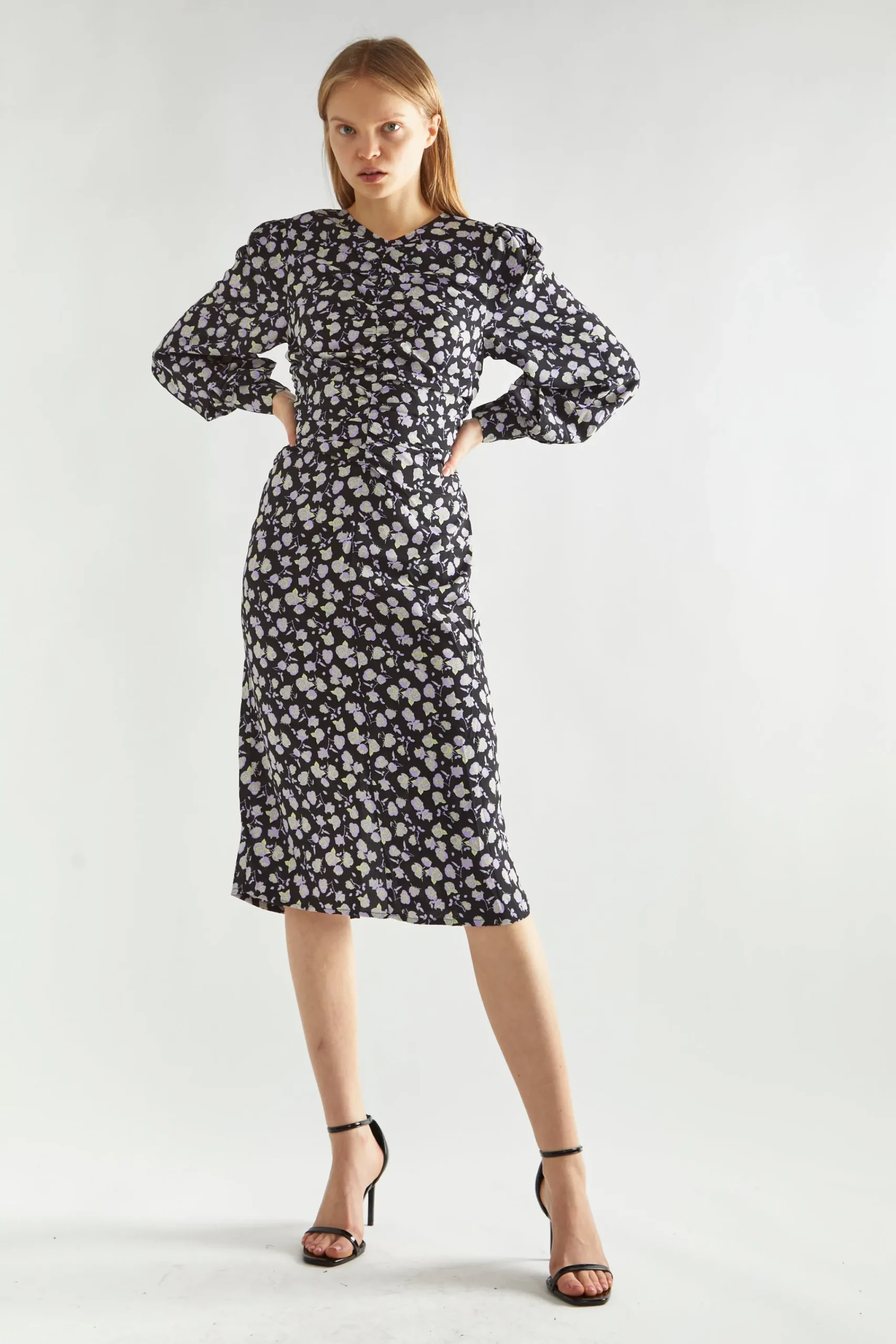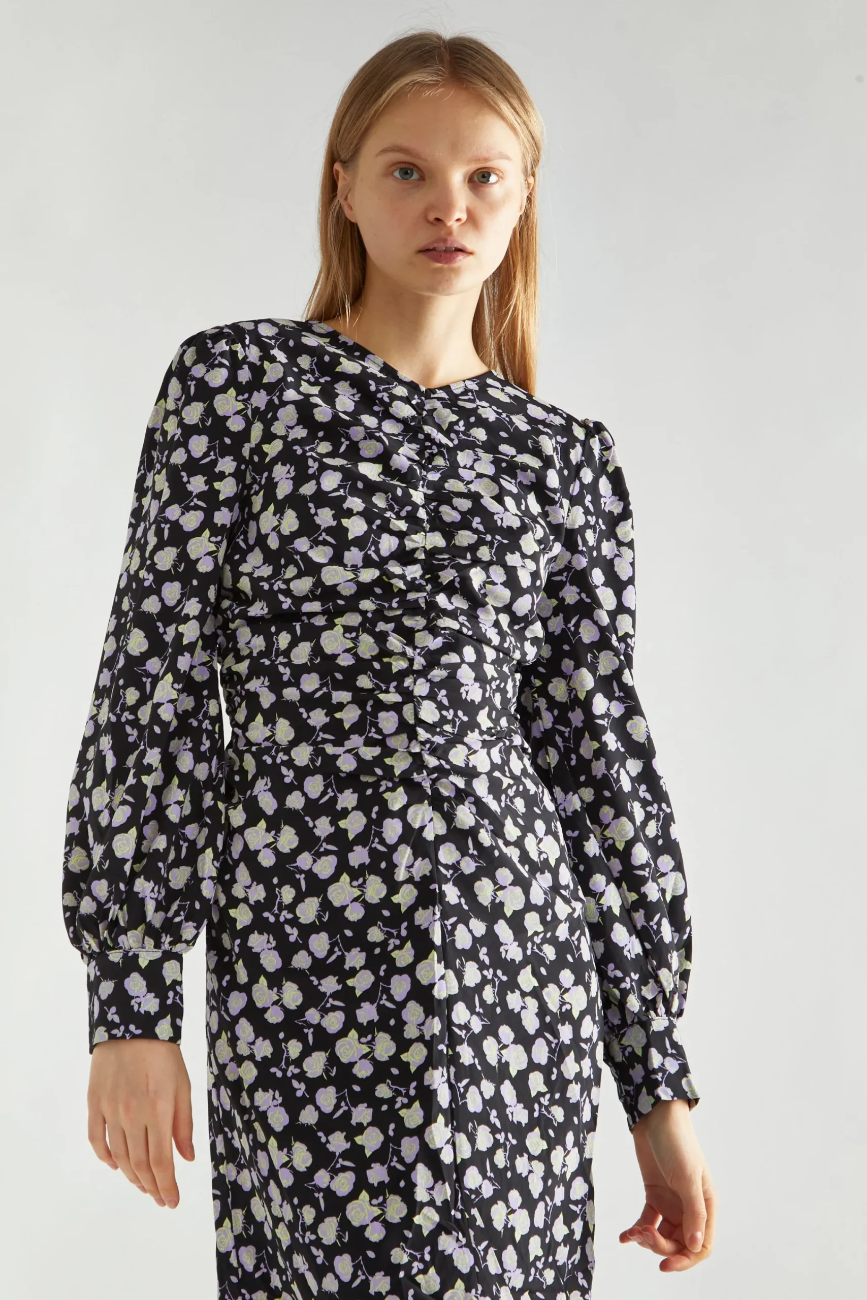 Glamorous Women’s Lilac-Rose Ruched-Front Midi-Dress. Get ready to turn heads with our Lilac-Rose Ruched-Front Midi-Dress. This dress is a must-have for any fashion-forward individual. The playful ruched front design adds a touch of quirkiness to this elegant midi-length dress, making it perfect for any occasion (or photo op). Plus, the long sleeves provide versatility and comfort. Be ready to turn heads and make a statement with this one-of-a-kind dress.