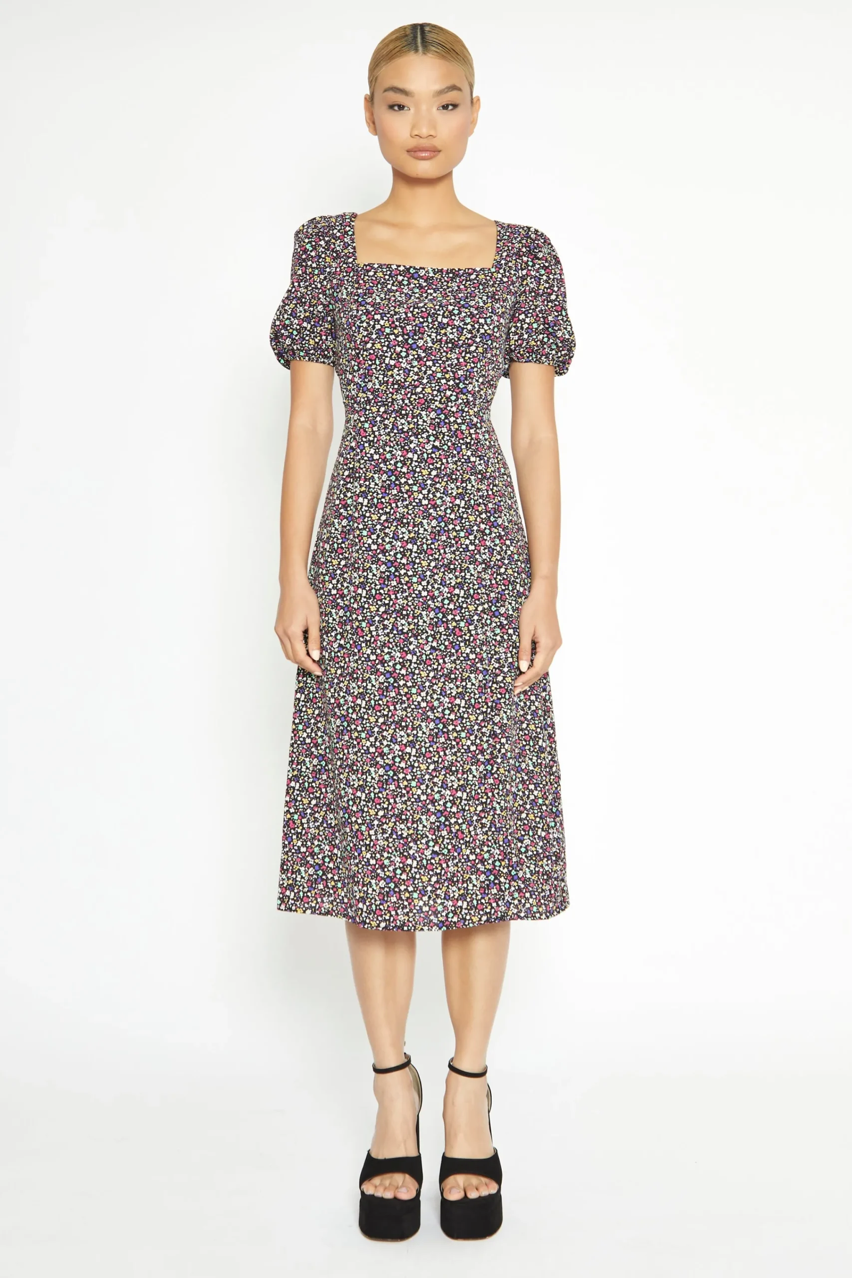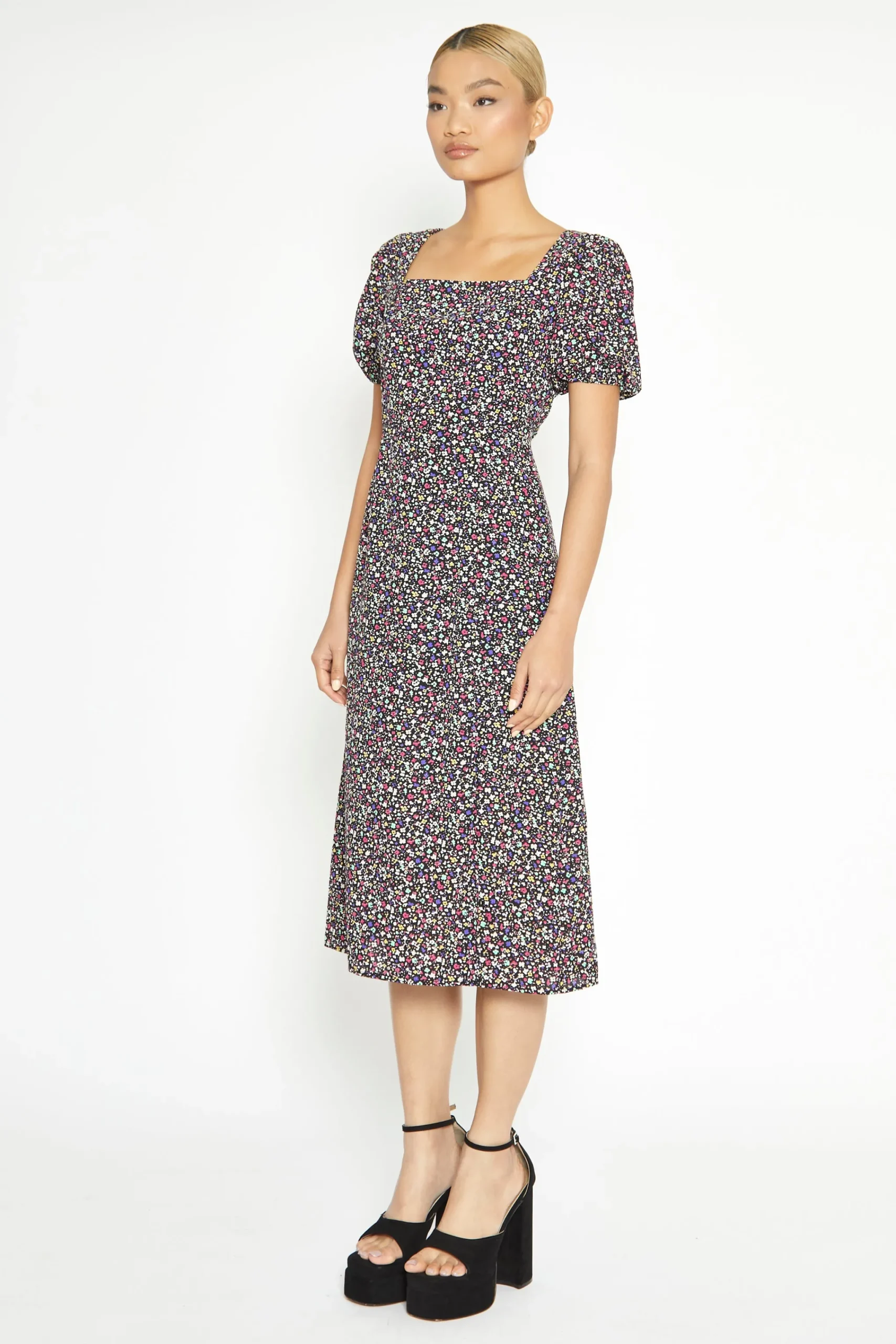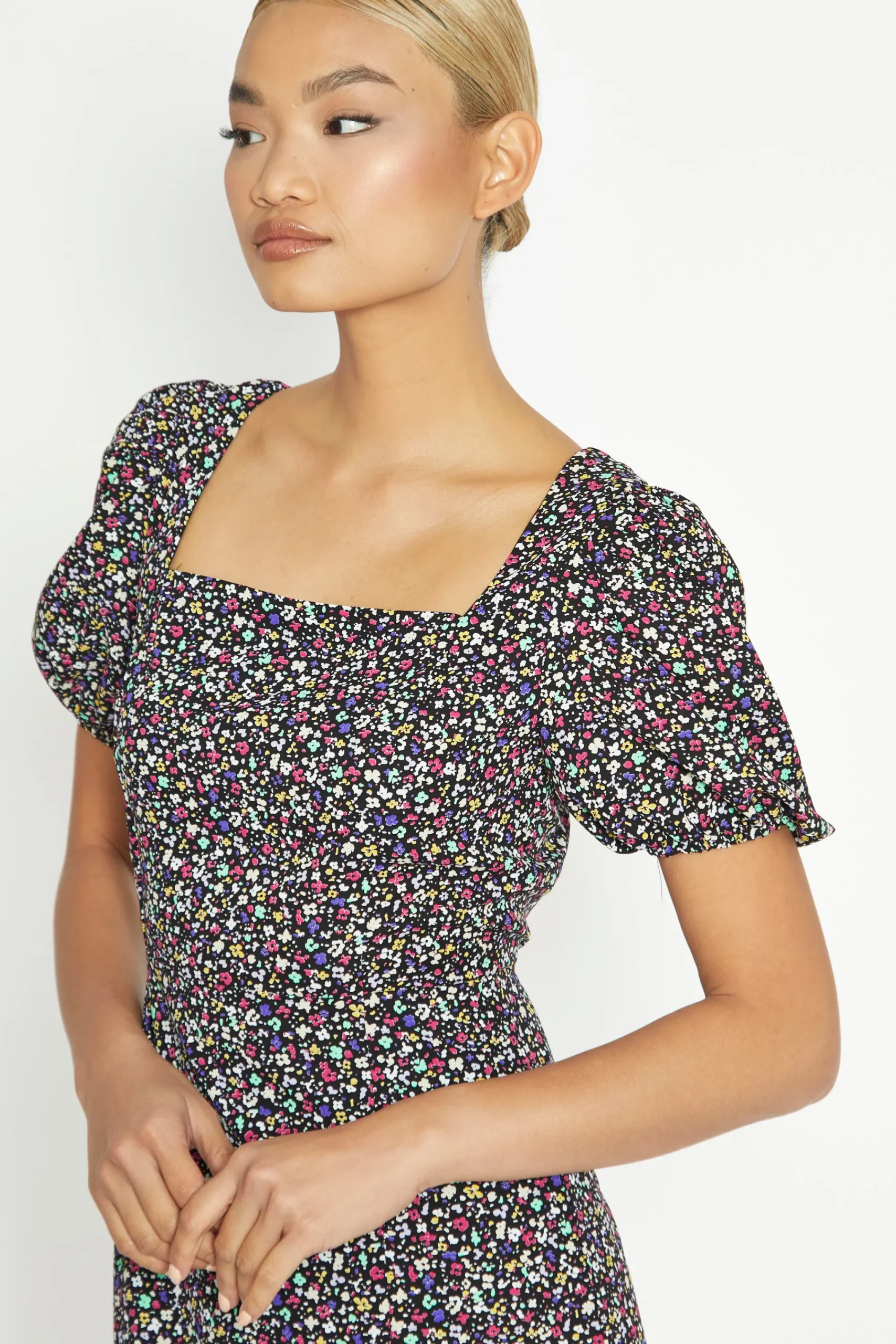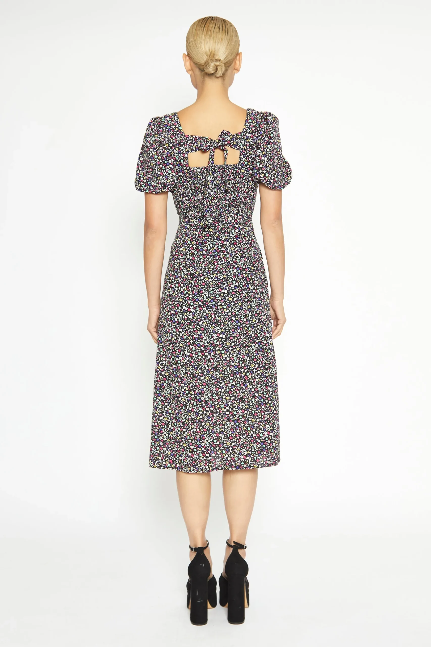 Glamorous Multi Splodge Floral Tie Back Midi Dress. Fashion forward and feminine, this floral print midi dress is the perfect daytime look. Featuring a square neckline line, front side split, a shirred back panel and a statement back tie, we love this piece here at Glamorous. Style with chunky boots for the daytimes and heels for the evening!