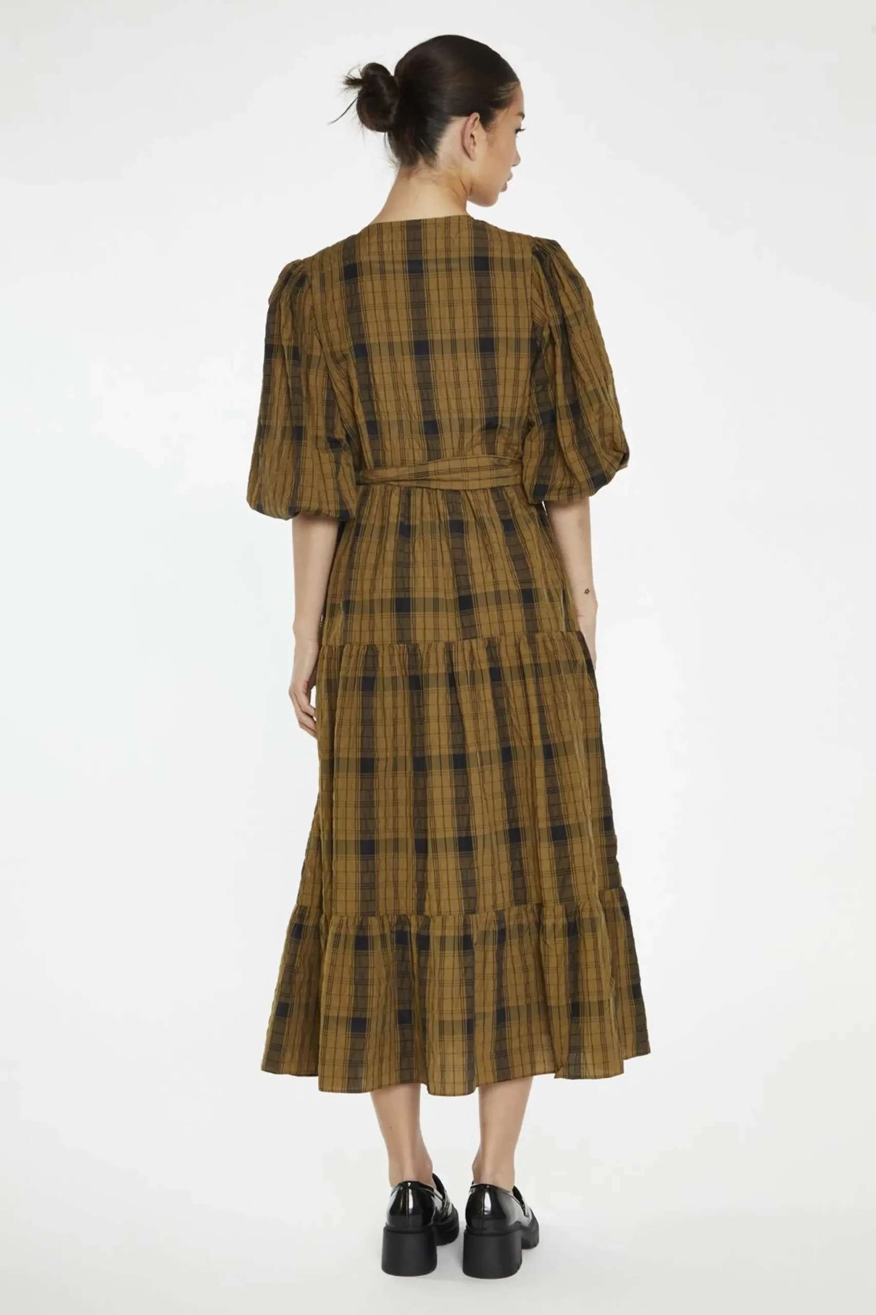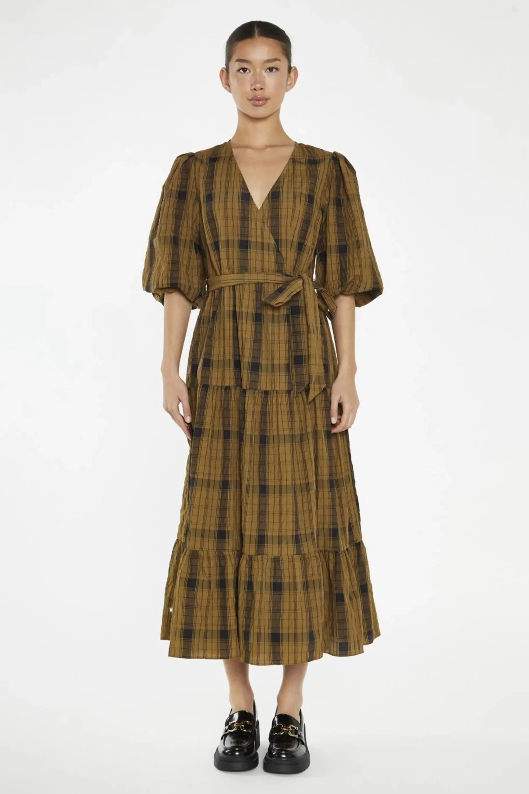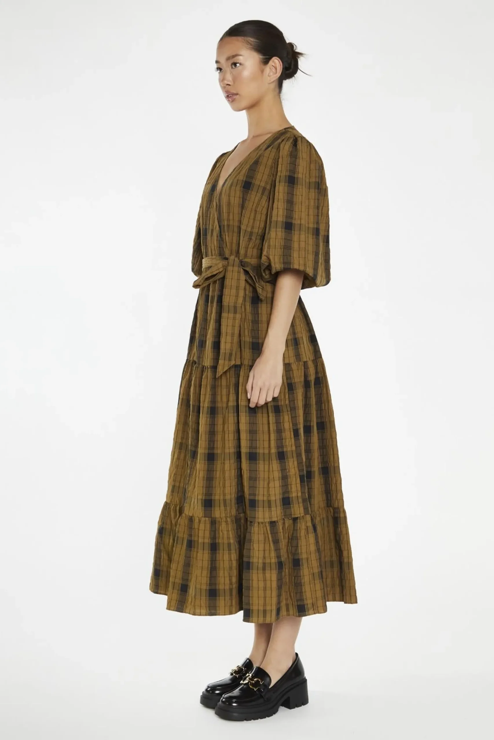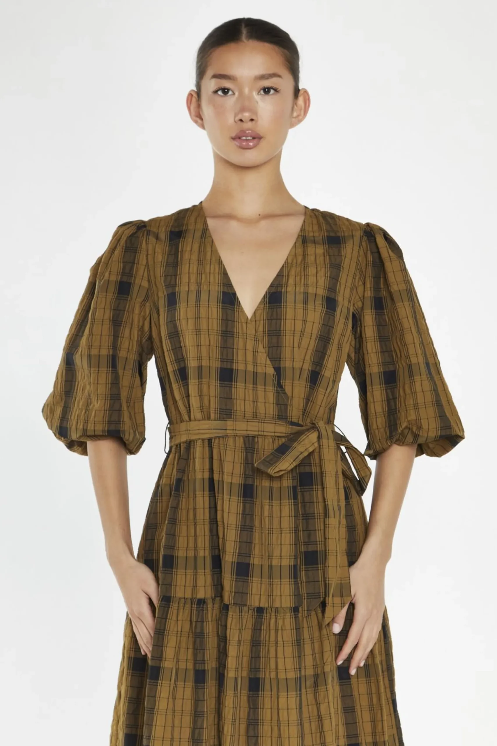 Glamorous Women’s Olive-Check Wrap Midi-Dress. The Olive-Check Wrap Midi-Dress is a stylish and comfortable option for any occasion. The wrap design flatters your figure, while the tiered skirt adds a touch of playfulness. The puff sleeves provide a feminine flair, and the waist tie allows you to customize the fit. The midi length is versatile, making it easy to dress up or down. Crafted from a soft, breathable fabric, this dress is perfect for all-day wear. Pair it with your favourite boots for a casual look, or dress it up with heels for a night out. No matter how you style it, you’re sure to feel confident and comfortable in this versatile piece.