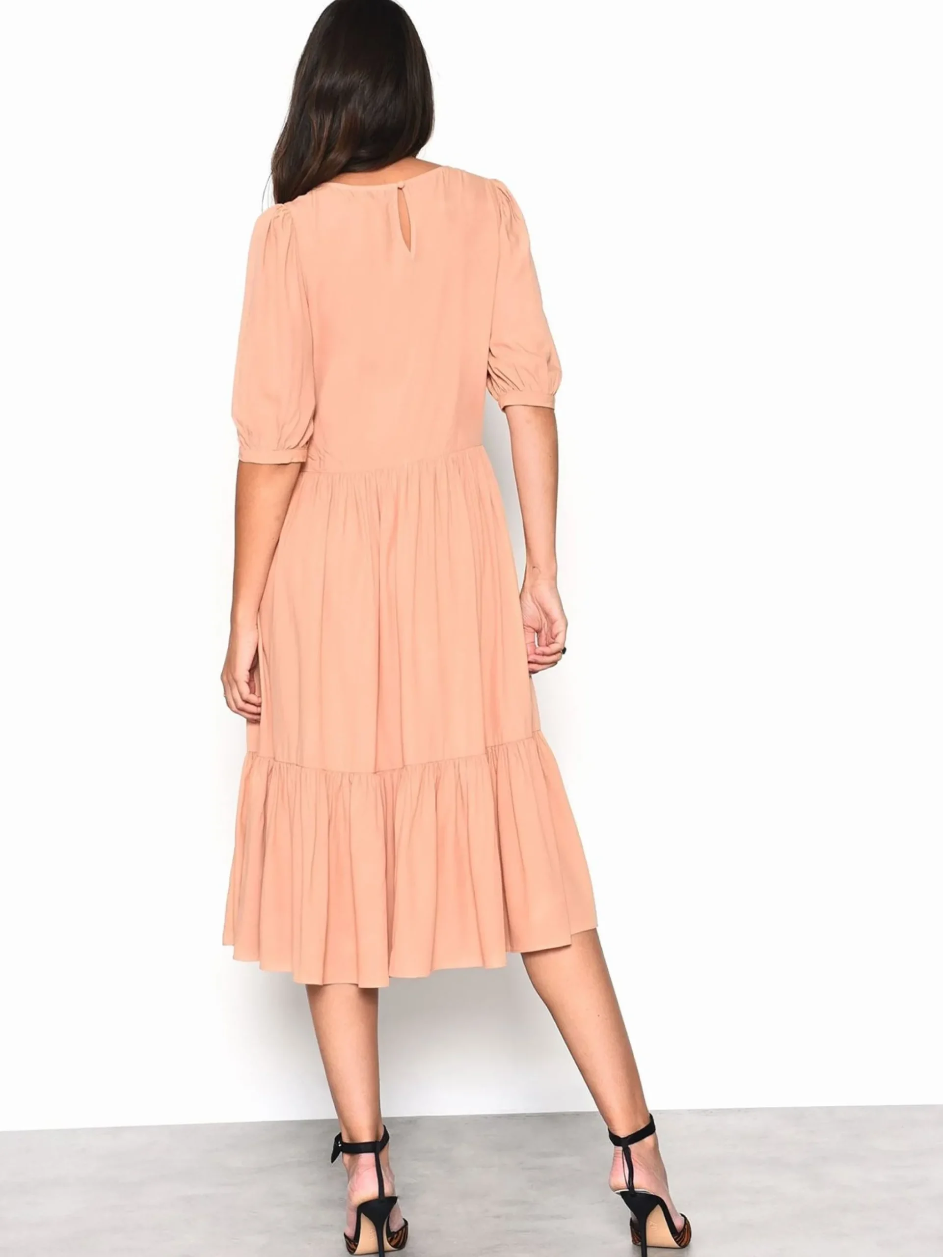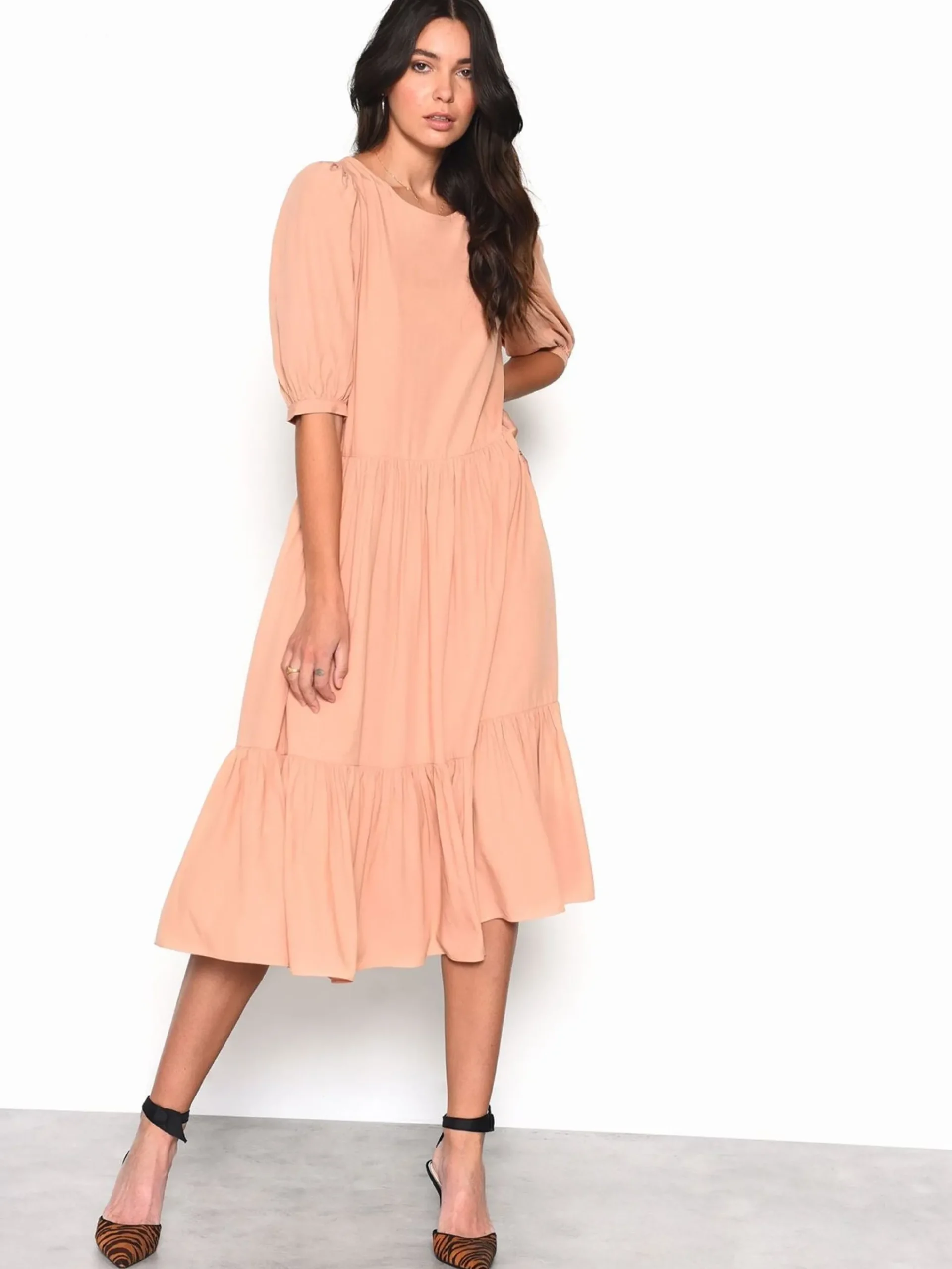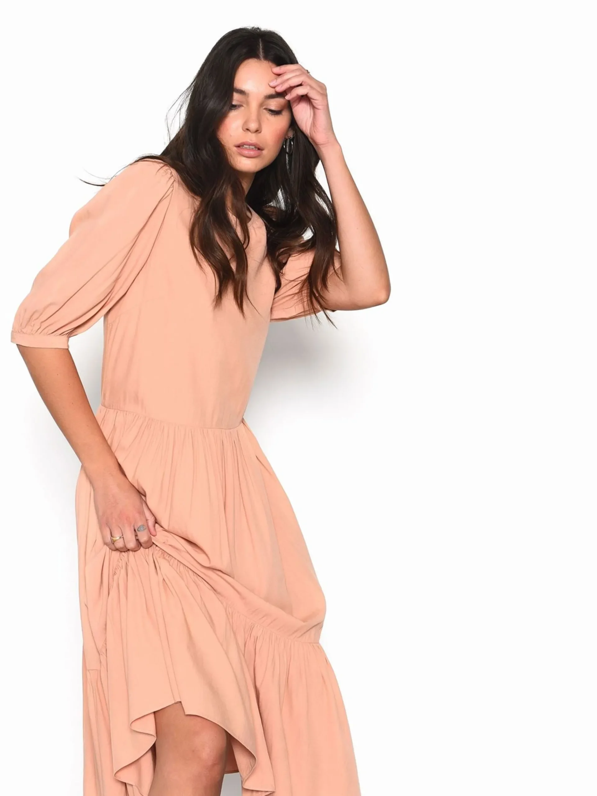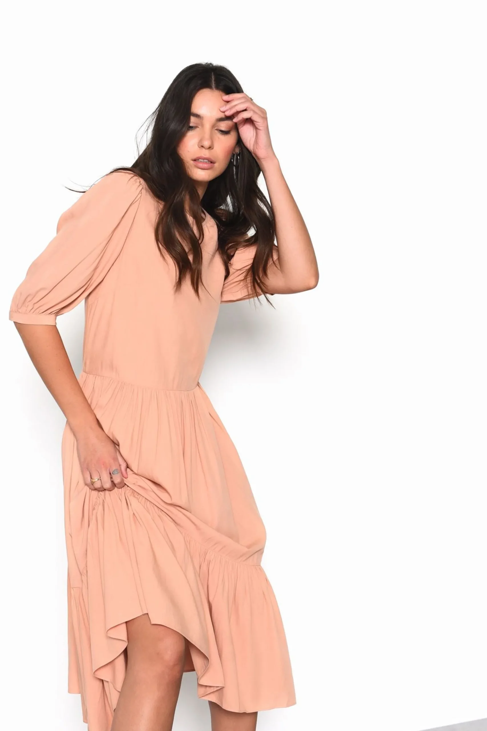 Glamorous Peach Long Sleeve Puff Midi Dress. This dress is the perfect summer piece to add to your wardrobe this season. Featuring an on trend colour with a midi style finish, this dress will look great on you. Pair with strappy sandals and a ruched shoulder bag for the ultimate look!
