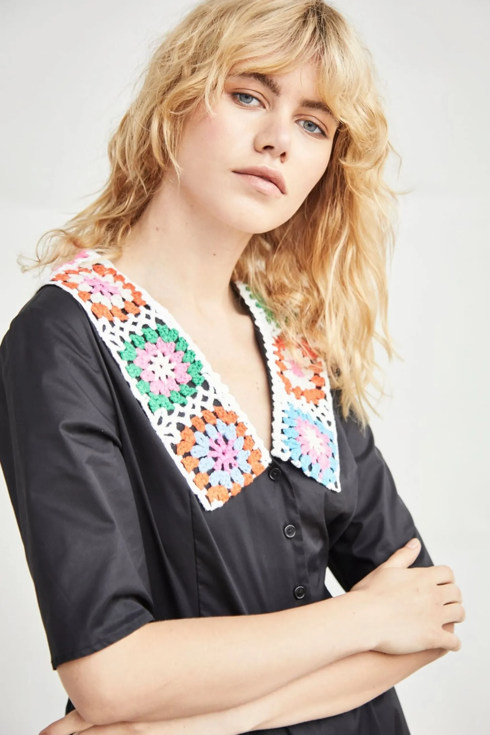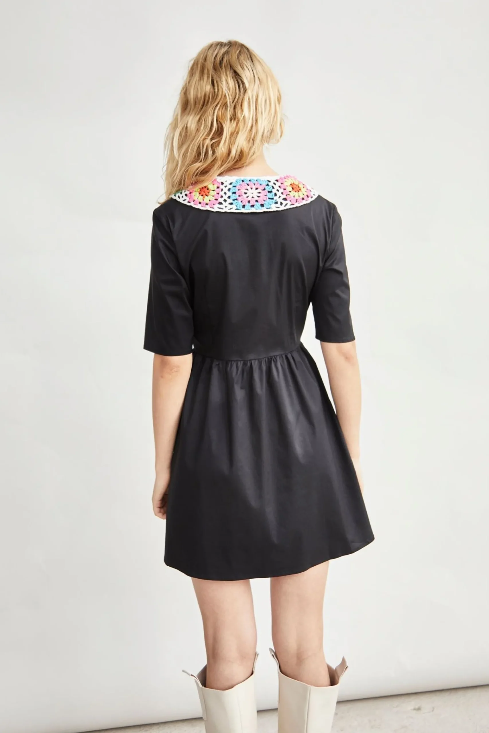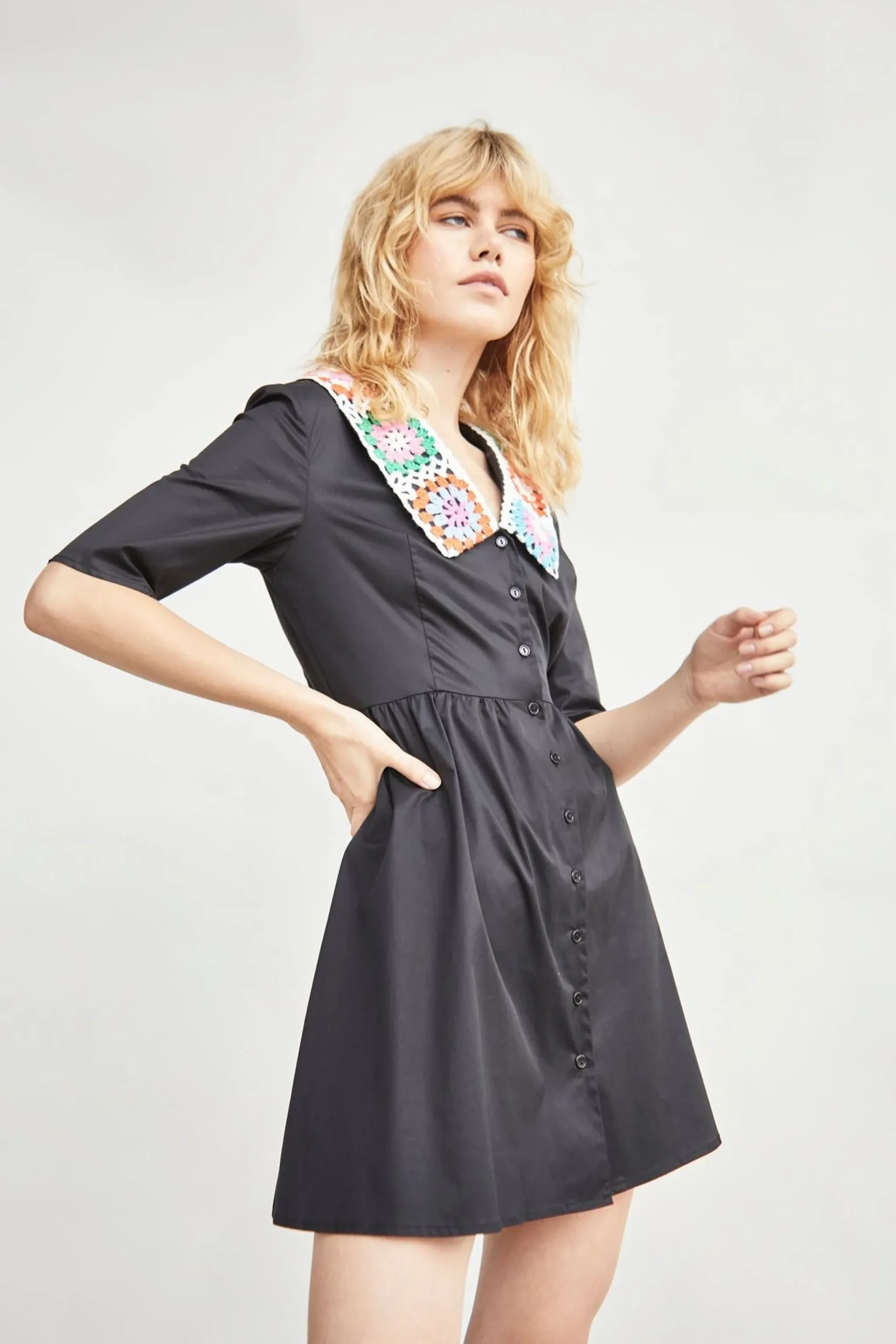 Glamorous Black Crotchet Collar Mini Dress. This dress is a perfect addition to your wardrobe this season, taking you from autumn to winter. Featuring a super flattering loose fit, crotchet collar and 3/4 sleeves, the perfect staple piece you need in your wardrobe this season. Style with chunky boots for the perfect daytime look.