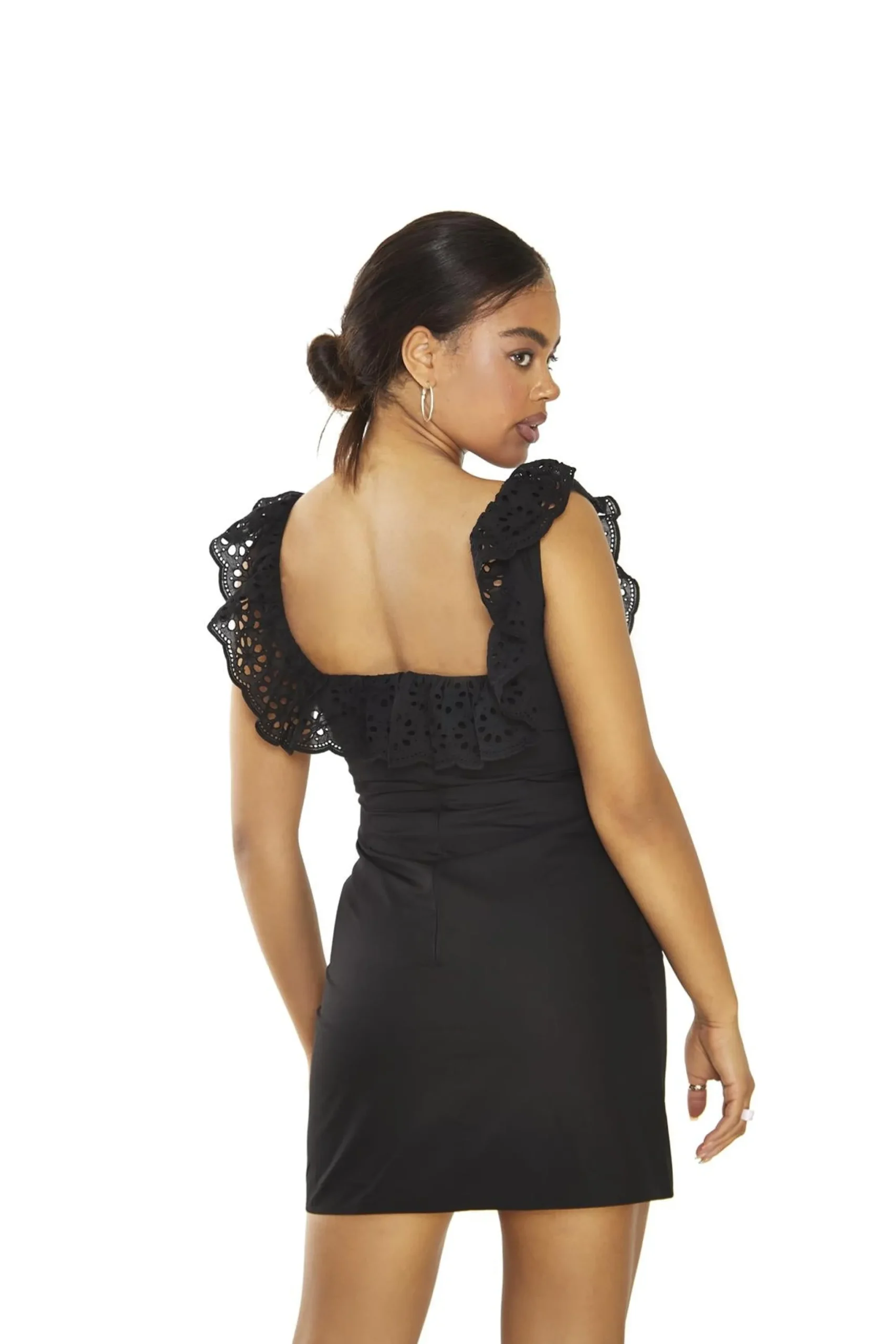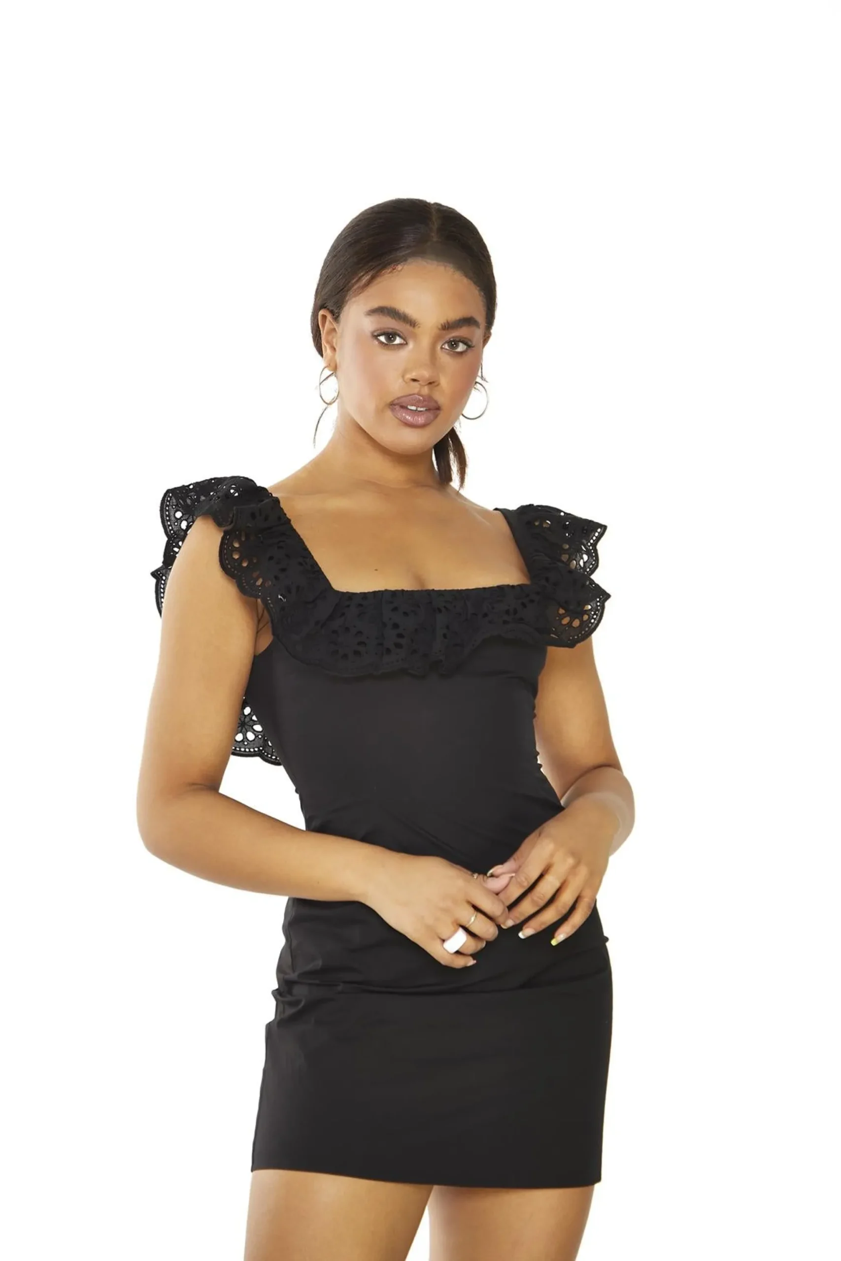 Glamorous Women’s Black Frill Neck Mini-Dress. Introducing the Black Frill Neck Mini-Dress – a stylish and versatile piece that’s perfect for any occasion. With its lace trim detailing and ruffle neck design, this dress adds a touch of feminine flair to your look. The bodycon fit hugs your curves in all the right places, while the midi length provides just the right amount of coverage. Whether you’re heading to a night out with friends or a special event, this dress is sure to turn heads. Slip it on and let your confidence shine through. Get ready to feel fabulous and effortlessly chic in this must-have addition to your wardrobe.