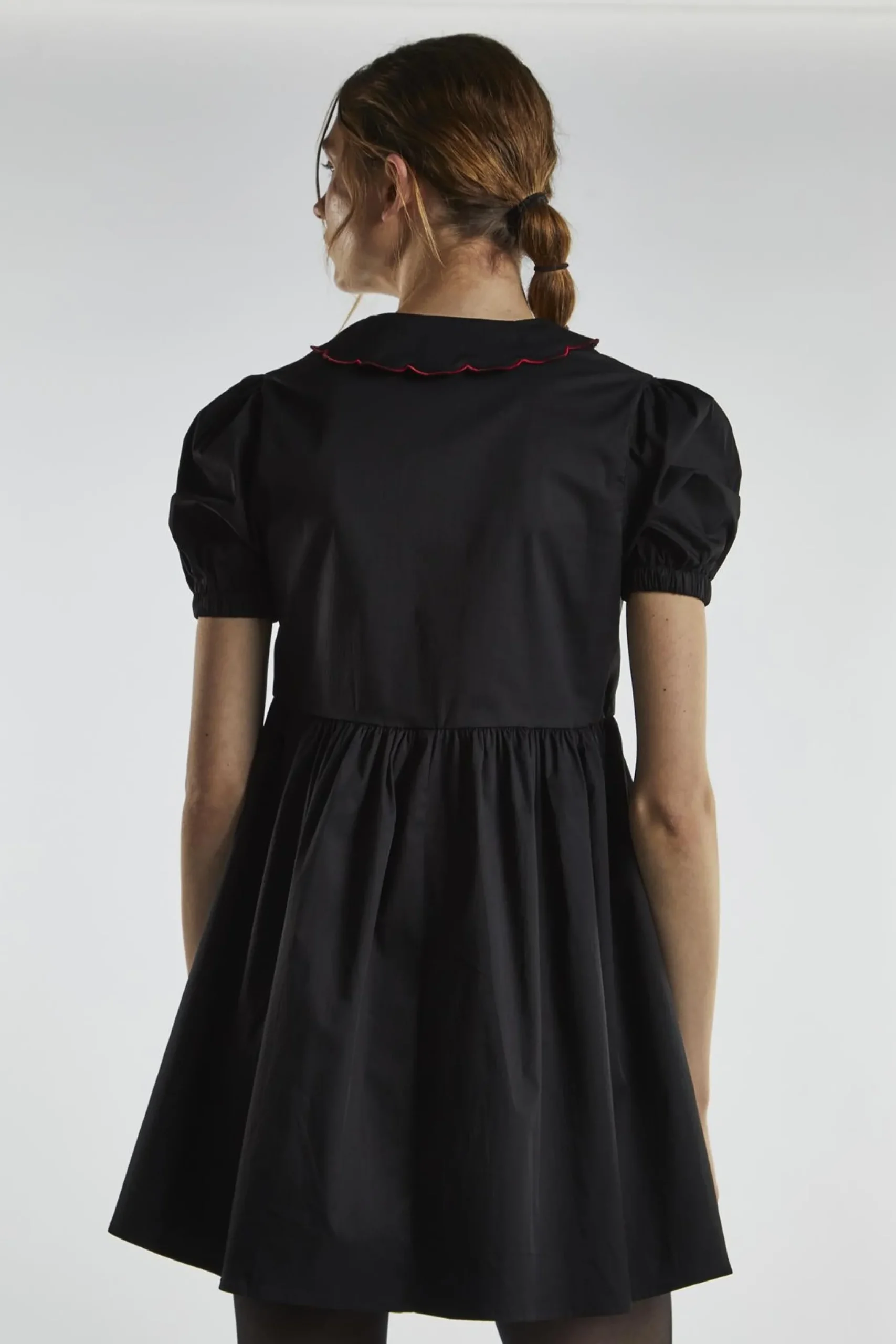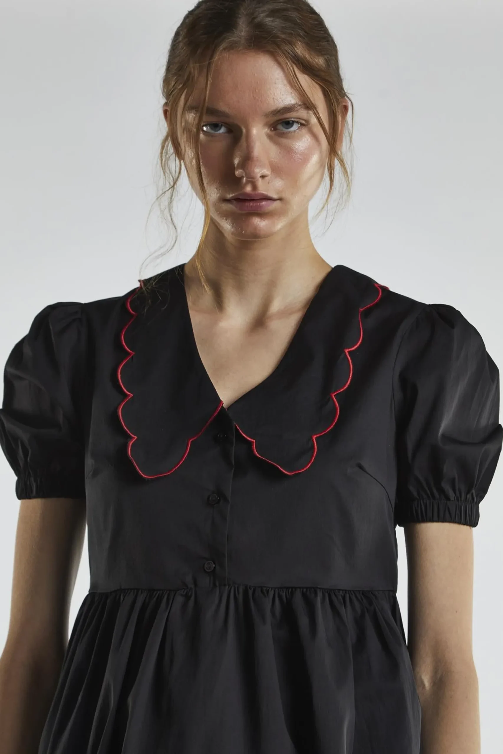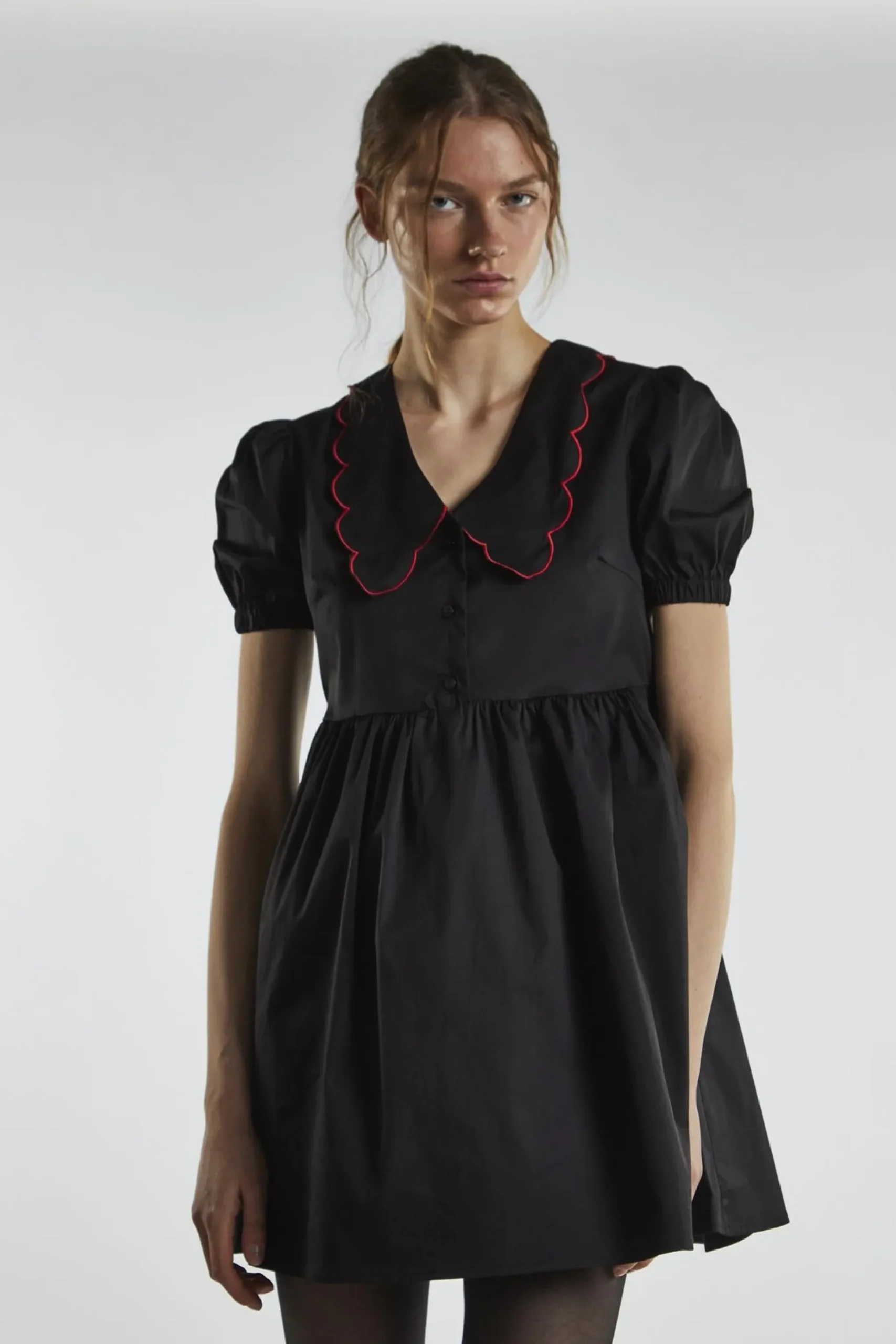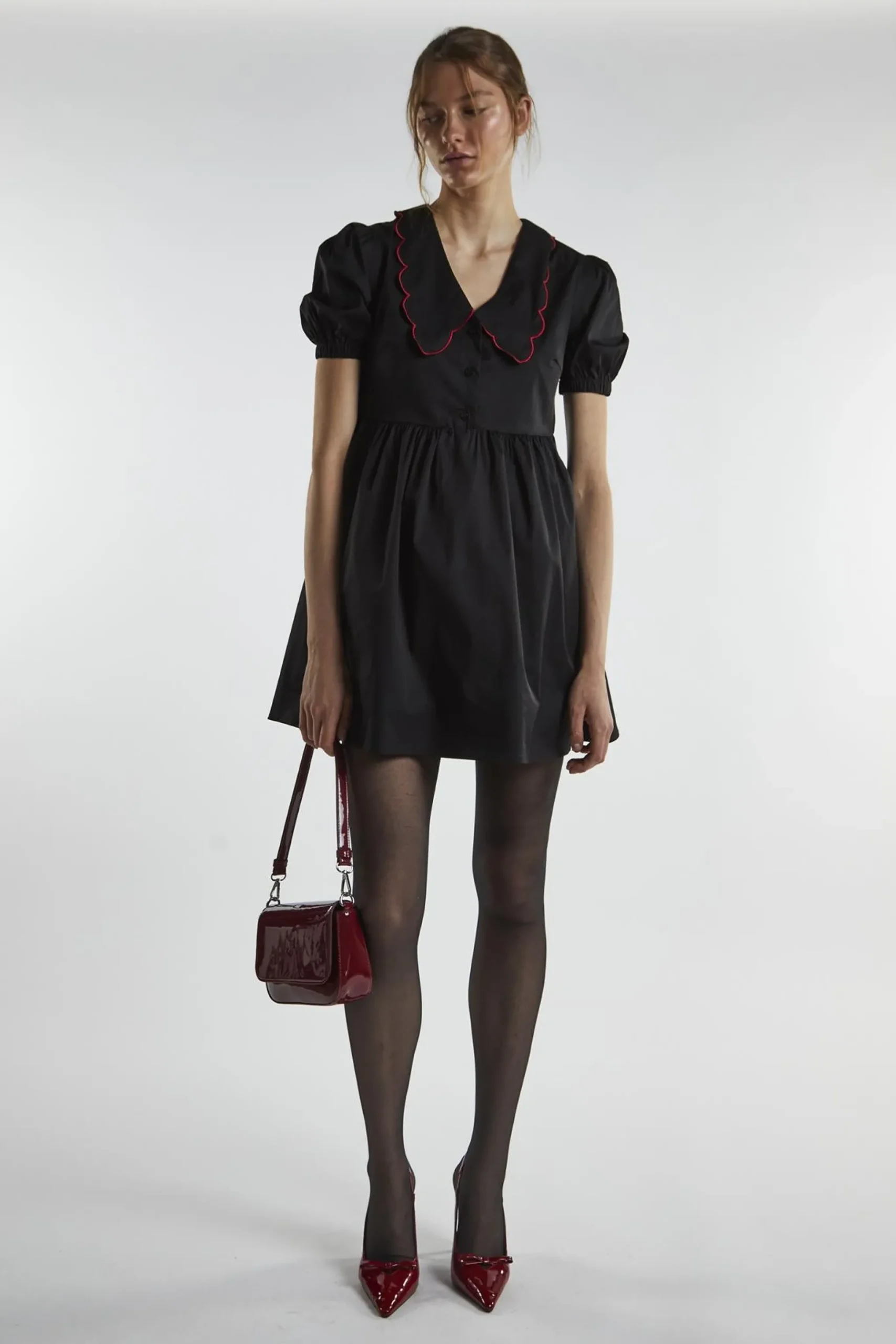 Glamorous Women’s Black Scalloped-Collar Mini-Dress. This charming black mini-dress is a playful twist on classic style. The standout scalloped collar, adorned with eye-catching contrast stitching, adds a touch of whimsy to your look. A row of buttons down the front gives you the option to adjust your neckline, while the puff sleeves bring a dash of romance. The skater silhouette creates a flattering shape that’s both comfortable and stylish. With its mini length, this dress is perfect for showing off your favourite shoes or boots. It’s a versatile piece that can easily transition from day to night, making it a go-to choice for various occasions. The timeless black colour ensures this dress will remain a staple in your wardrobe for seasons to come. Pair it with colourful accessories to make the contrast stitching pop, or keep it sleek with minimalist jewellery for a more understated look.