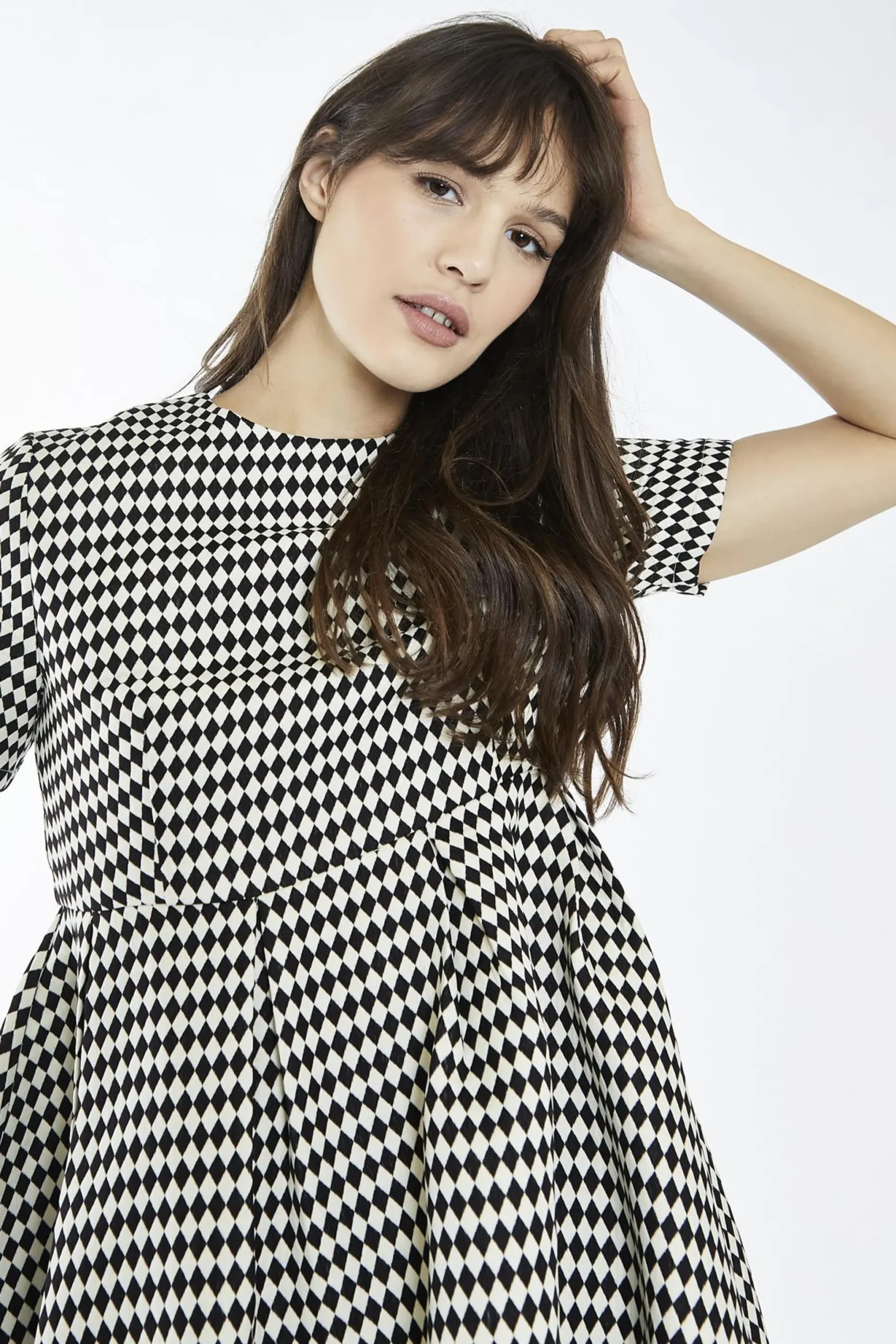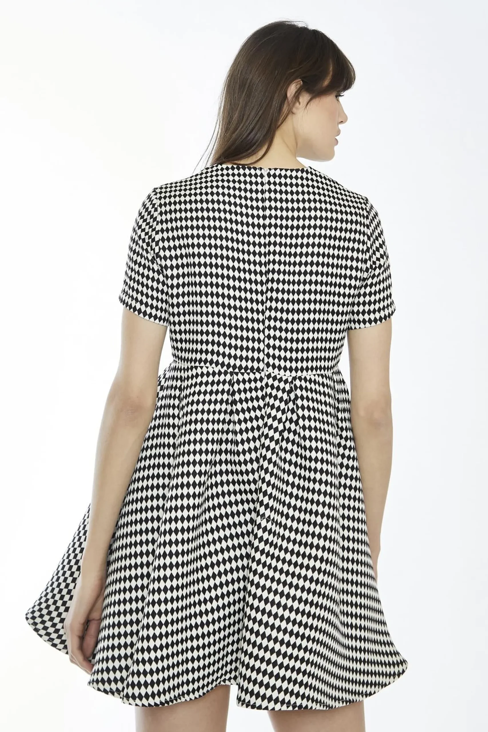 Glamorous Women’s Black-White Diamond Crew-Neck Skater Mini-Dress. This black and white diamond crew neck mini-skater dress is a delightful addition to your wardrobe, perfect for adding a playful yet chic touch to your look. The classic crew neck design offers a timeless appeal, while the short sleeves keep it light and breezy for warmer days. Pleated detailing adds a charming flair, creating movement and texture that makes this dress stand out. The skater silhouette flatters all body types, giving you a fun, feminine shape that’s easy to wear for any occasion. Pair it with ankle boots for a casual outing, or dress it up with heels and statement earrings for a night out with friends. The black and white diamond pattern is versatile enough to match with various accessories, allowing you to express your personal style effortlessly. This mini-skater dress is not just an outfit; it’s a canvas for your creativity, making it easy to put together fresh looks that reflect your unique personality.