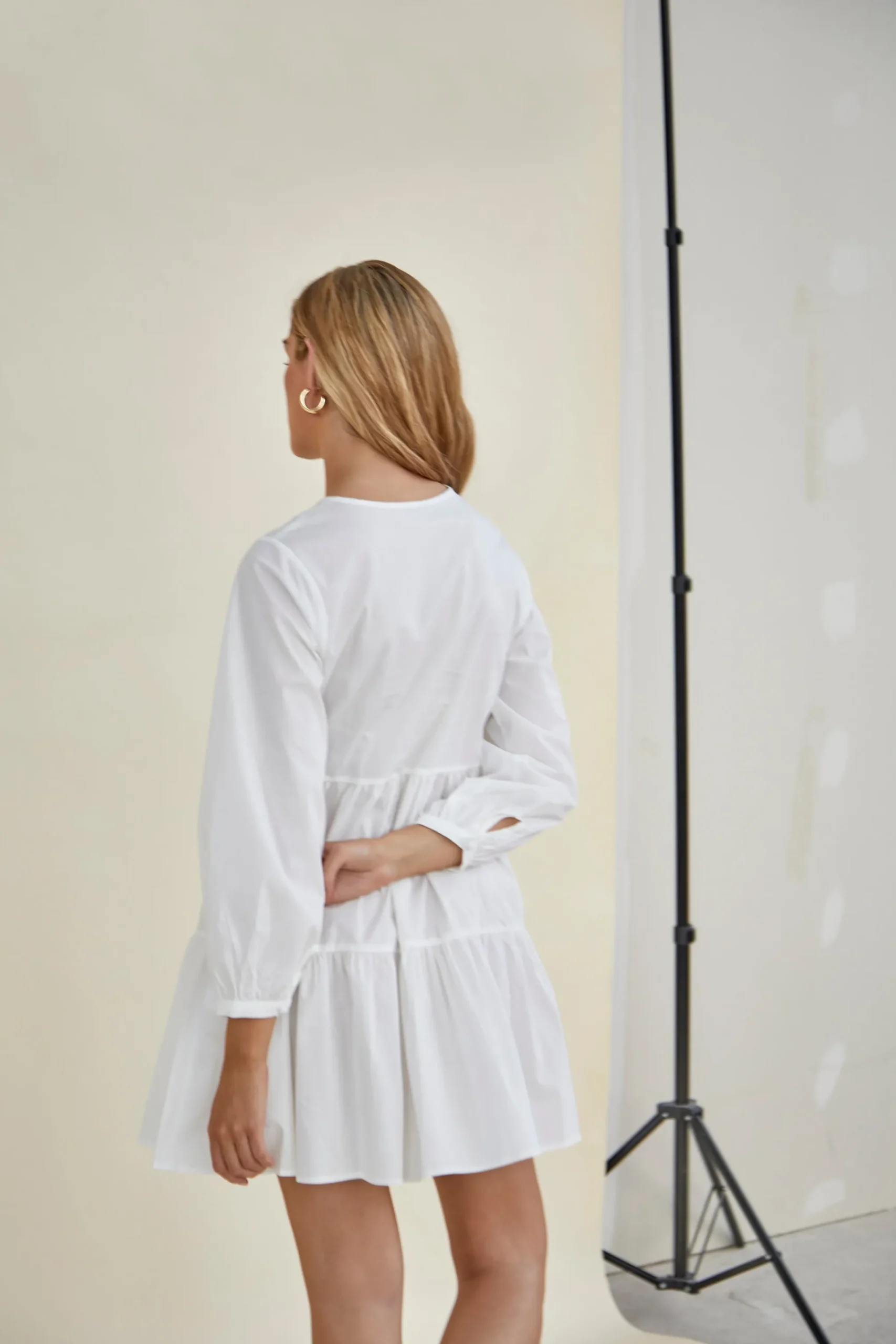 Glamorous White Boho Tiered Mini Dress. This dress is perfect for your wardrobe this season. Featuring a split open tie front, tiered skirt and long voluminous sleeve, this mini dress will have heads turning. Easily paired with trainers or heels, whatever your style!