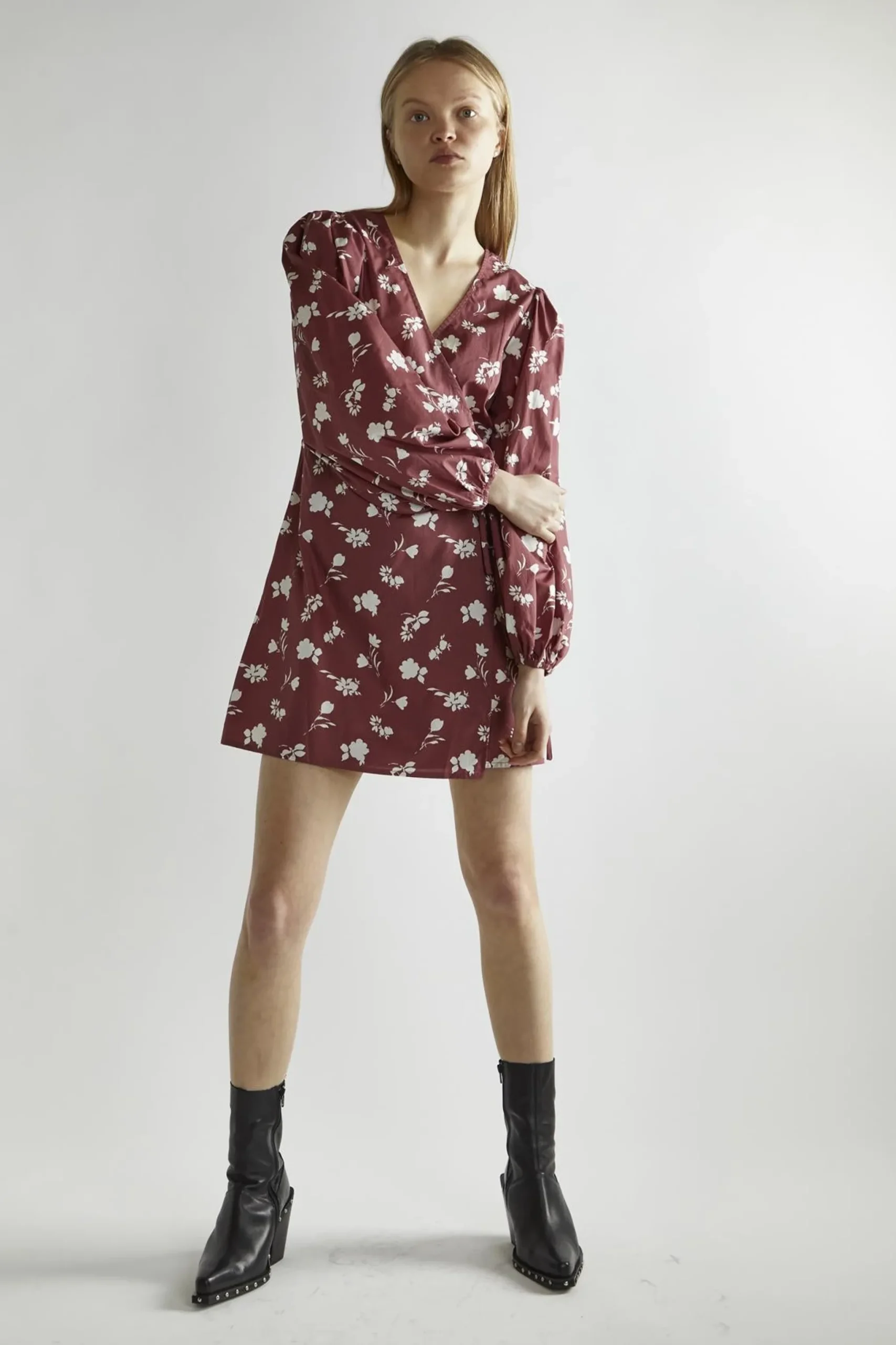 Glamorous Women’s Burgundy Floral Wrap Mini-Dress. Our Burgundy Floral Wrap Mini-Dress is a delightful choice for those who love to express their style with a touch of romance. The rich burgundy colour is beautifully complemented by a vibrant floral print, creating a look that’s both eye-catching and elegant. The flattering V-neckline adds a feminine touch, while the long sleeves provide just the right amount of coverage for cooler days or evenings. The wrap design not only enhances your silhouette but also allows for an adjustable fit, making it easy to wear comfortably throughout the day. This mini-dress is perfect for pairing with ankle boots for a casual outing or dressing up with heels for a night out. The playful length and flowing fabric make it ideal for twirling on the dance floor or enjoying a sunny afternoon. With its charming details and versatile style, this dress is sure to become a favourite in your wardrobe, ready to shine at any occasion.