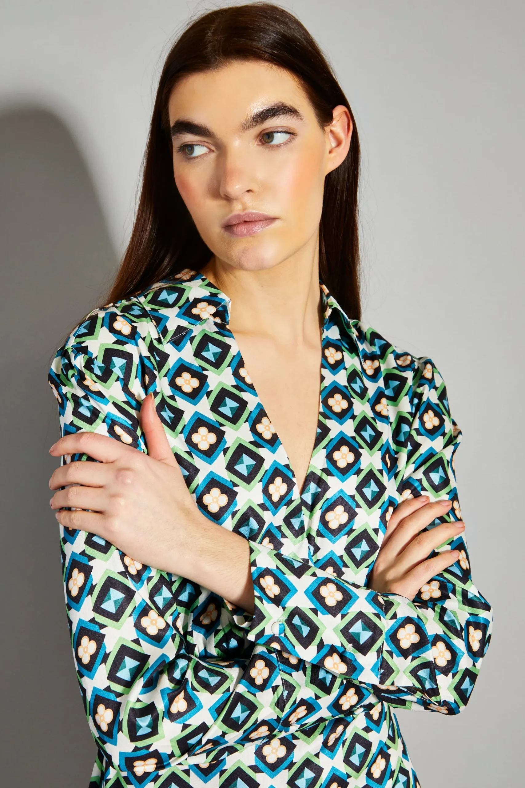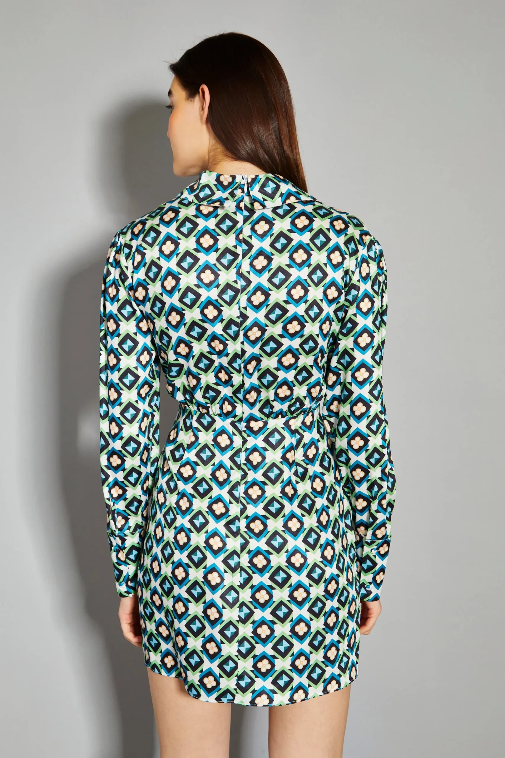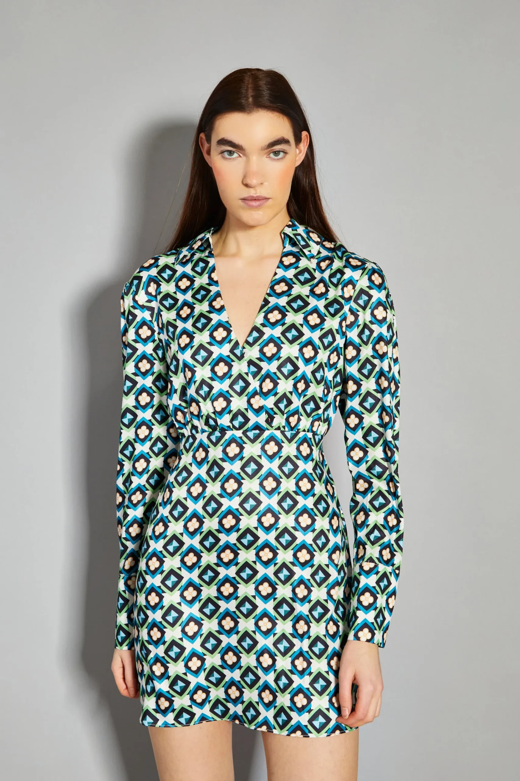 Glamorous Cream Multi Geo Flower Print V-Neck Mini Dress. This fashion forward mini dress is perfect for this season. Featuring an on trend geometric floral print with a V-neckline and long sleeves, this flattering piece will look great on you! Pair with knee high boots for an effortlessly chic look.