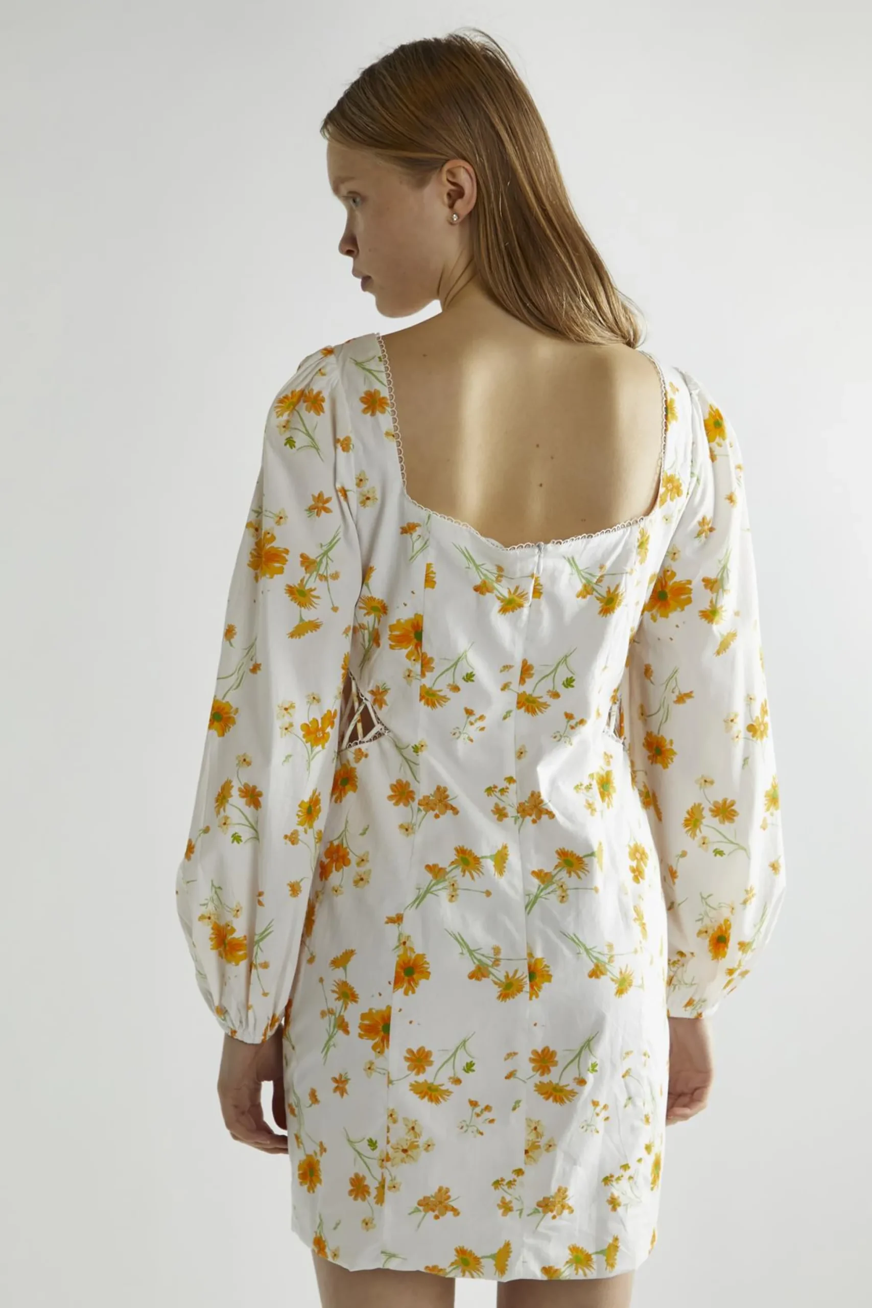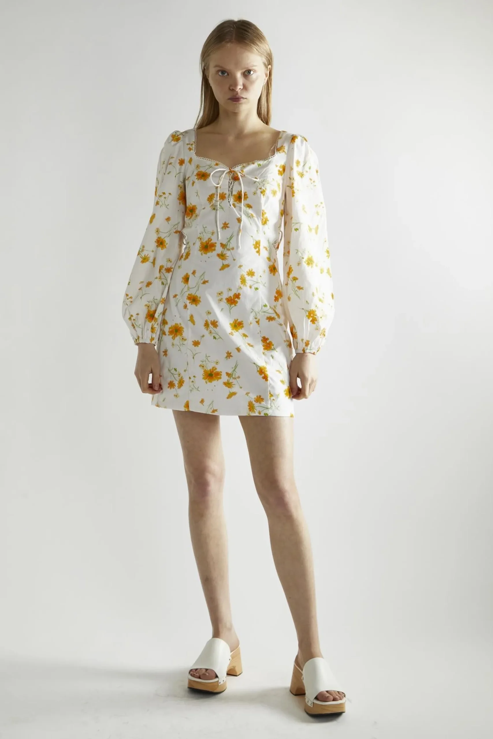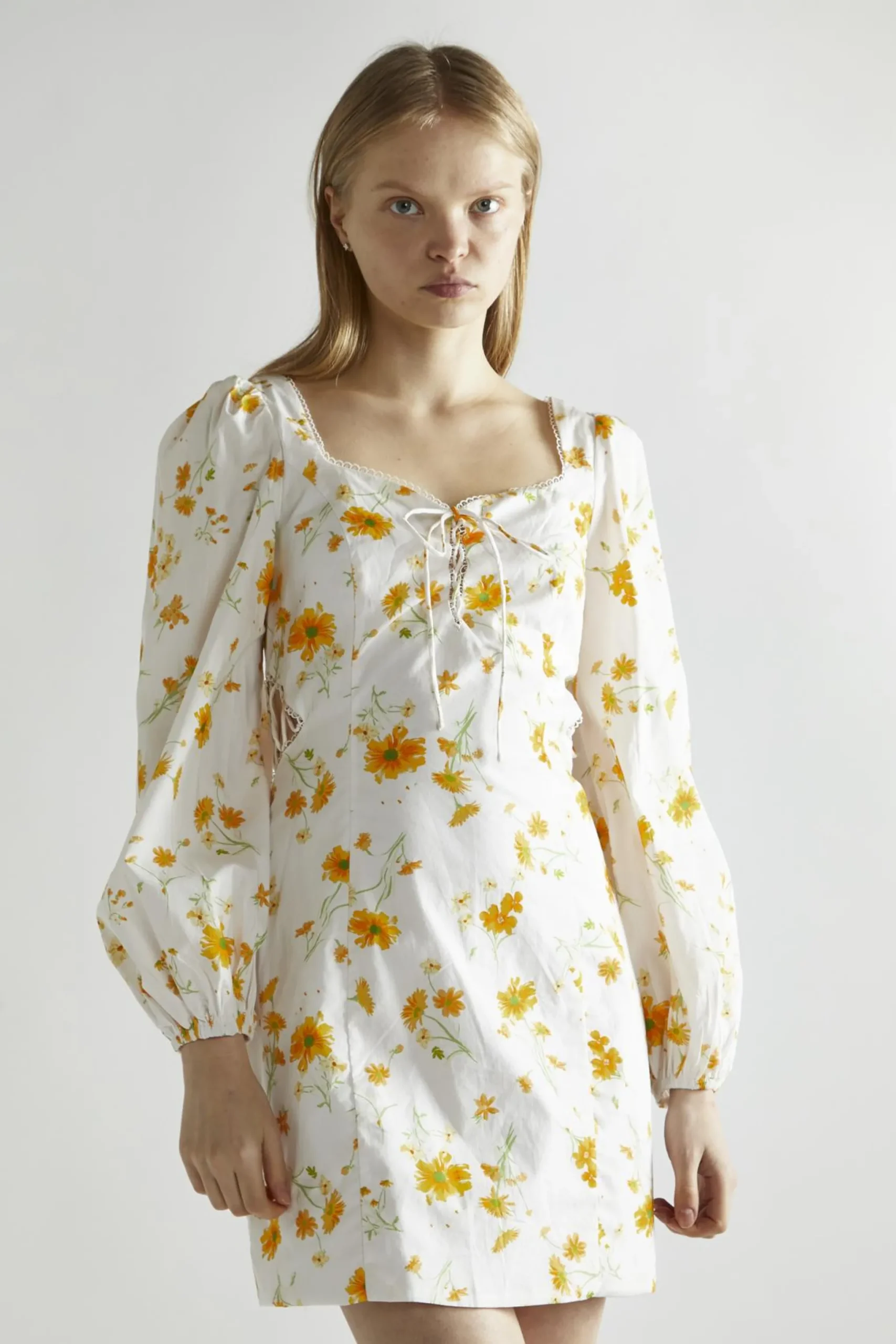 Glamorous Women’s Marigold Floral A-Line Mini-Dress. This marigold floral A-line mini dress is like a burst of sunshine in your closet. It’s the kind of dress that makes you want to dance, even if you’re just heading to the mailbox. The cheerful floral print brings a touch of garden-fresh beauty to your day, while the A-line silhouette flatters every figure. Long sleeves make it perfect for those in-between weather days, and the tie front adds a playful, adjustable touch. But the real magic is in the details – delicate lace trim gives it a romantic edge, like whispers of vintage charm. Don’t fret about getting it on and off; the concealed back zip keeps things smooth and easy. This dress is a true mood-lifter, ready to brighten up your brunch dates, park strolls, or casual office days. Pair it with sneakers for a laid-back vibe, or dress it up with heels for a night out. It’s like wearing a smile – impossible to feel down when you’ve got this sunny number on!