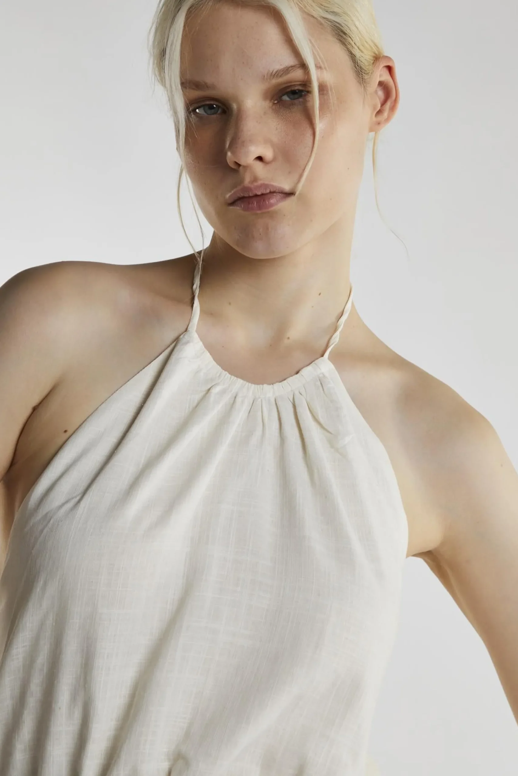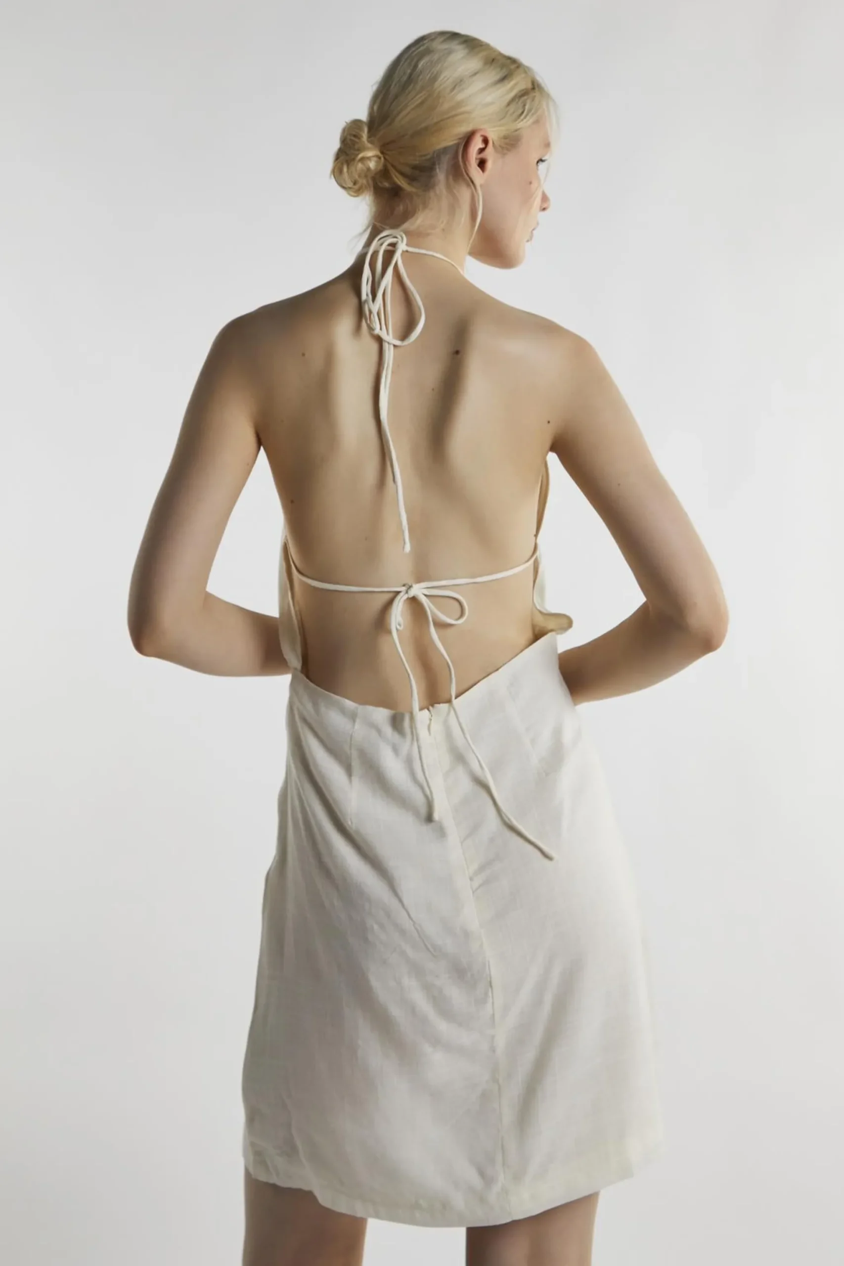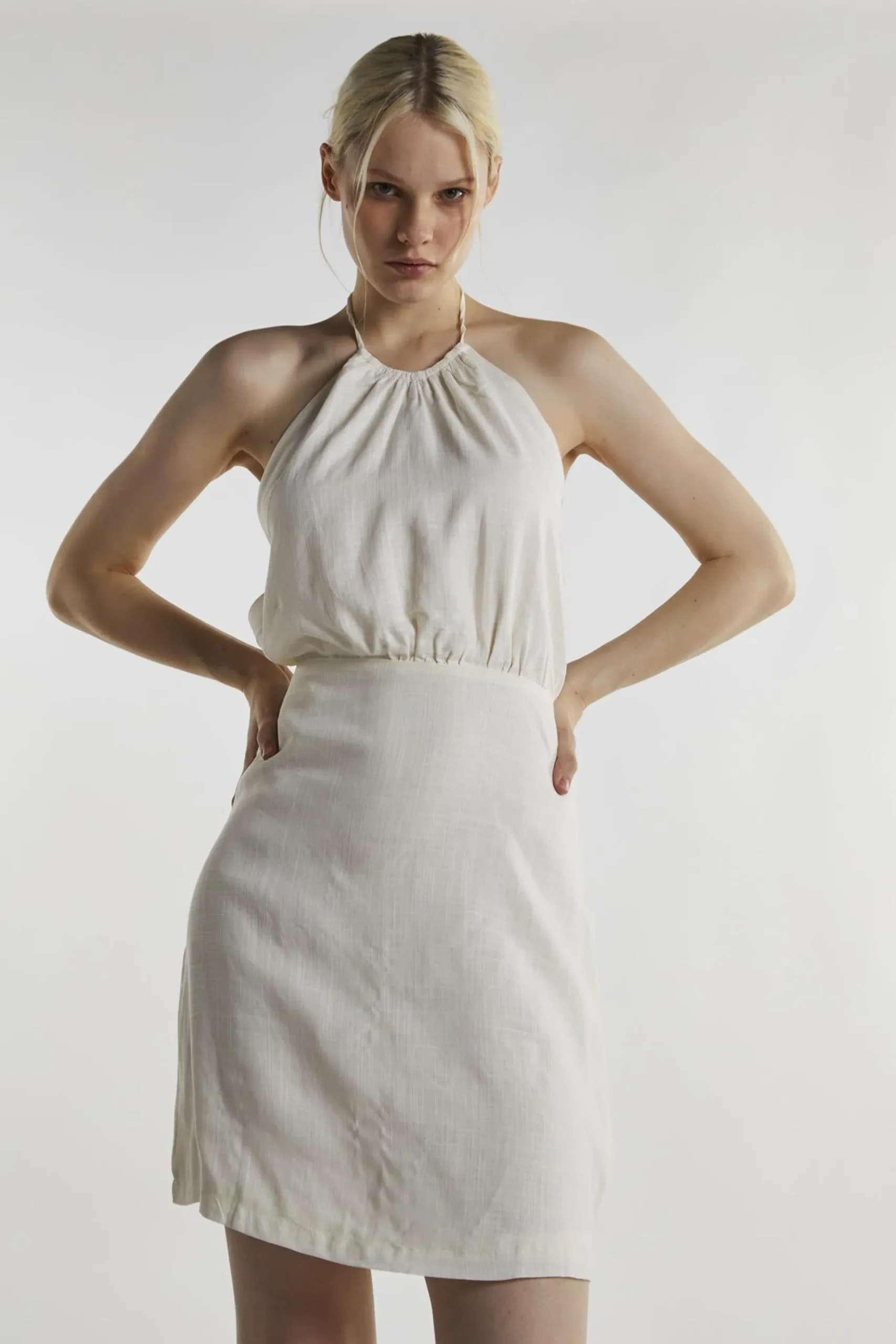 Glamorous Women’s Off White Linen Halter Neck Mini-Dress. Meet the Off White Linen Halter Neck Mini-Dress, a breezy and stylish choice for those warm days when you want to feel cool and comfortable. The halter neck design not only adds a chic touch but also showcases your shoulders beautifully. With an open low back, this dress brings a hint of playfulness while keeping things classy. Made from lightweight linen, it’s perfect for staying fresh in the heat. The concealed zip fastening at the back ensures a smooth look and easy wear. Pair it with some cute sandals for a day at the beach or dress it up with wedges and statement jewellery for an evening out. This mini-dress is all about making you feel fabulous and carefree wherever you go.