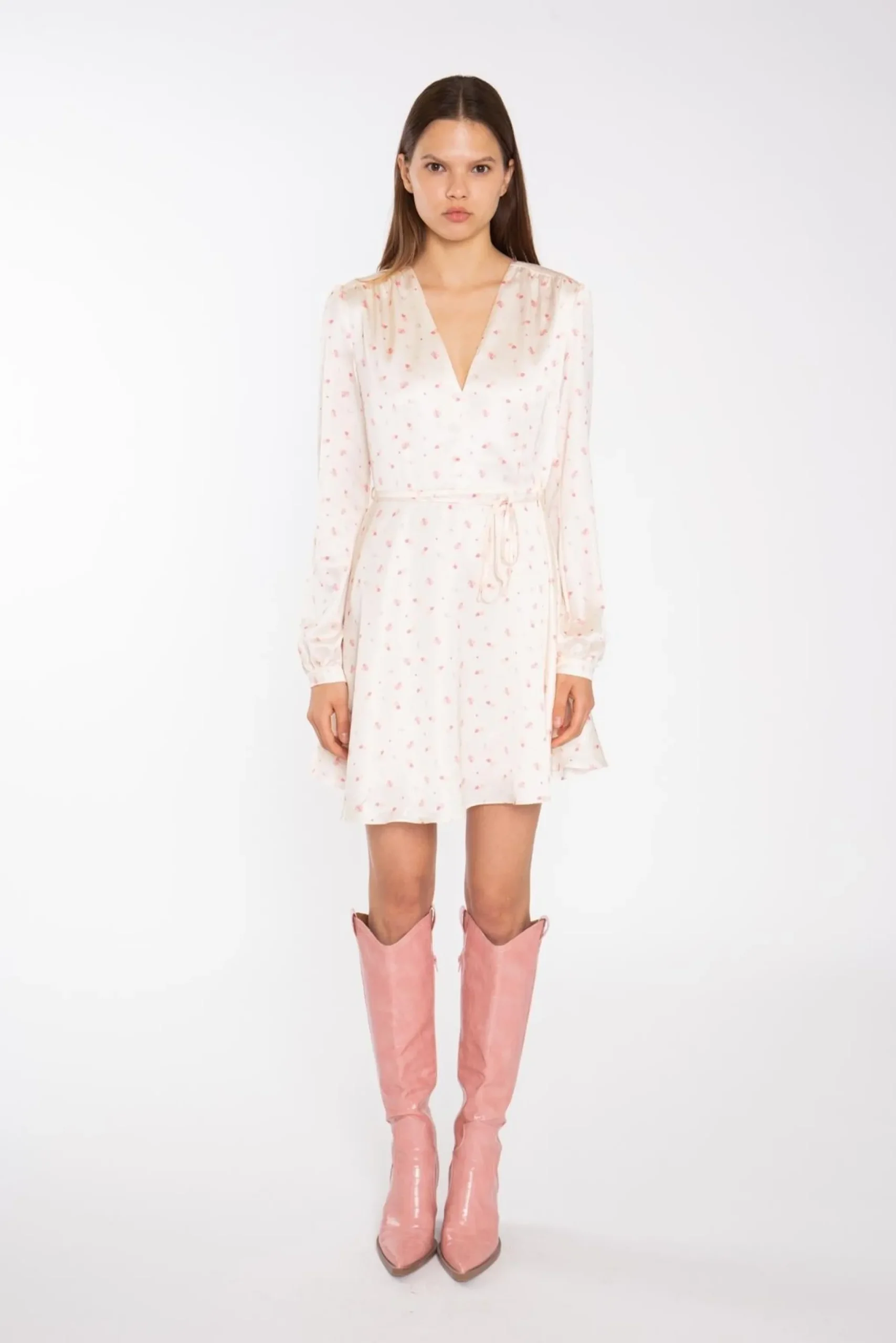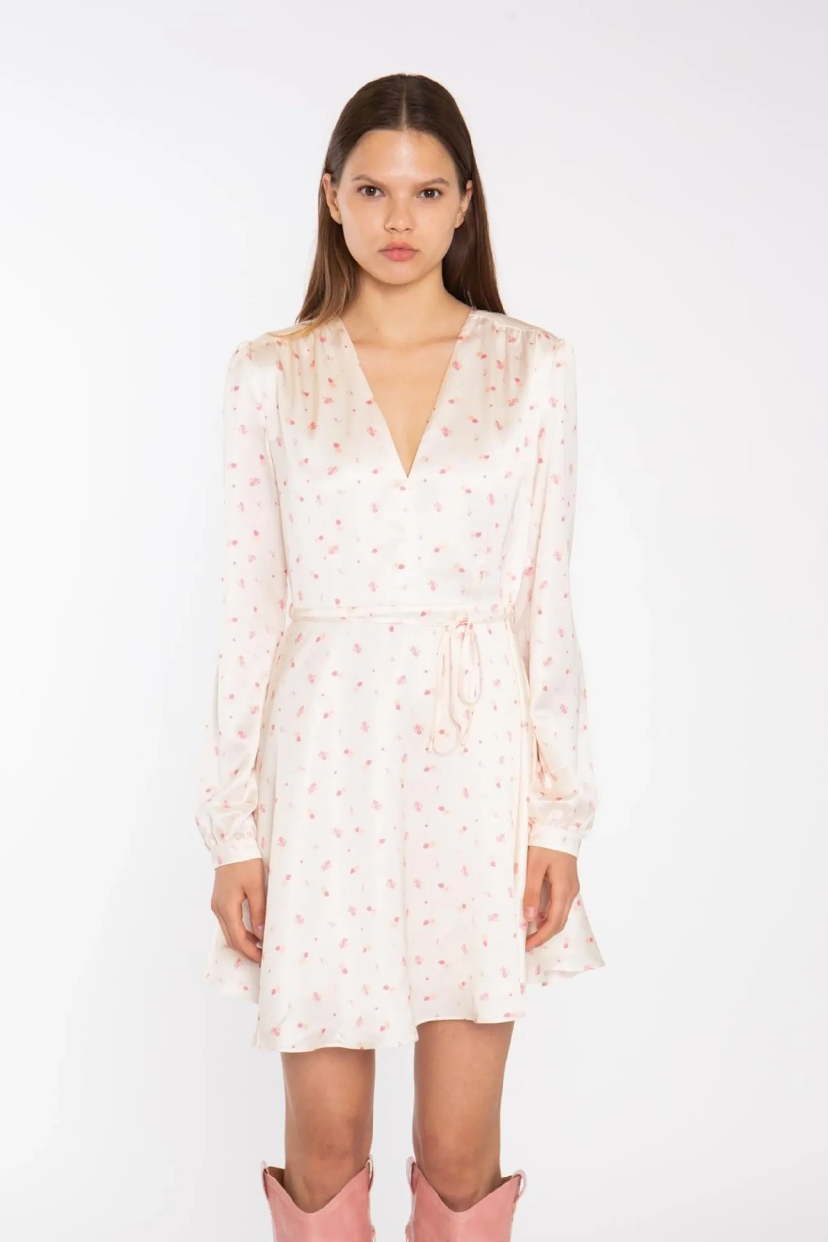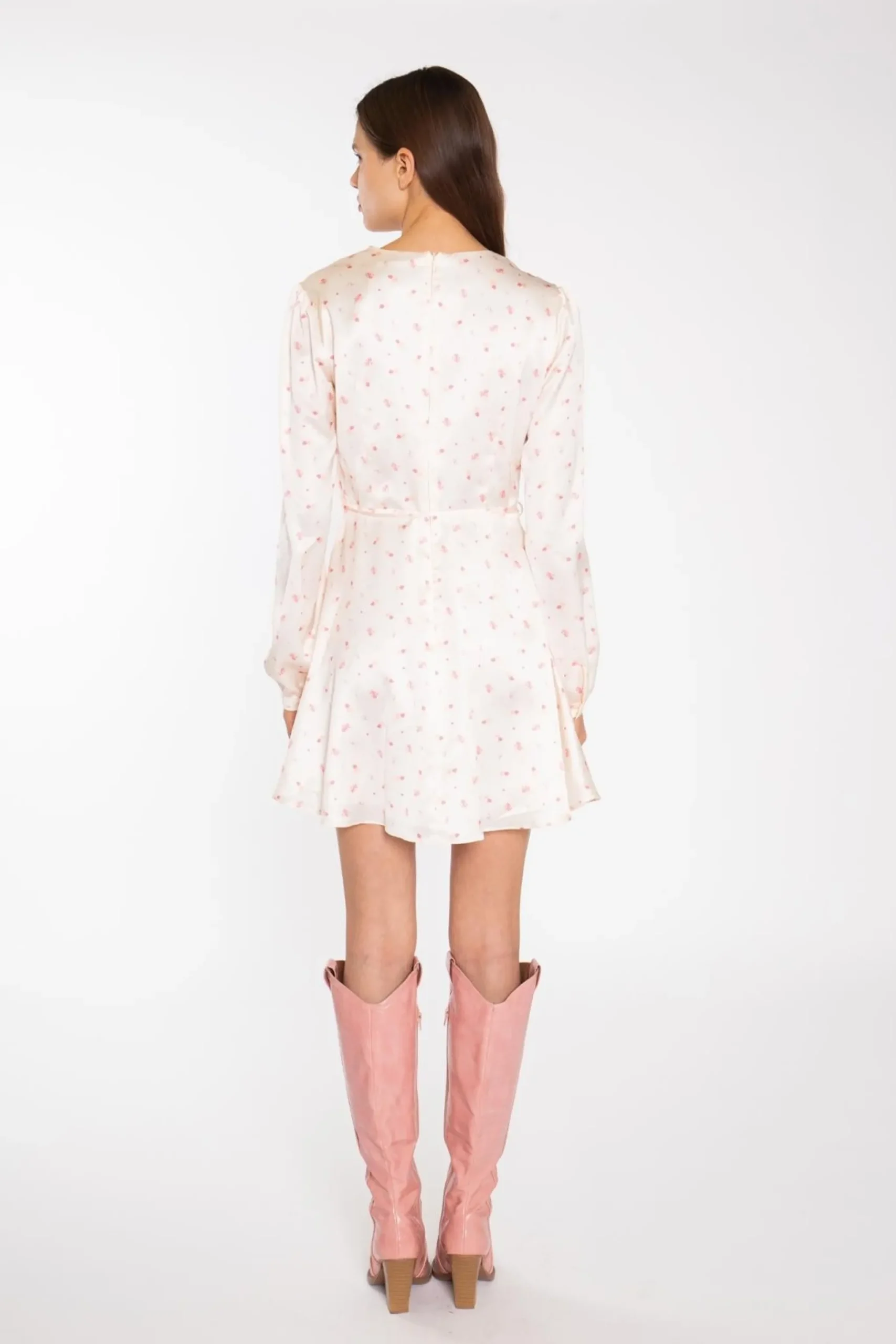 Glamorous Women’s Peach-Pink Daisy V-Neck Mini-Dress. Radiate warmth and femininity in this delightful peach-pink mini-dress. Crafted with a flattering V-neckline and a tie waist that cinches your silhouette, it exudes effortless charm. Long sleeves provide coverage, while the mini length keeps you feeling breezy. Fully lined for comfort, it features a concealed back zip for easy dressing. Available in multiple hues, this dress is a versatile addition to your spring wardrobe, perfect for brunch dates or garden parties.