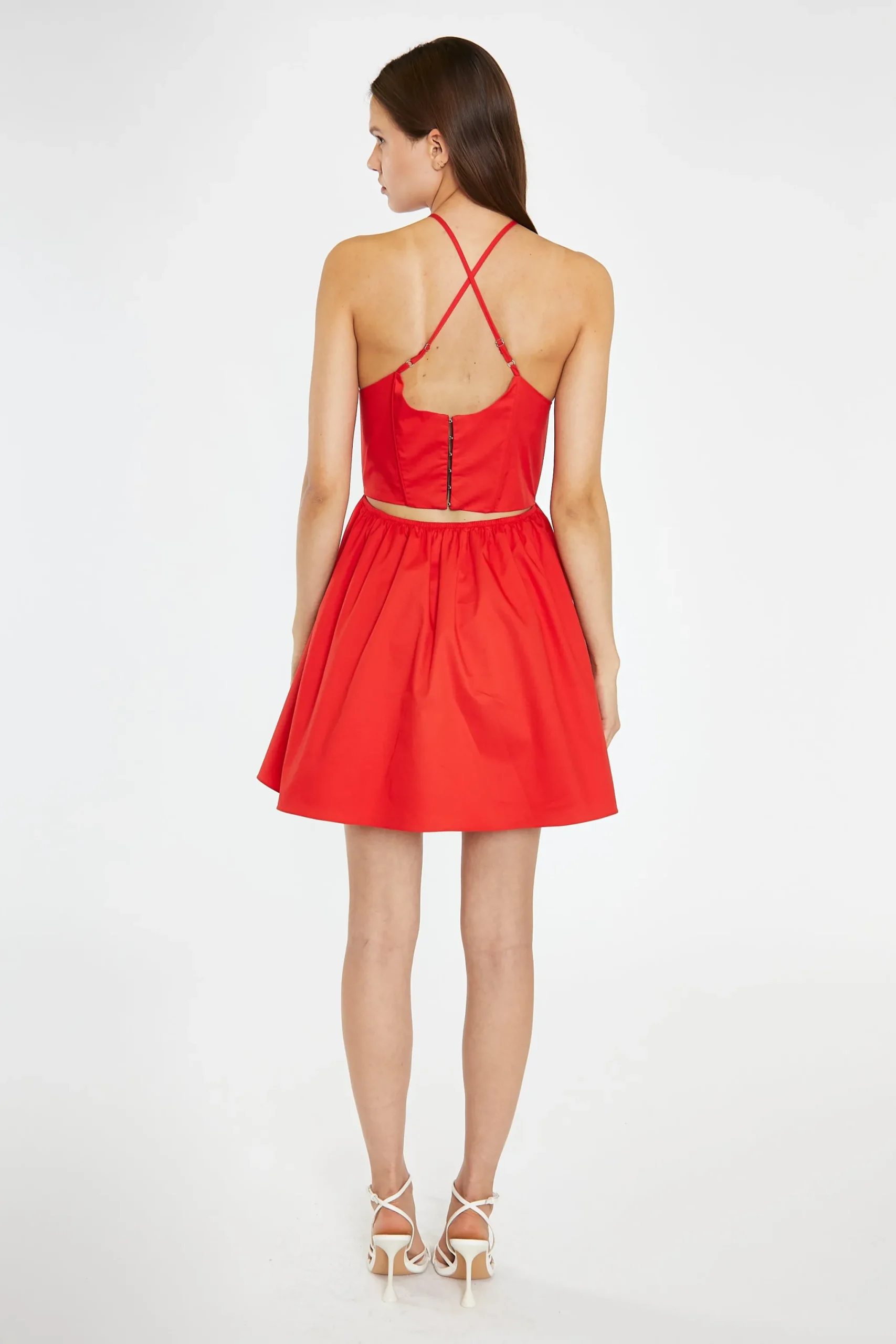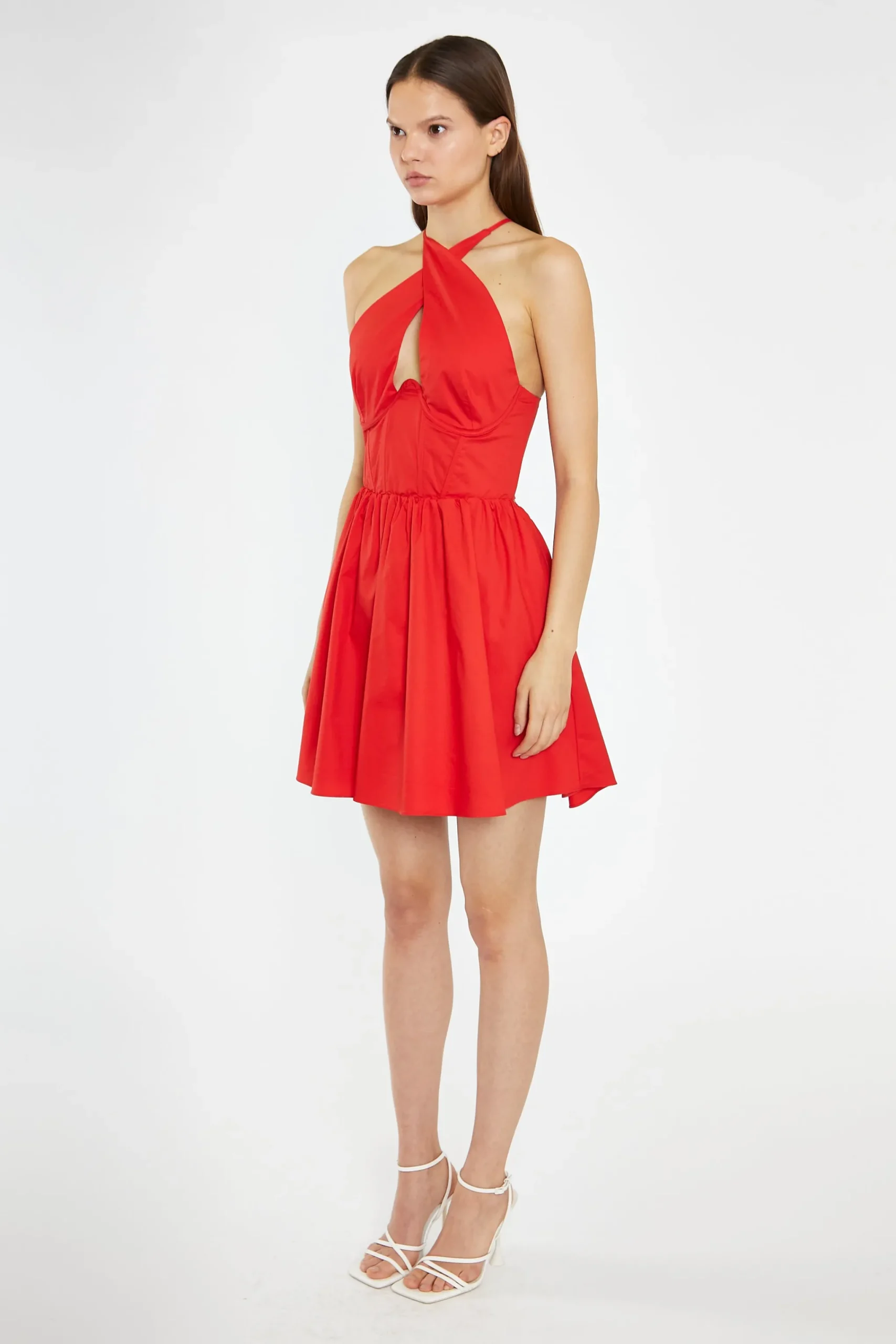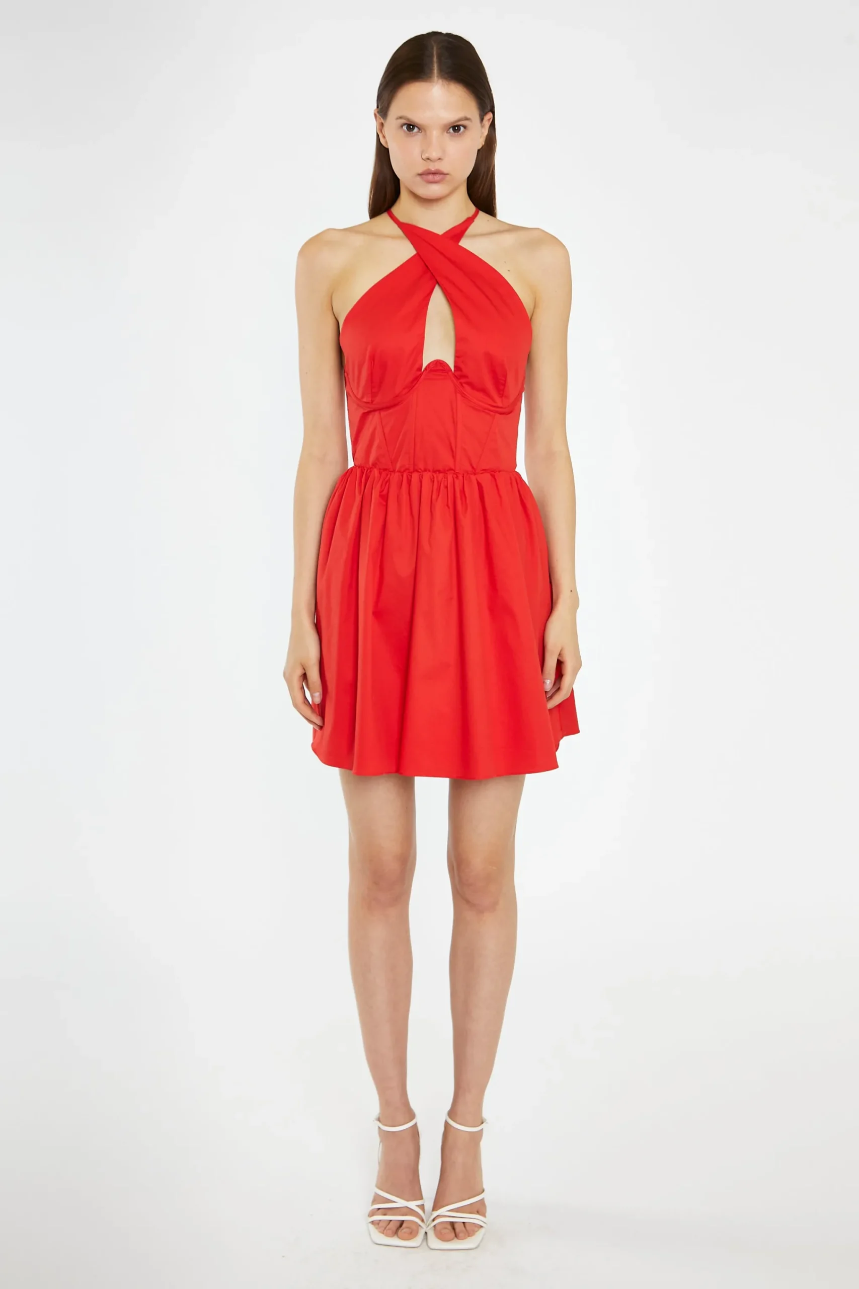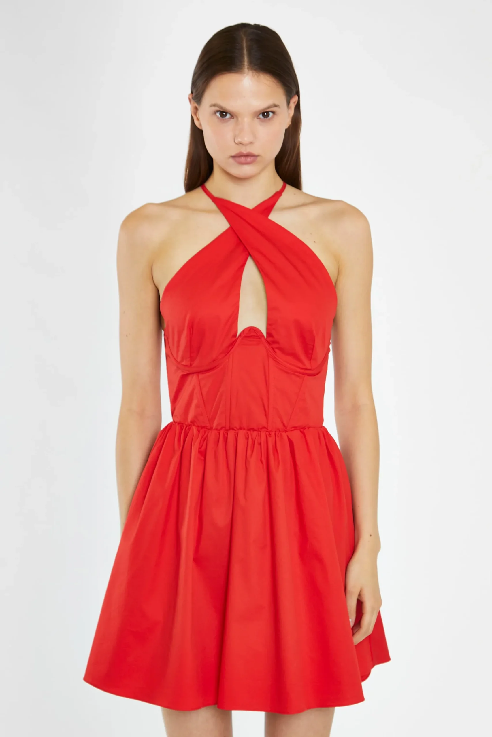 Glamorous Women’s Poppy-Red Cross-Over Halterneck Corset Mini-Dress. Add some sass to your wardrobe with this Poppy-Red Cross-Over Halterneck Corset Mini-Dress. The unique Corset structure and design will cinch your waist, while the gathered skirt adds a flirty touch. With adjustable spaghetti straps and a hook & eye back fastening, this mini dress will have you looking confident and stylish all night.