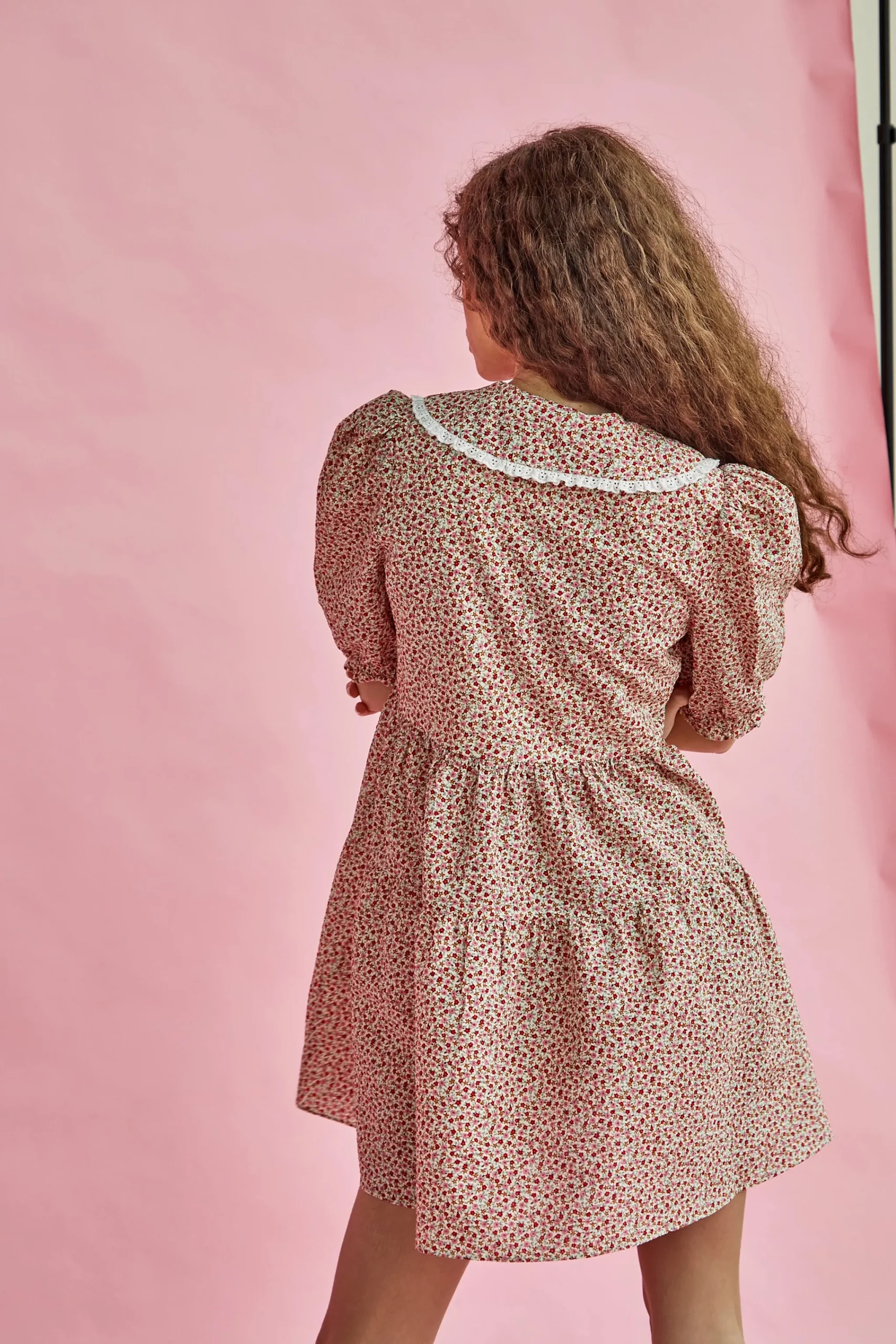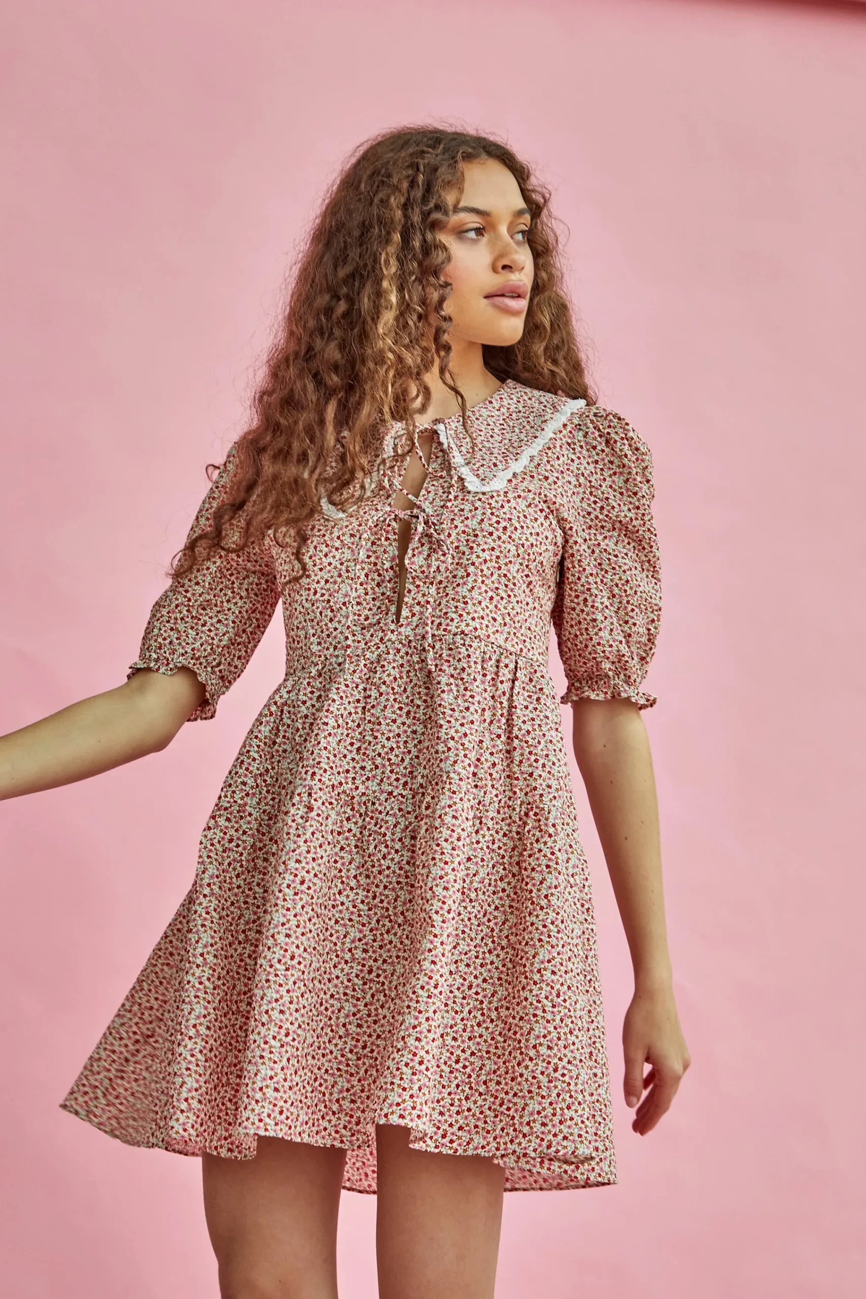 Glamorous Red Pink Ditsy Statement Collar Smocked Mini Dress. Perfect for all occasions, this super flattering smocked mini dress features a statement collar, tiered skirt, puff sleeves with a loose fit. Looks great teamed with chunky boots or dressed up with your favourite heels for cocktails with the girls.