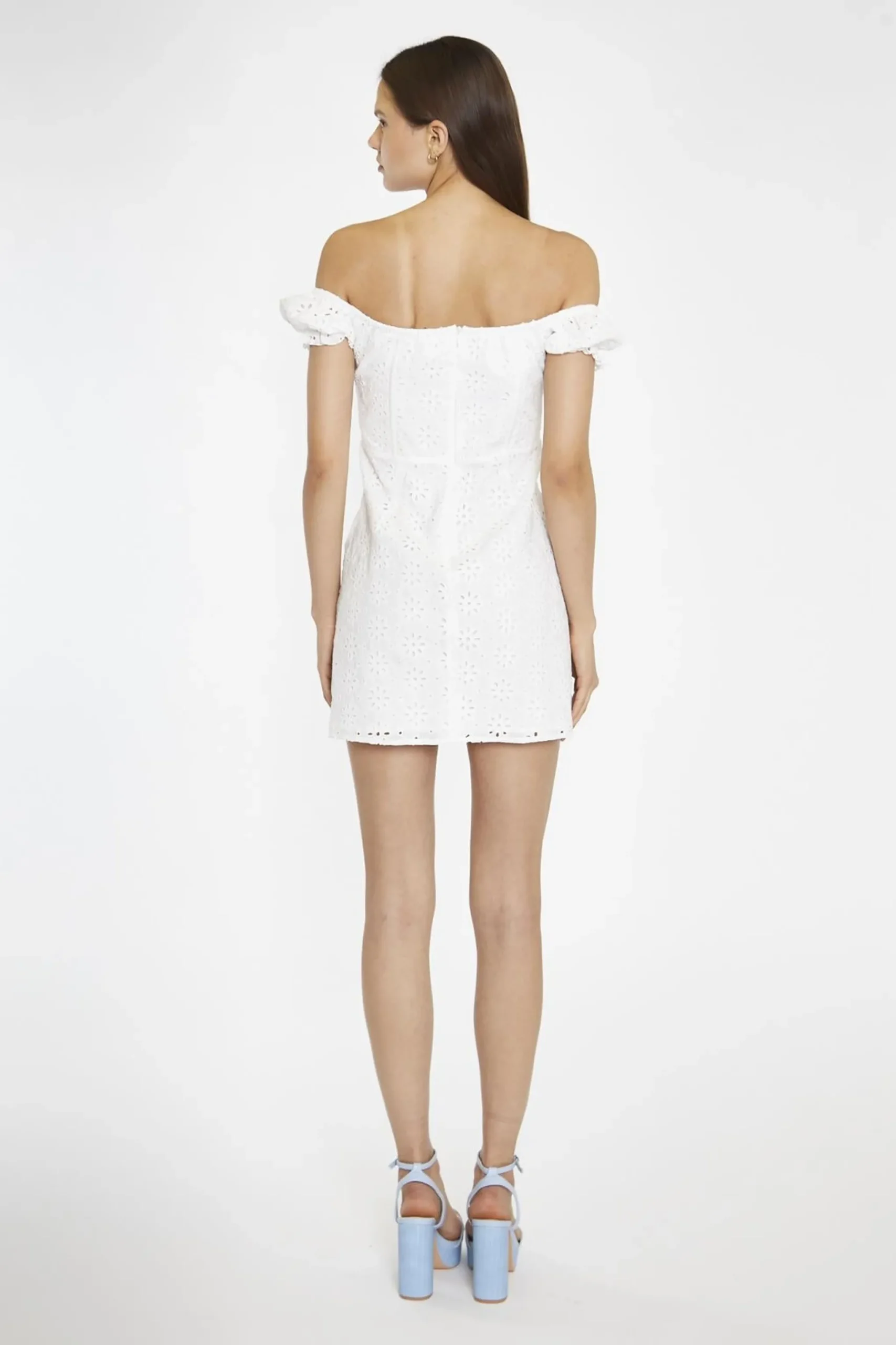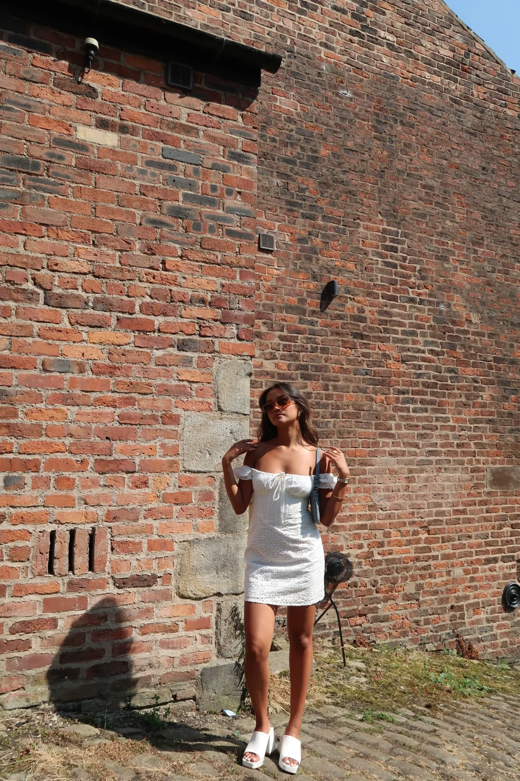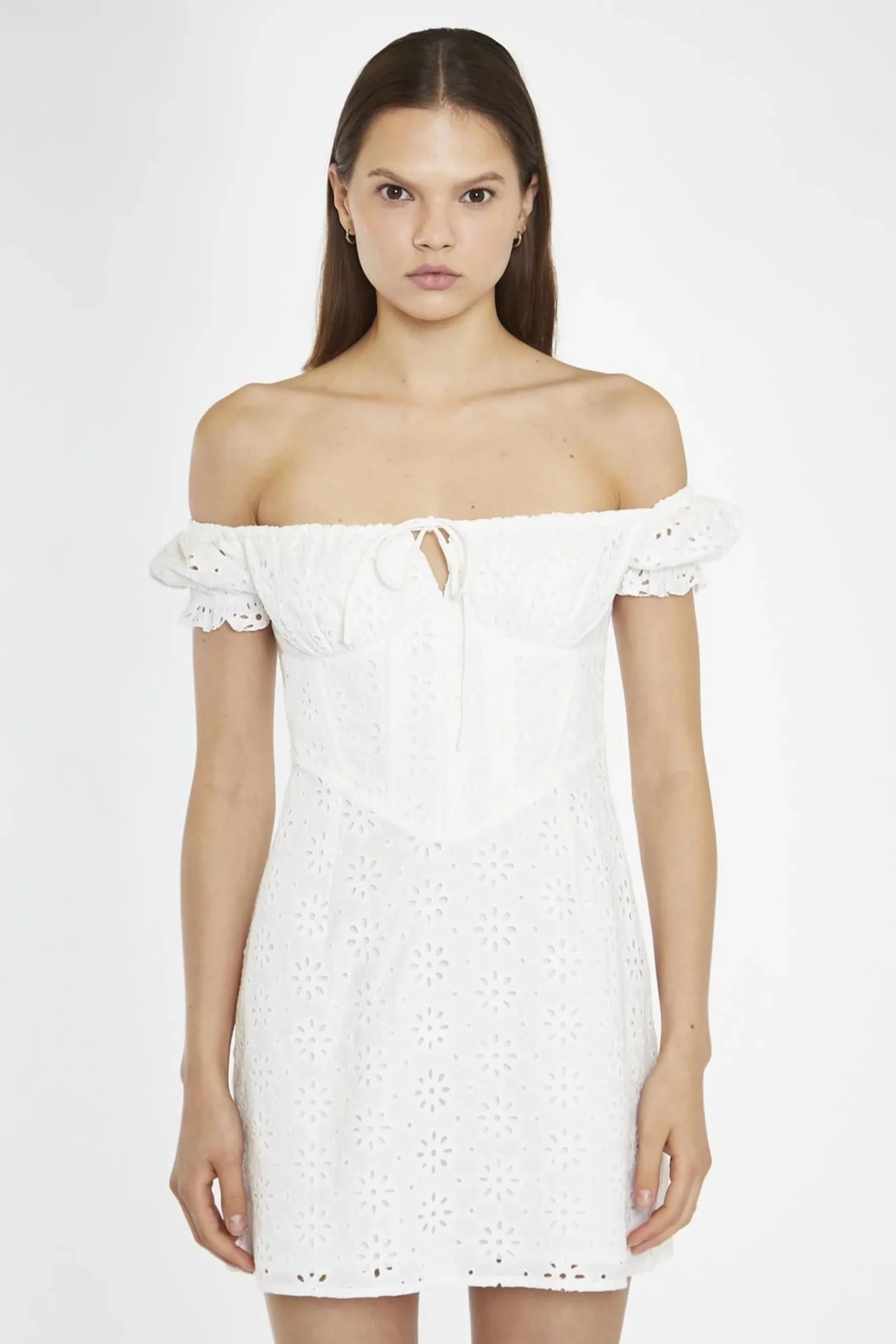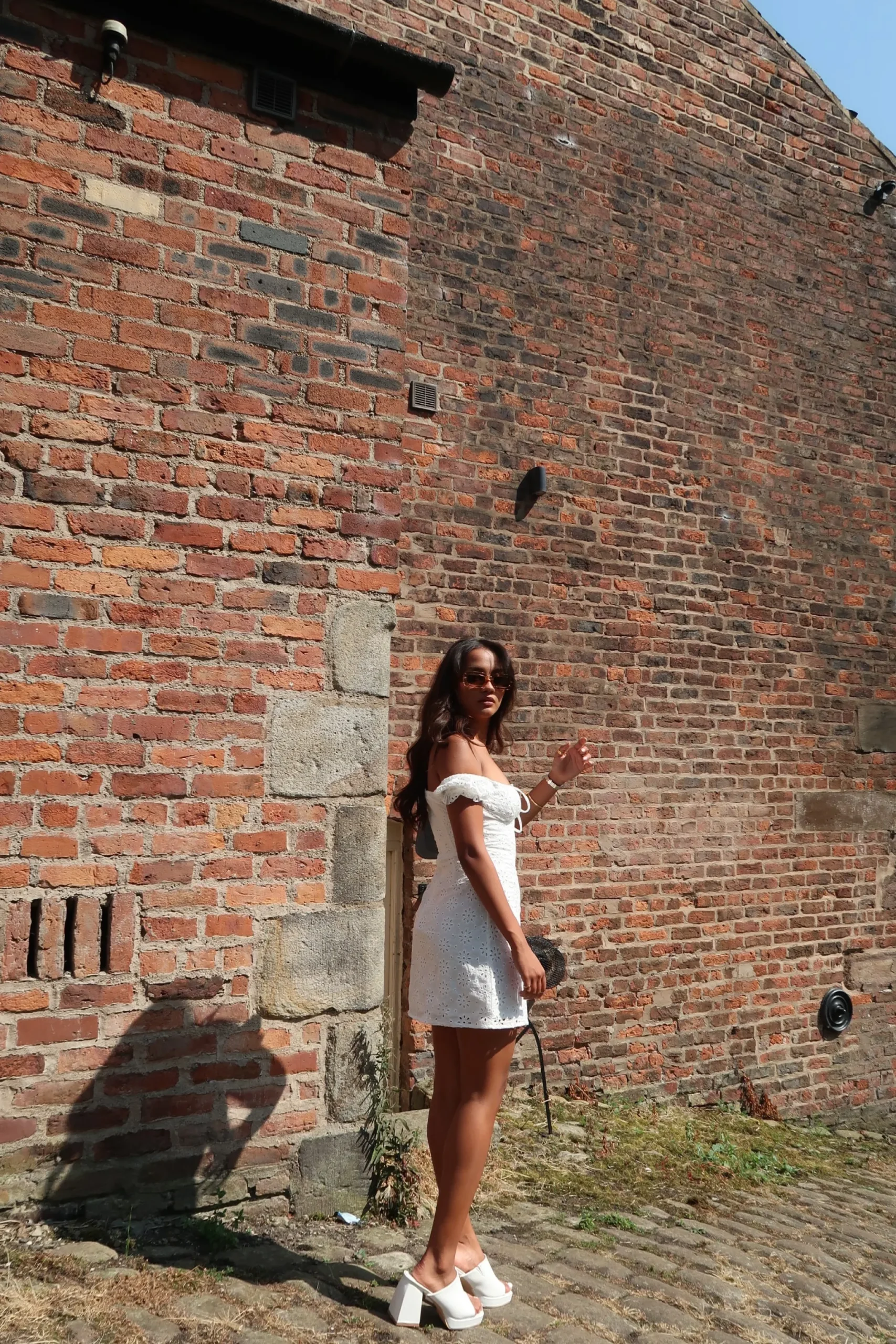 Glamorous Women’s White-Broderie Bardot Corset Mini-Dress. Elevate your style with our White-Broderie Bardot Corset Mini-Dress. Featuring a Bardot neckline and corset bodice, this dress will accentuate your figure. The milkmaid style neckline and puff sleeves add a touch of femininity, while the fitted skirt and mini length add a modern edge. Style with a denim jacket and trainers for a cute day time look!