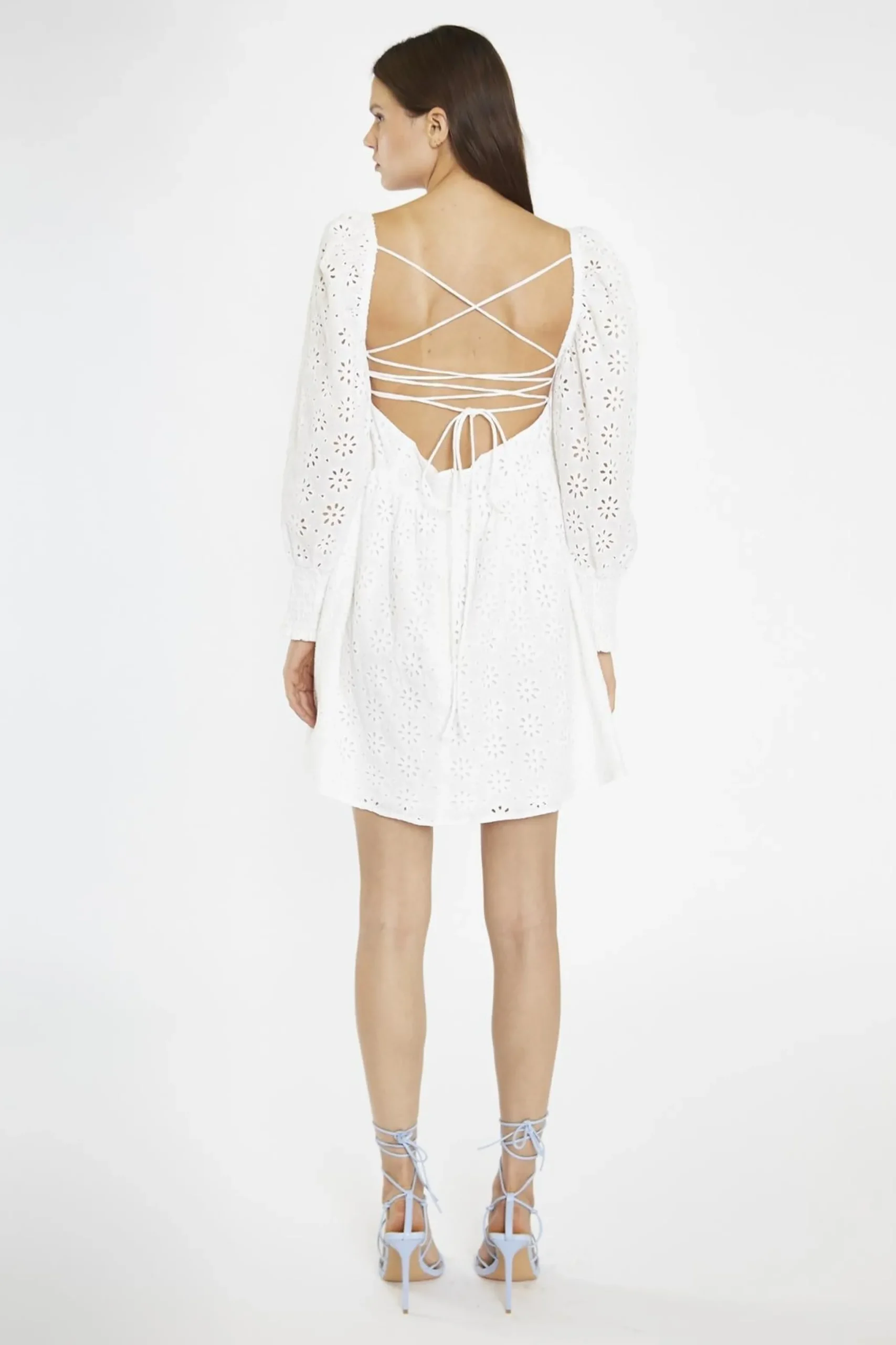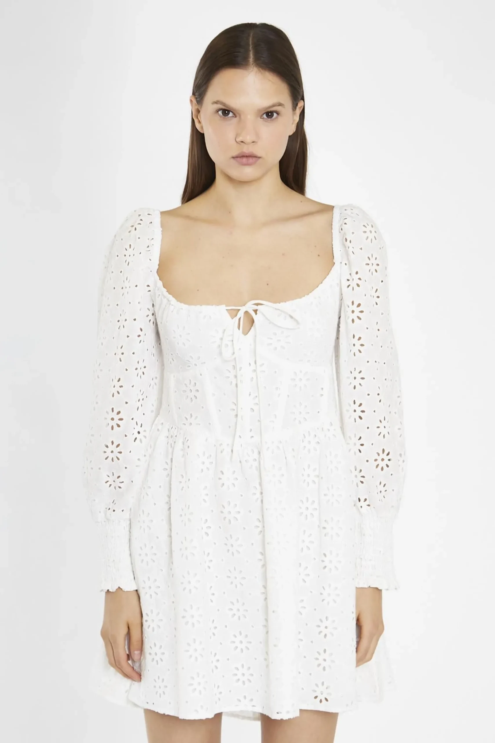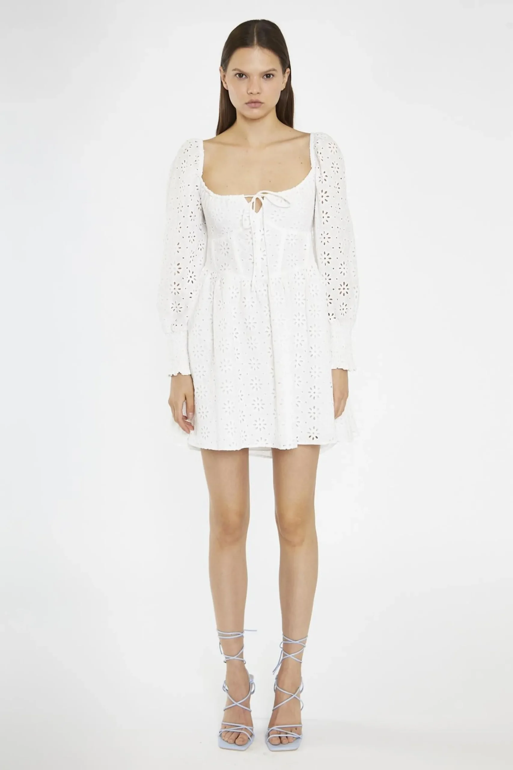 Glamorous Women’s White-Broderie Lace-Up Corset Mini-Dress. Flaunt your playful and daring side in our Lace-Up Corset Mini-Dress. With its milkmaid style neckline, corset bodice structure, and lace up back design, this dress adds a touch of whimsy to your wardrobe. The long cuffed sleeves and mini length complete the look, all in a soft and delicate broderie fabric. Time to show off your unique style!