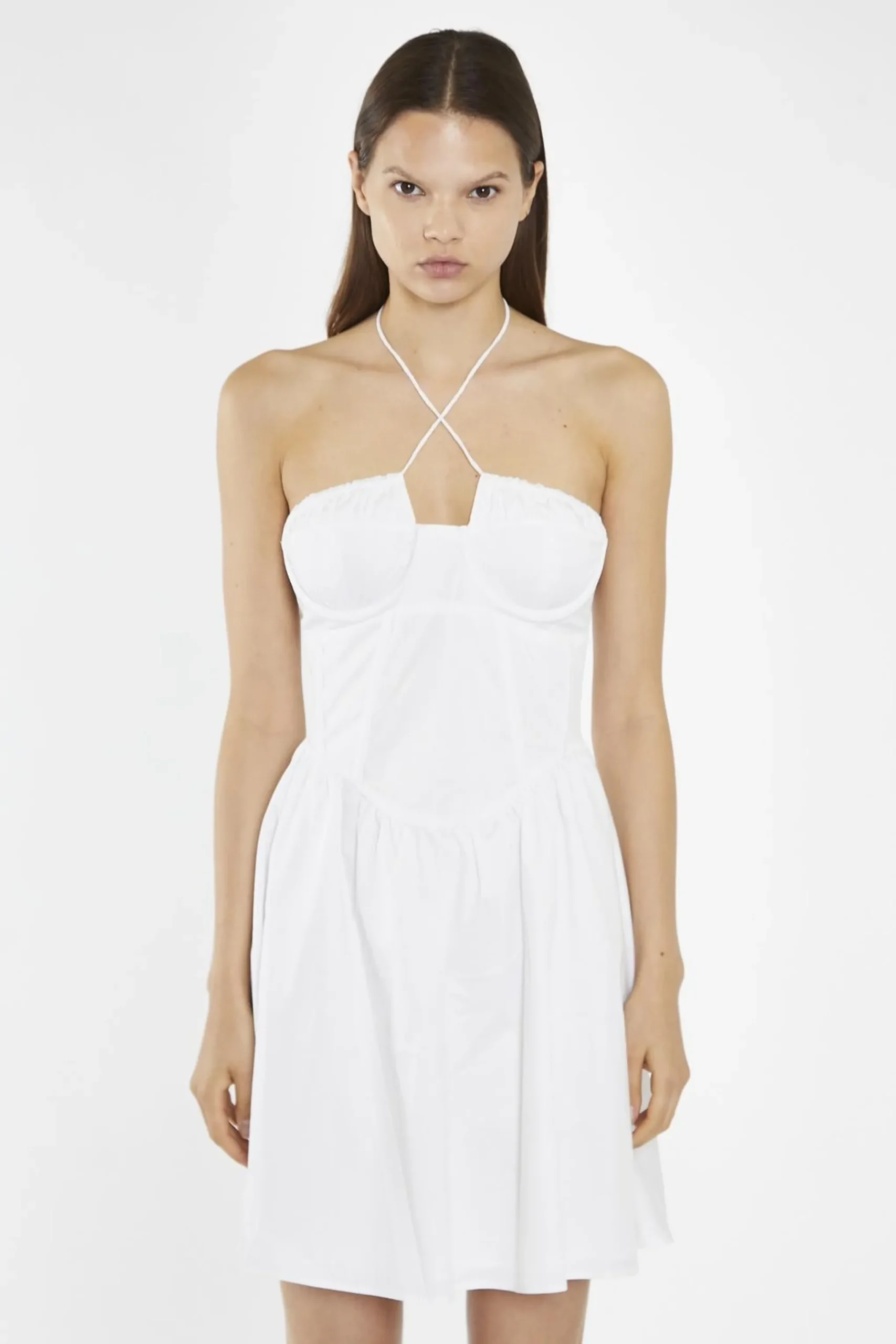 Glamorous Women’s White Halterneck Corset Mini-Dress. Be the center of attention in this flirty White Halterneck Mini-Dress. Its cross over halterneck and gathered bust cup detail add a touch of playfulness while the corset structure and curved waist seam accentuate your figure. The gathered skirt and mini length complete the look for a fun and stylish outfit. Dress this piece up or down with accessories, its the perfect versatile spring dress!