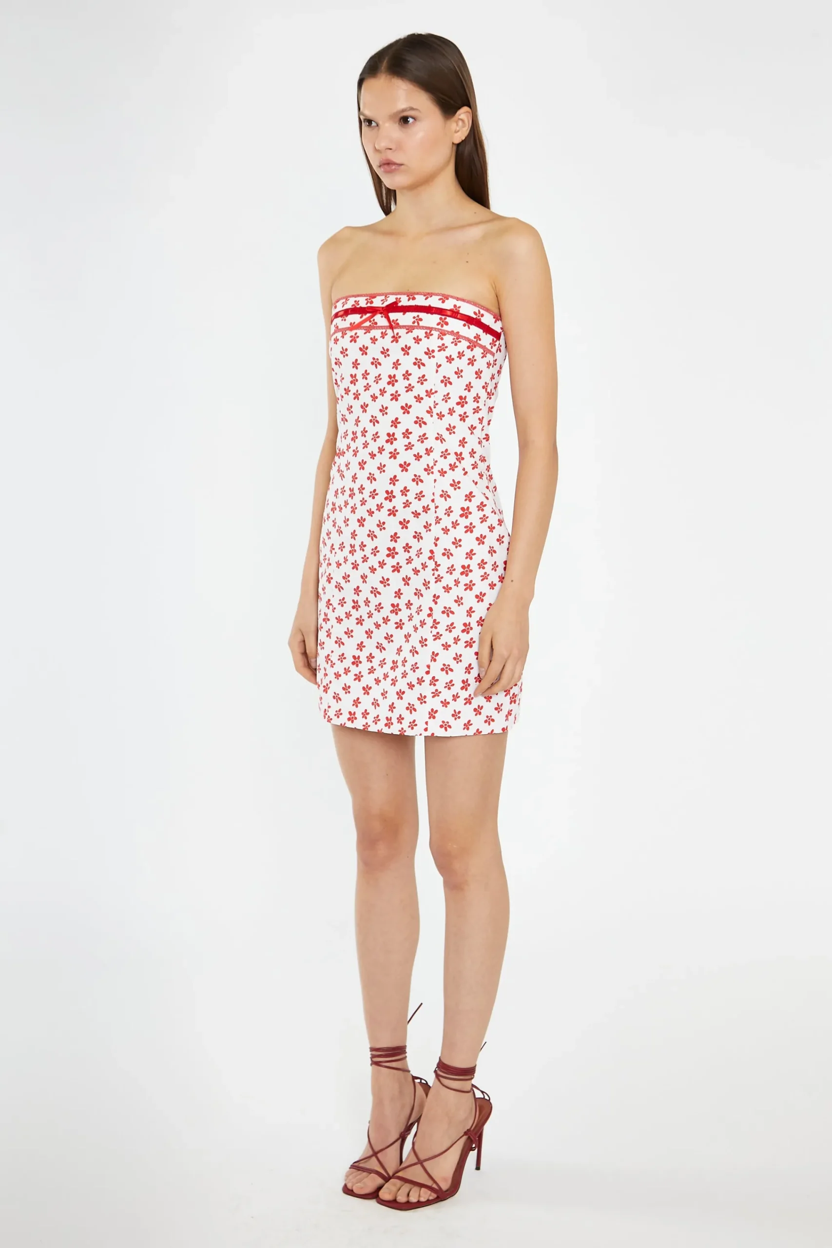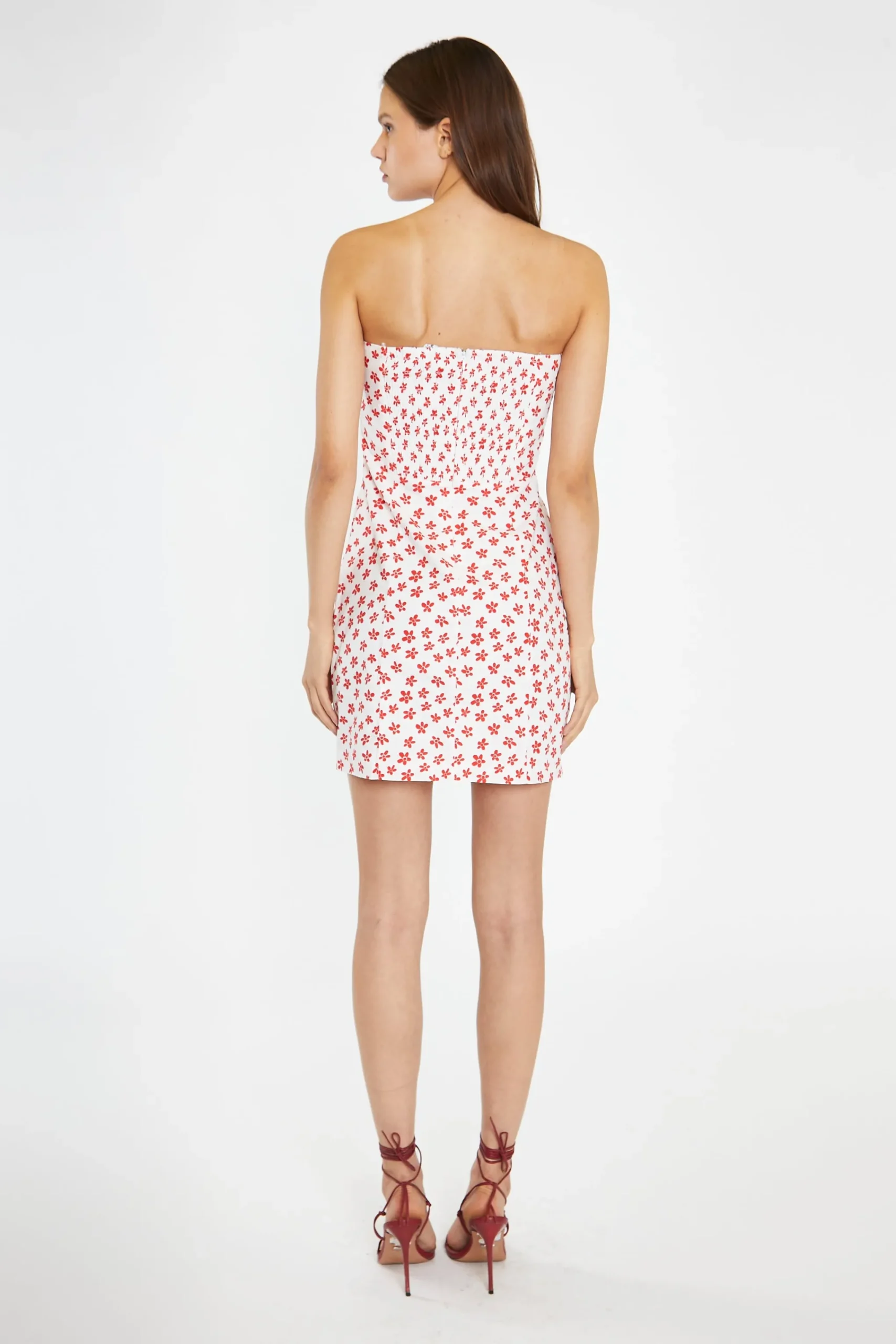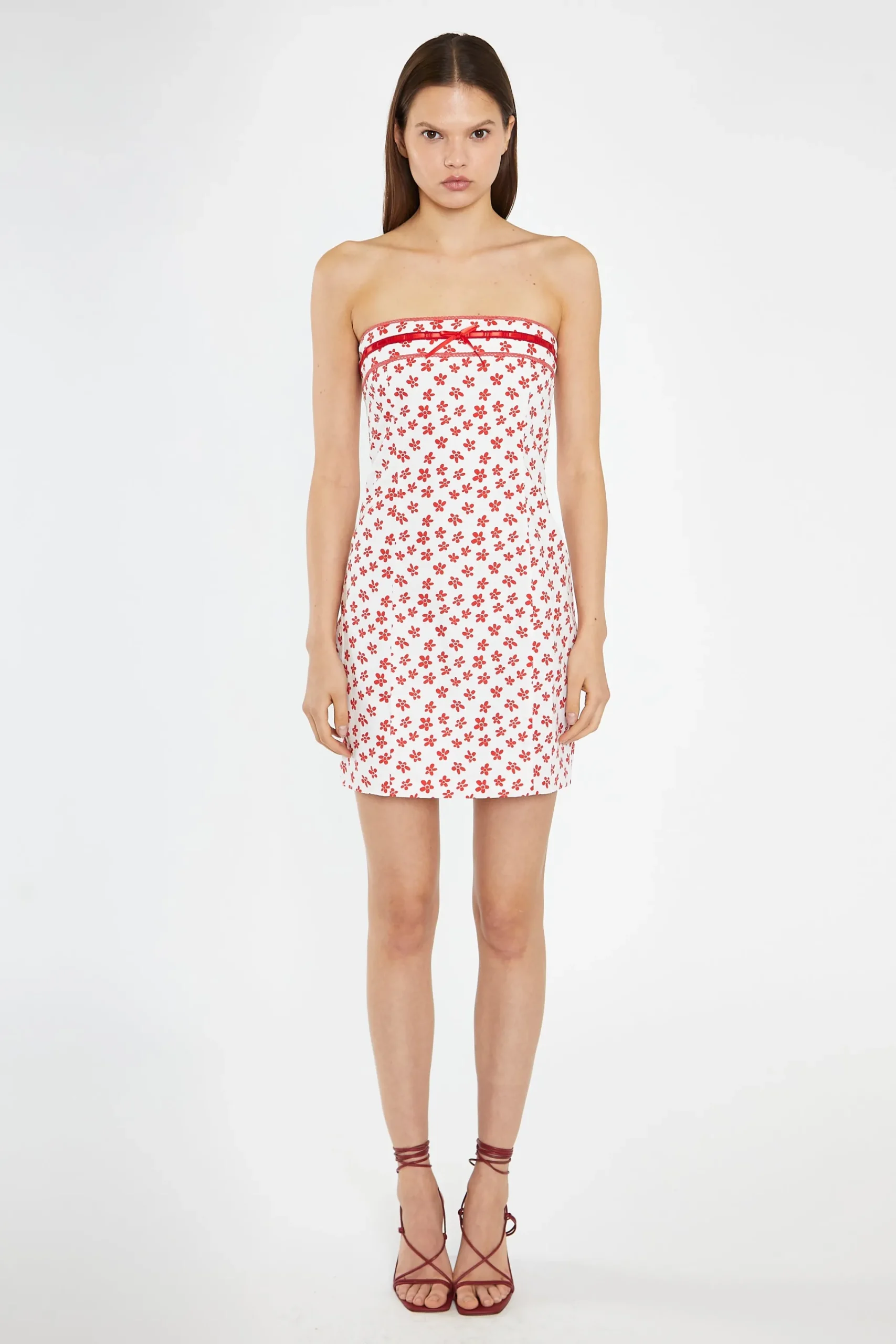 Glamorous Women’s White-Red Daisy Fitted Bandeau Mini-Dress. Turn heads with this flirty White-Red Daisy Mini-Dress. The bandeau neckline and fitted silhouette accentuate your curves, while the shirred back panel ensures a comfortable fit. The delicate lace trim adds a touch of romance to this mini length dress. Perfect for any occasion, we absolutely love this dress!