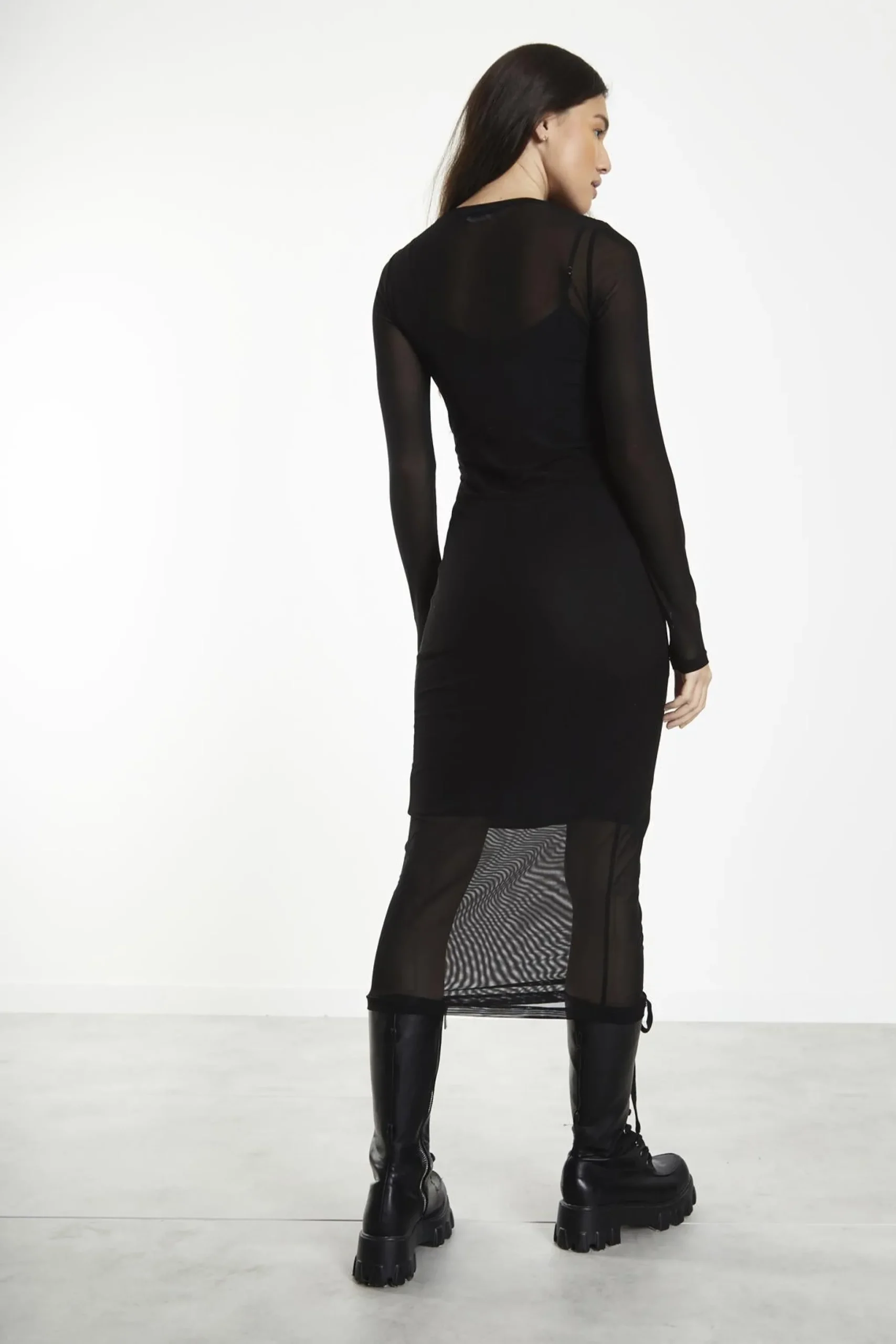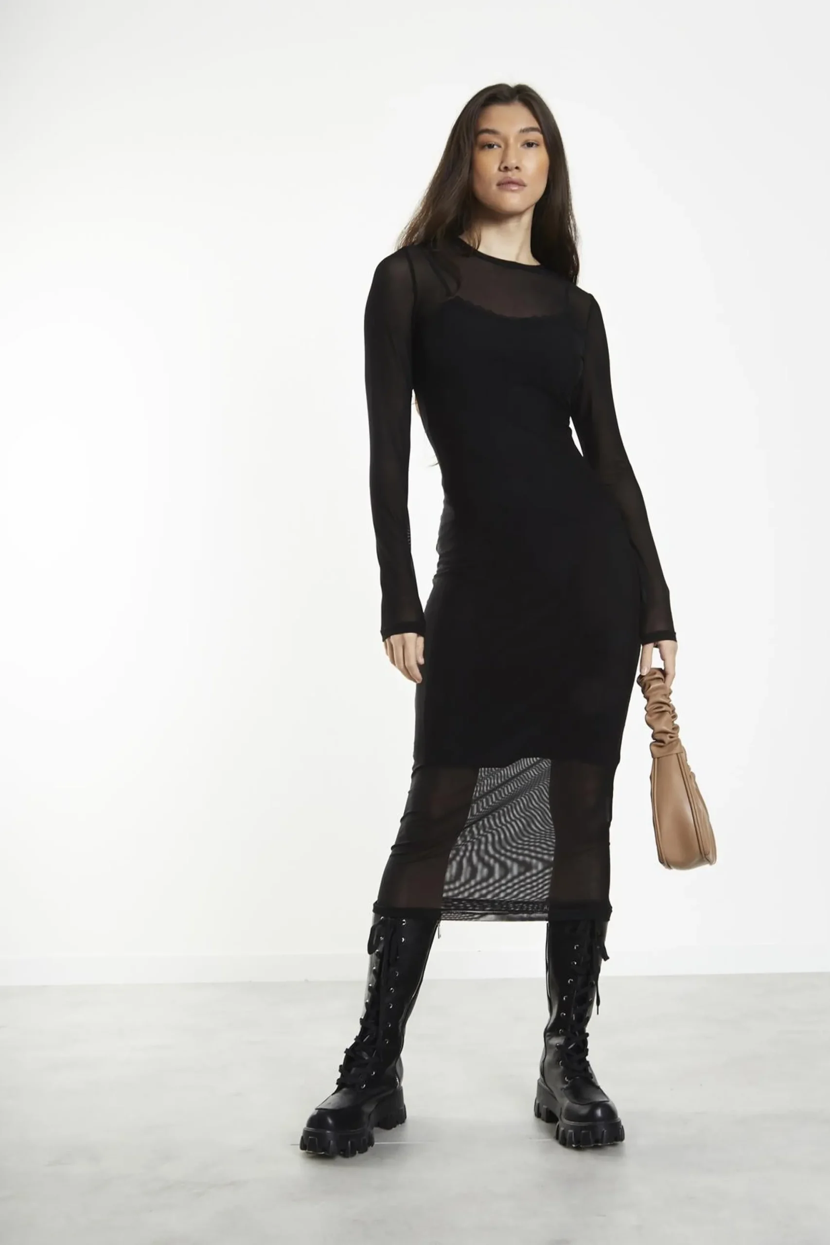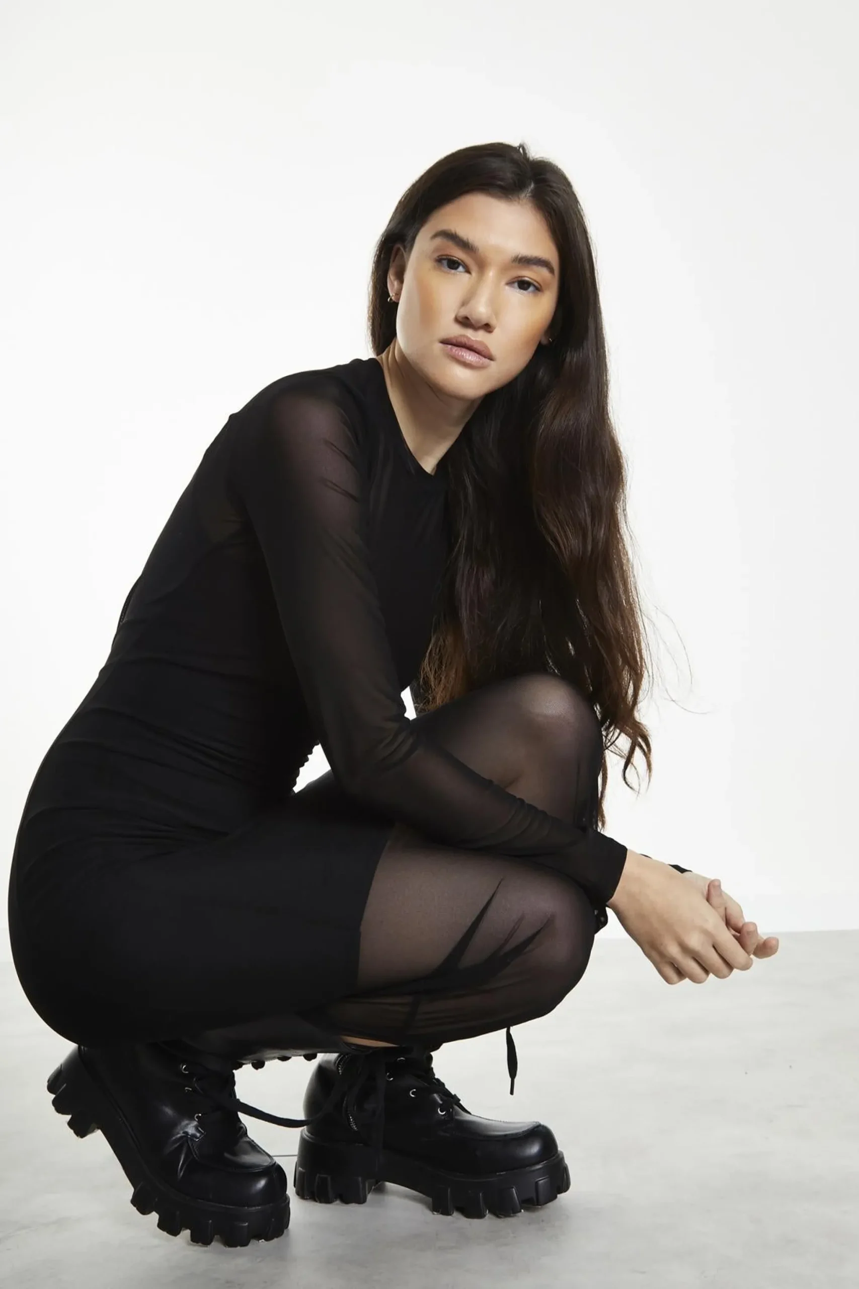 Glamorous Women’s Black Mesh Crew Neck Midi-Dresses. Turn heads and feel fabulous in our Black Mesh Crew Neck Midi-Dress. This stunning piece is all about making a statement without saying a word. The sheer mesh fabric adds a touch of mystery and allure, perfect for those nights when you want to feel extra special. The crew neck keeps things classy, while the long sleeves offer a bit of coverage and versatility. This midi-length dress hits that sweet spot between flirty and elegant, making it ideal for a range of occasions. Layer it over a slip dress for a more modest look, or go bold with contrasting undergarments to really make it pop. The possibilities are endless! This dress is like your own personal confidence booster – slip it on and watch your swagger skyrocket. From gallery openings to dance floors, this mesh marvel is ready to help you steal the show. So why blend in when you can stand out? Add this showstopper to your wardrobe and get ready to turn every outing into your personal runway.
