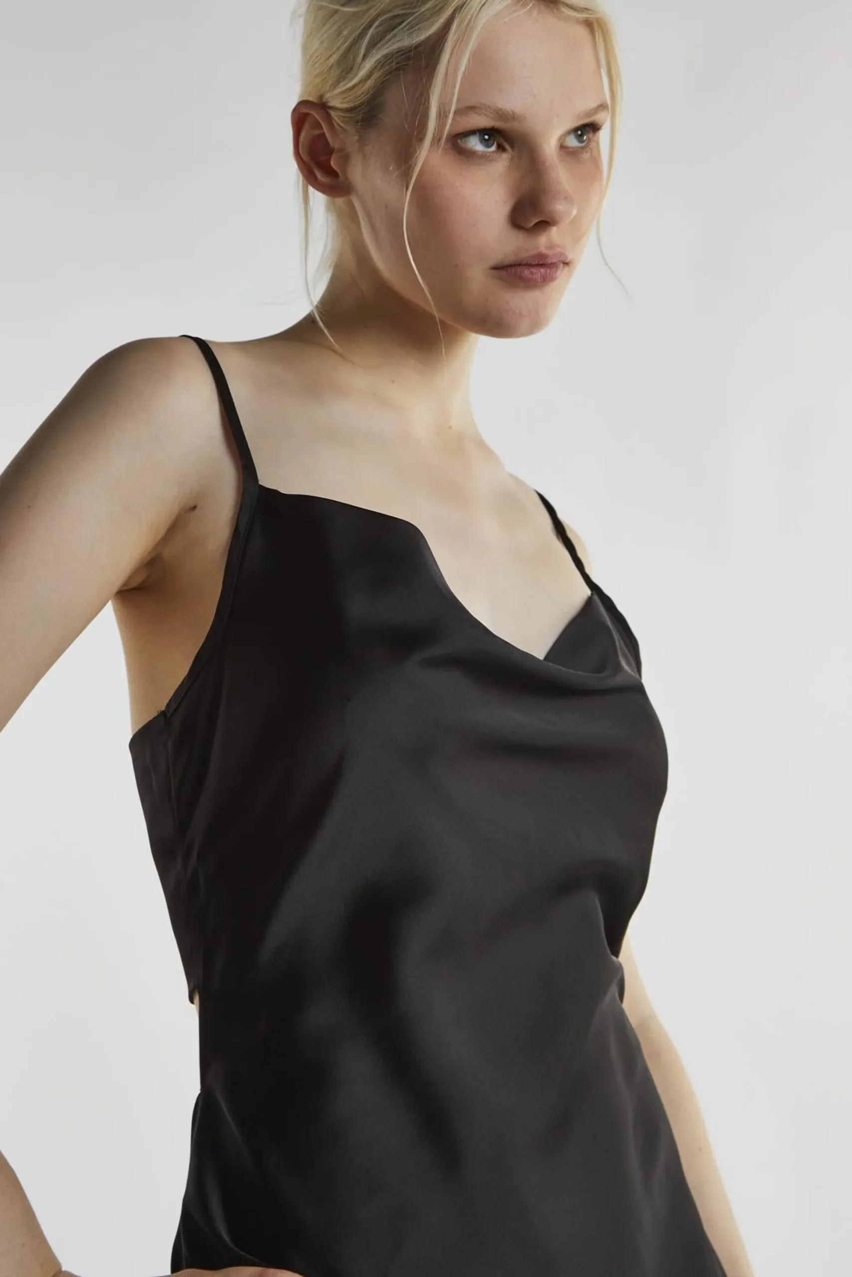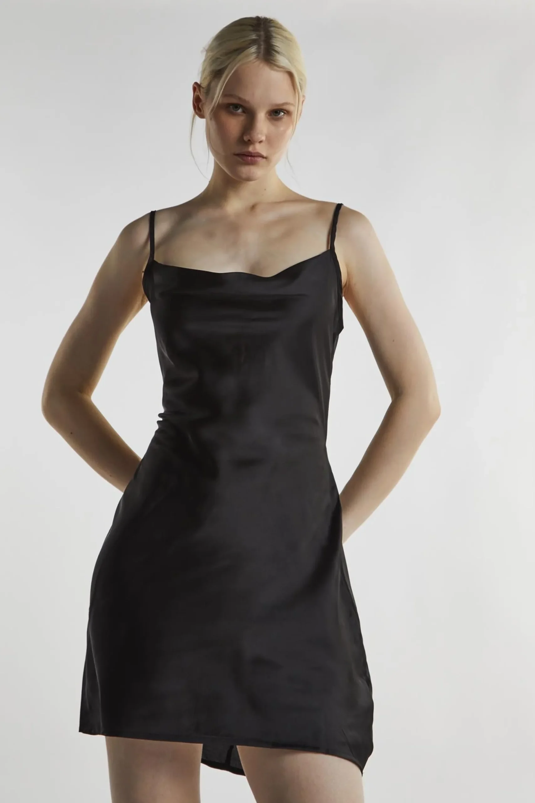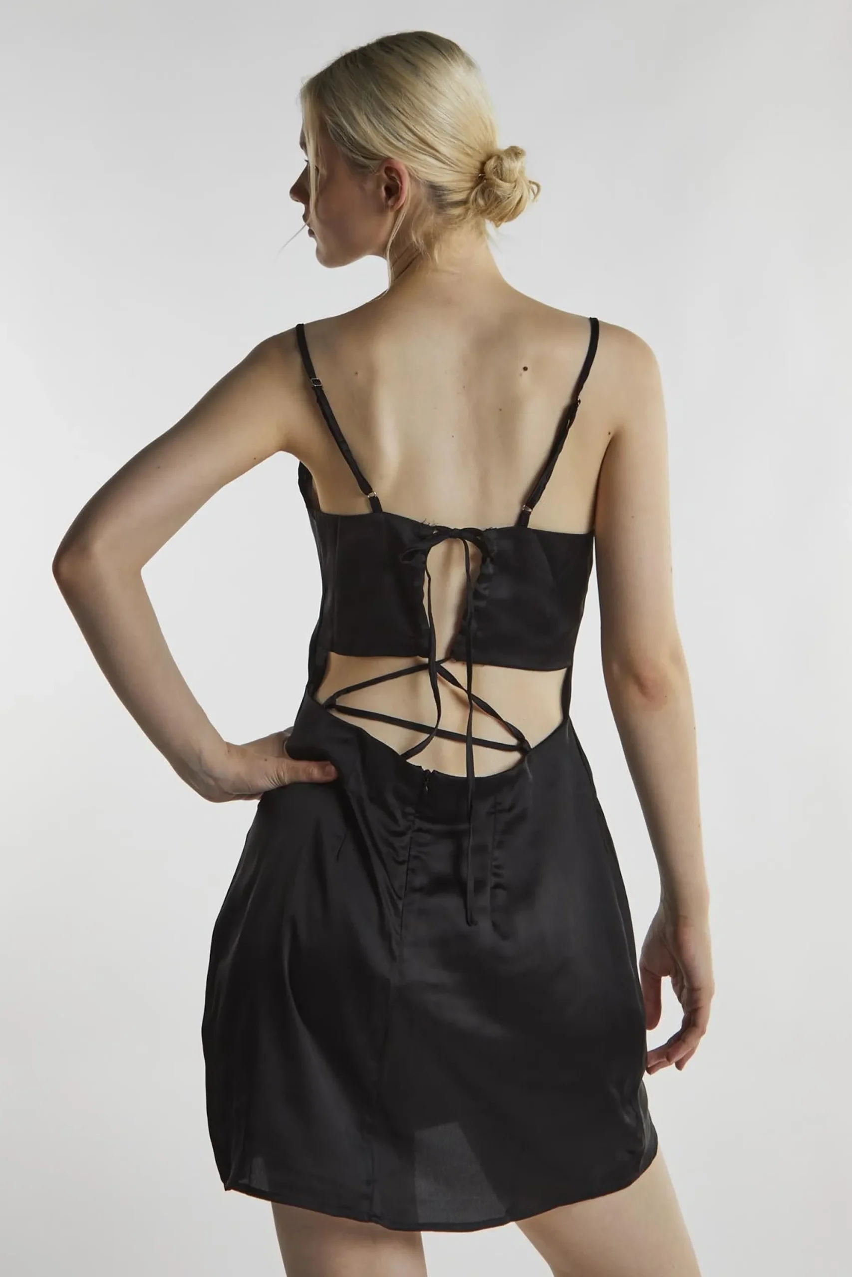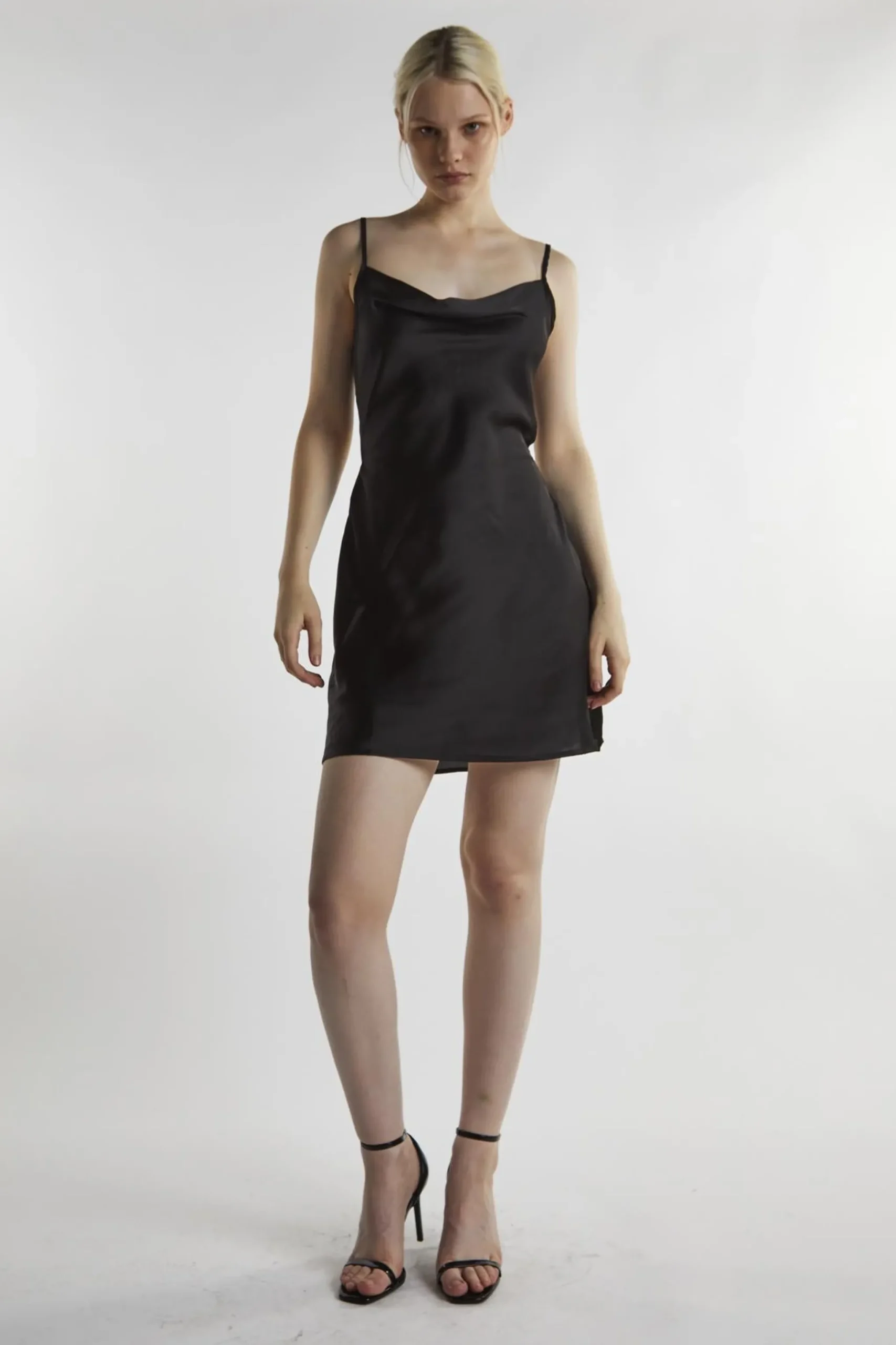 Glamorous Women’s Black-Satin Tie-Back Mini-Dress. Say hello to your new favourite little black dress: the Black Satin Tie-Back Mini-Dress. This stunner is crafted from luxurious satin that feels amazing against your skin and catches the light in all the right ways. The cowl neckline adds a touch of elegance, draping beautifully to create a flattering silhouette. Turn heads with the alluring tie-back detail, adding a dash of intrigue to your look. The bias-cut design hugs your curves just right, moving with you for ultimate comfort. With its mini length, this dress is perfect for showing off your legs and your favourite heels. It’s a versatile piece that works for date nights, cocktail parties, or any occasion where you want to feel fabulous. Dress it up with strappy sandals and statement jewellery, or keep it casual with ankle boots and a denim jacket. This Black Satin Tie-Back Mini-Dress is more than just a dress—it’s a confidence booster that’ll have you feeling like the belle of any ball.