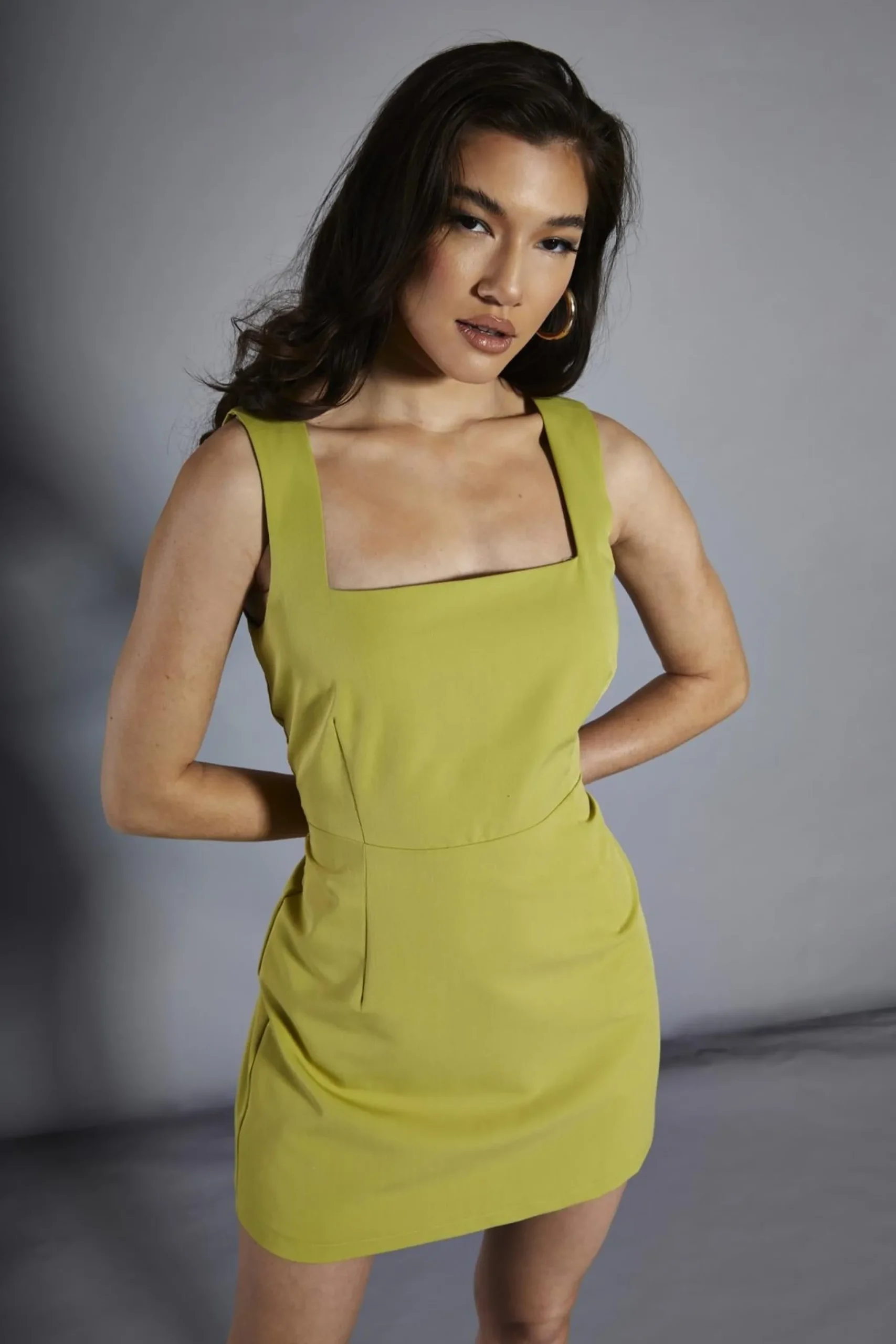 Glamorous Studio Women’s Chartreuse-Green Square-Neck Mini-Dress. Say hello to your new favourite party piece – the Chartreuse Green Square Neck Short Dress! This little number is here to make sure you stand out from the crowd in the best way possible. The vibrant chartreuse green colour is a real mood-lifter, guaranteed to bring a smile to your face and turn heads wherever you go. The square neckline adds a modern, trendy touch that’s both flattering and fun. And let’s talk about that A-line silhouette – it’s like magic, skimming over your curves and creating a beautiful shape. The sleeveless design is perfect for those warm summer nights or for showing off your favourite statement jewellery. This dress is versatile enough to take you from brunch with the girls to a night out on the town. Pair it with sneakers for a casual cool look, or dress it up with heels and bold accessories for a knockout evening ensemble. So why settle for boring when you can rock this eye-catching chartreuse dream? It’s time to add a splash of colour to your wardrobe and let your personality shine!