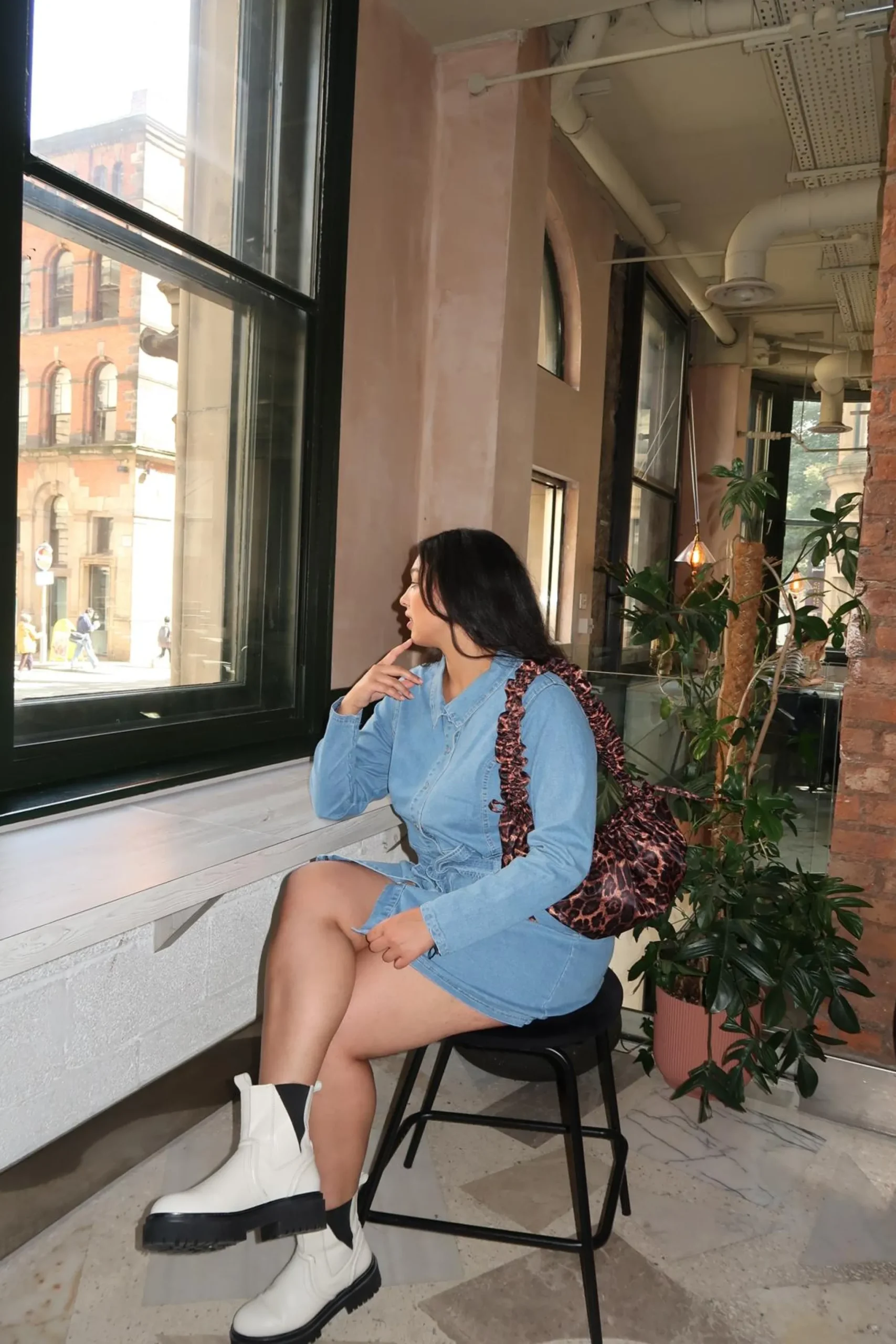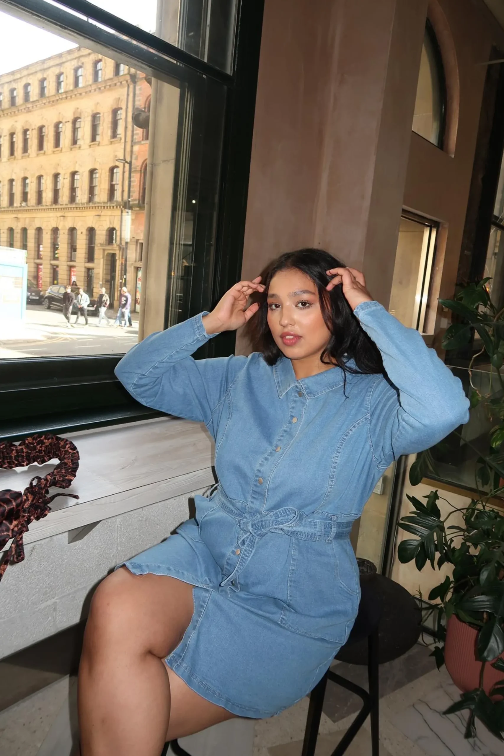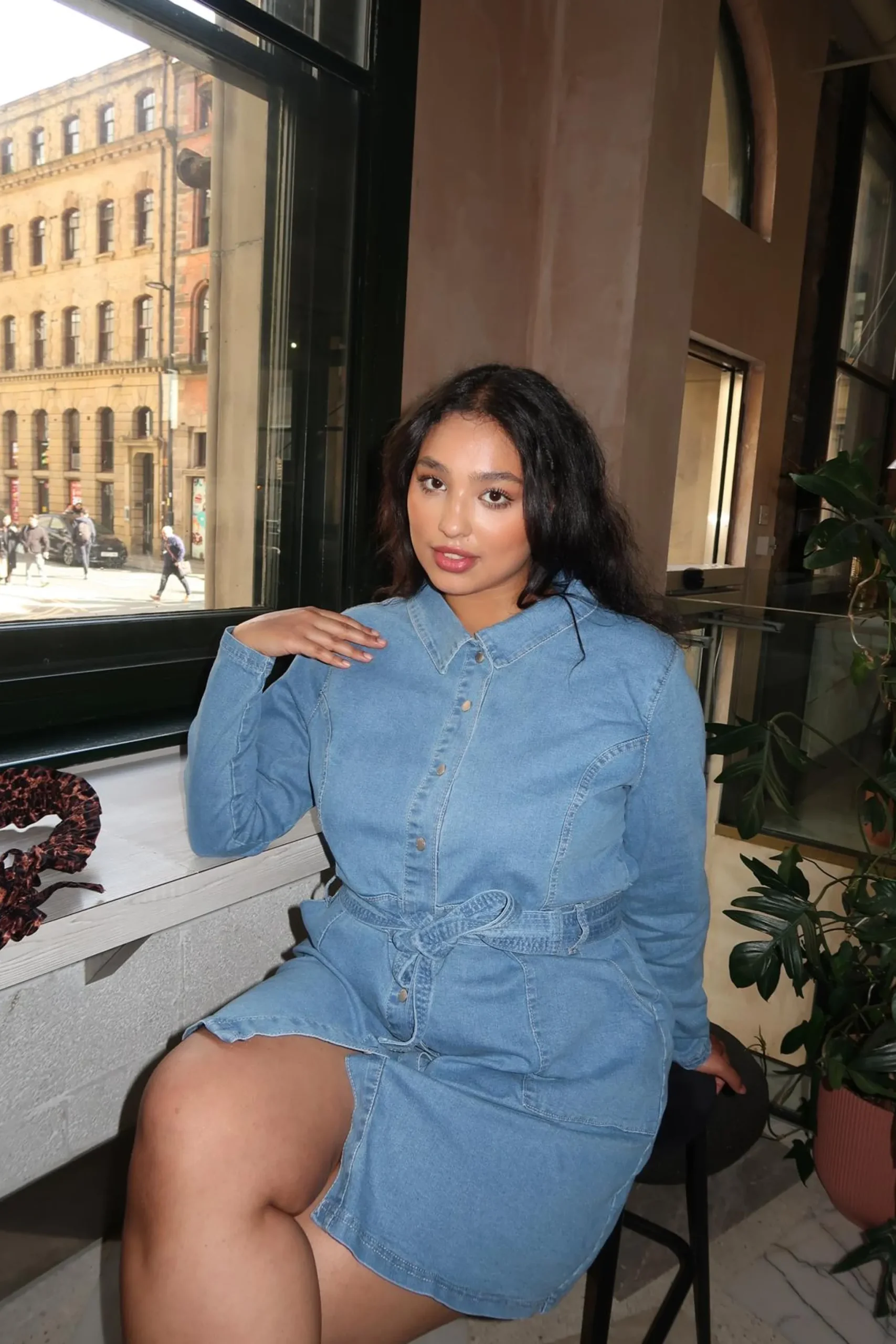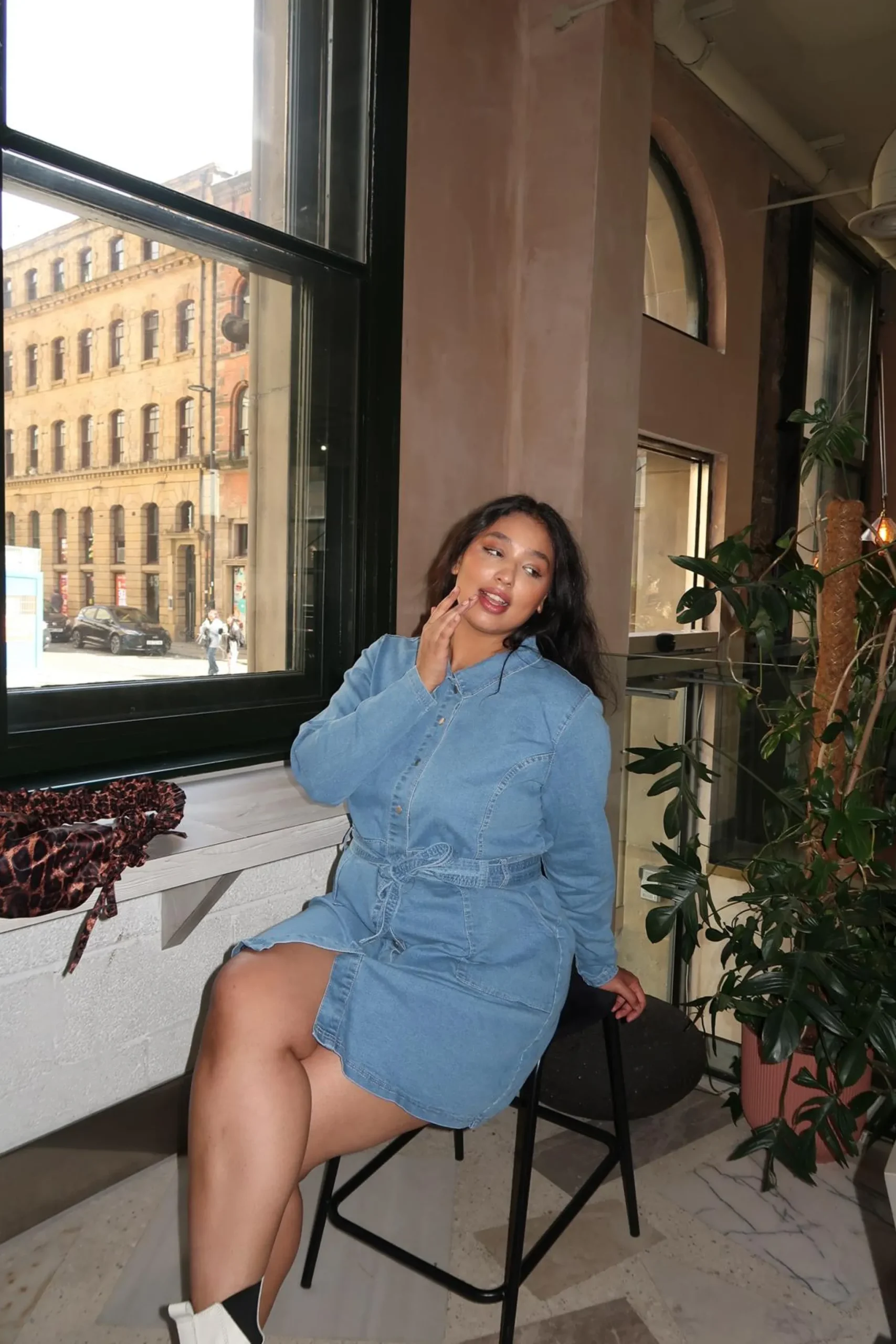 Glamorous Women’s Light stone wash Midi-denim . This light stone wash midi-denim dress brings a fresh and relaxed vibe to your wardrobe. The button-front design makes it easy to wear, while the tie waist allows you to adjust the fit to your liking, giving you a flattering shape. With long sleeves, it’s perfect for transitioning between seasons, offering a bit of coverage while keeping the look casual. The soft denim fabric adds just the right amount of structure without feeling too heavy, making it a comfortable option for all-day wear. Pair it with sneakers for an everyday look or dress it up with boots for a more polished feel. It’s a versatile piece that works in any season.