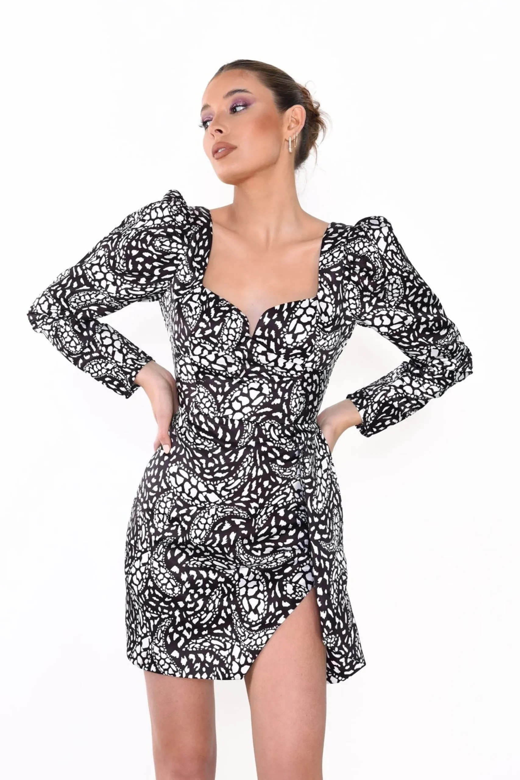 Glamorous women’s Black White Abstract Mono Satin Long Sleeve Mini Dress. Opt for an on trend piece with this abstract mono Satin mini dress. This super flattering dress features long sleeves, side split detail. Style with chunky boots for the daytimes and heels for the evening! We love this piece here at