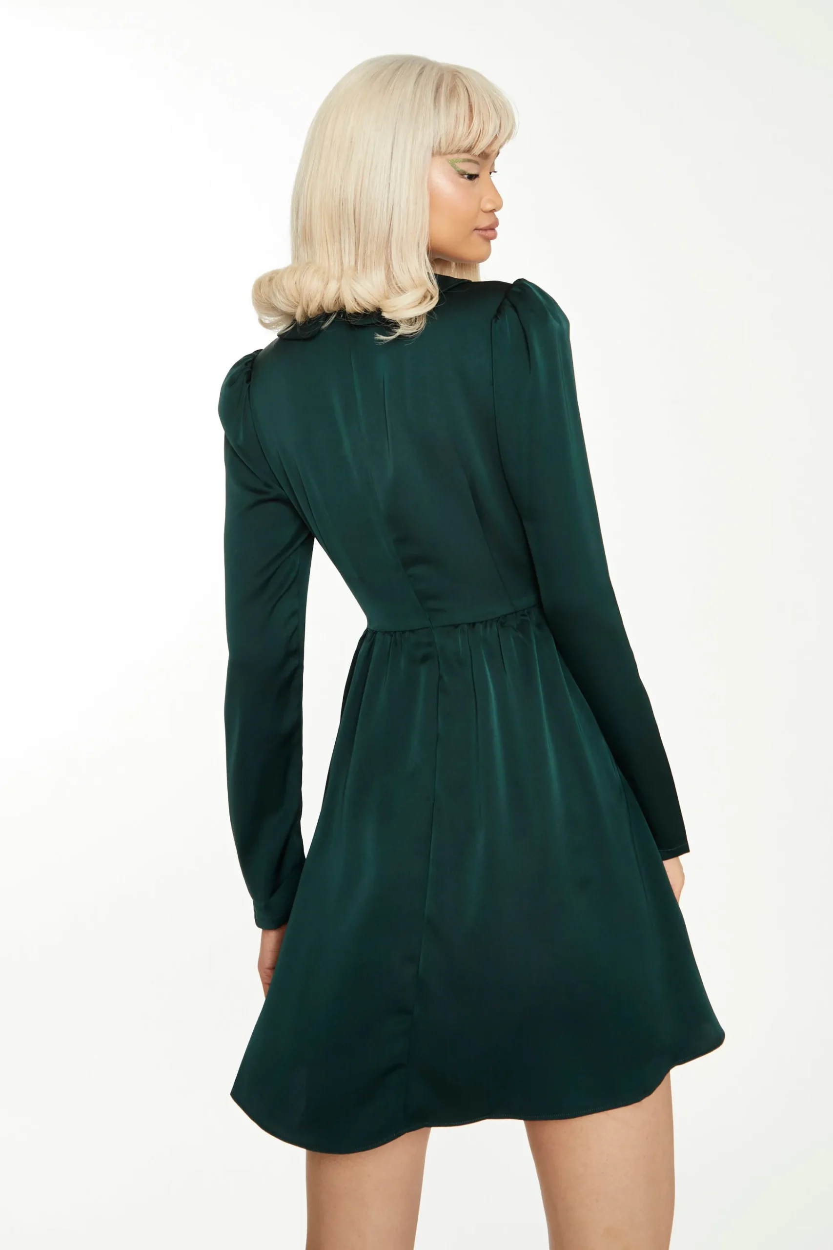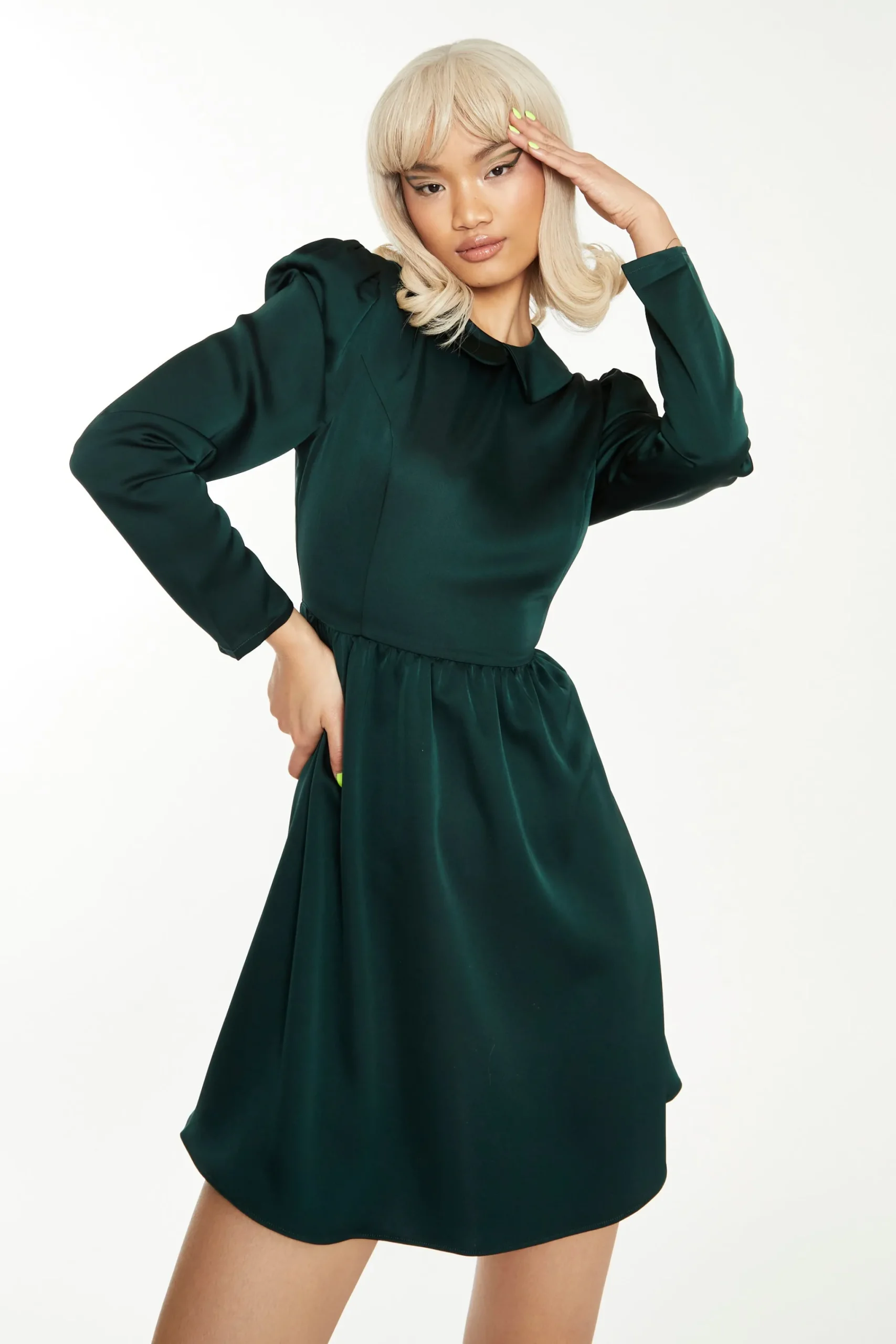 Glamorous Dark Green Satin Collared Skater Mini Dress. This staple mini dress is perfect for your winter wardrobe. Featuring a long sleeves, collar and flattering skater skirt shape, we love this timeless piece here at Glamorous. Elevate the look with some strappy heels to take it from day to night.