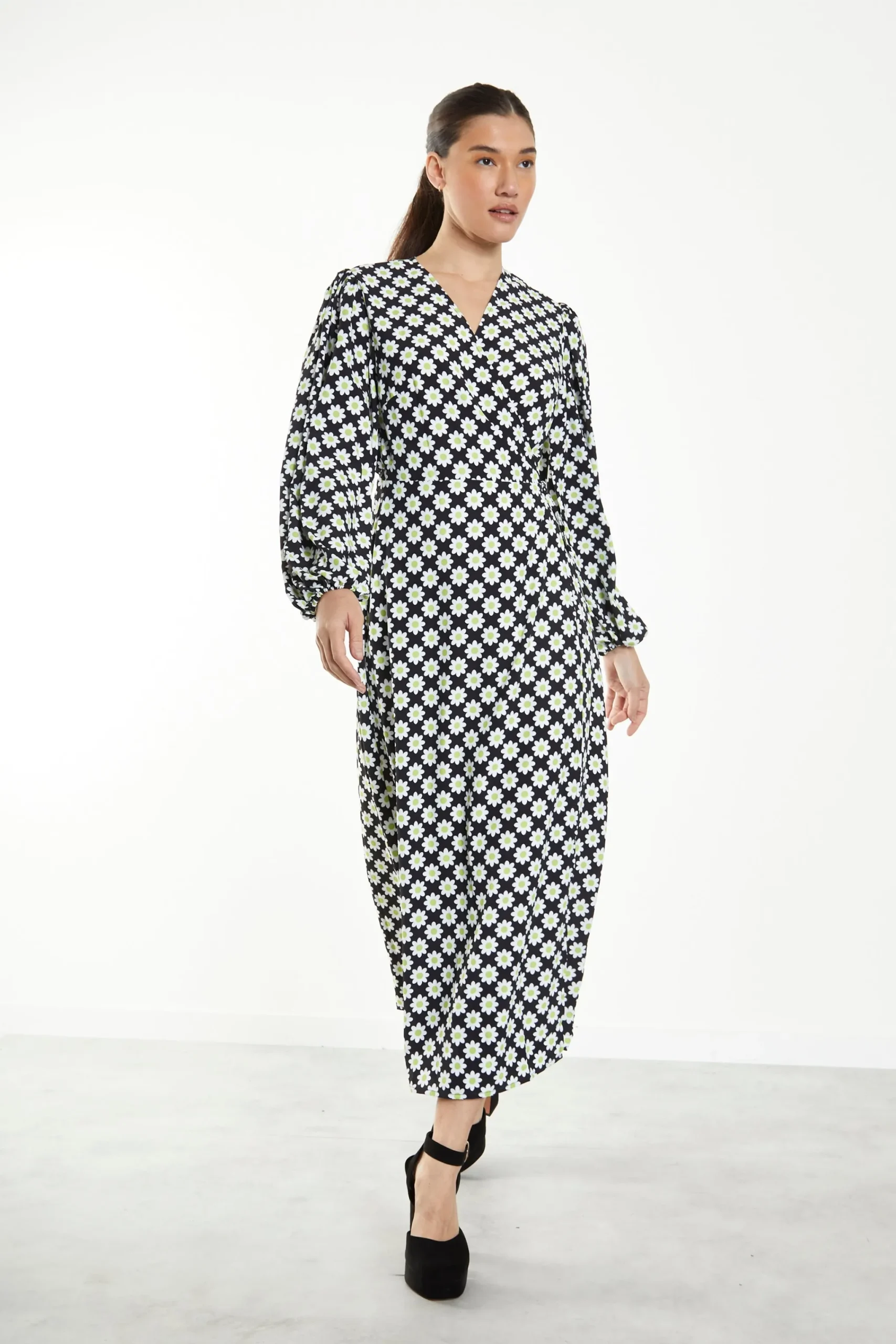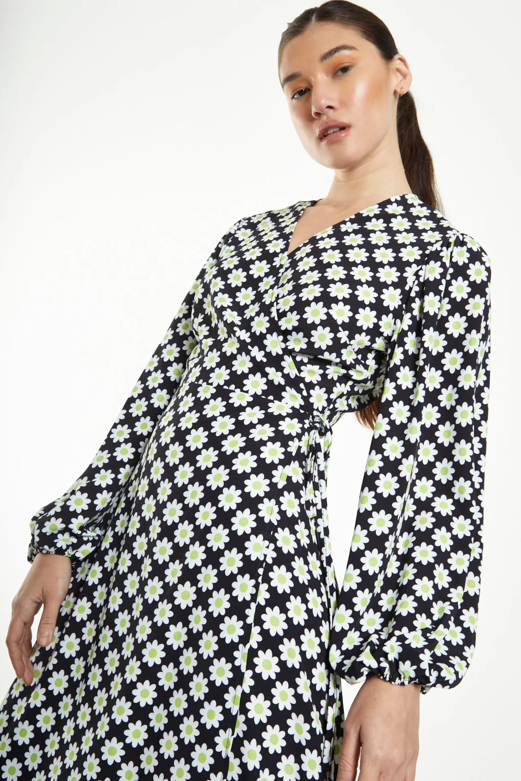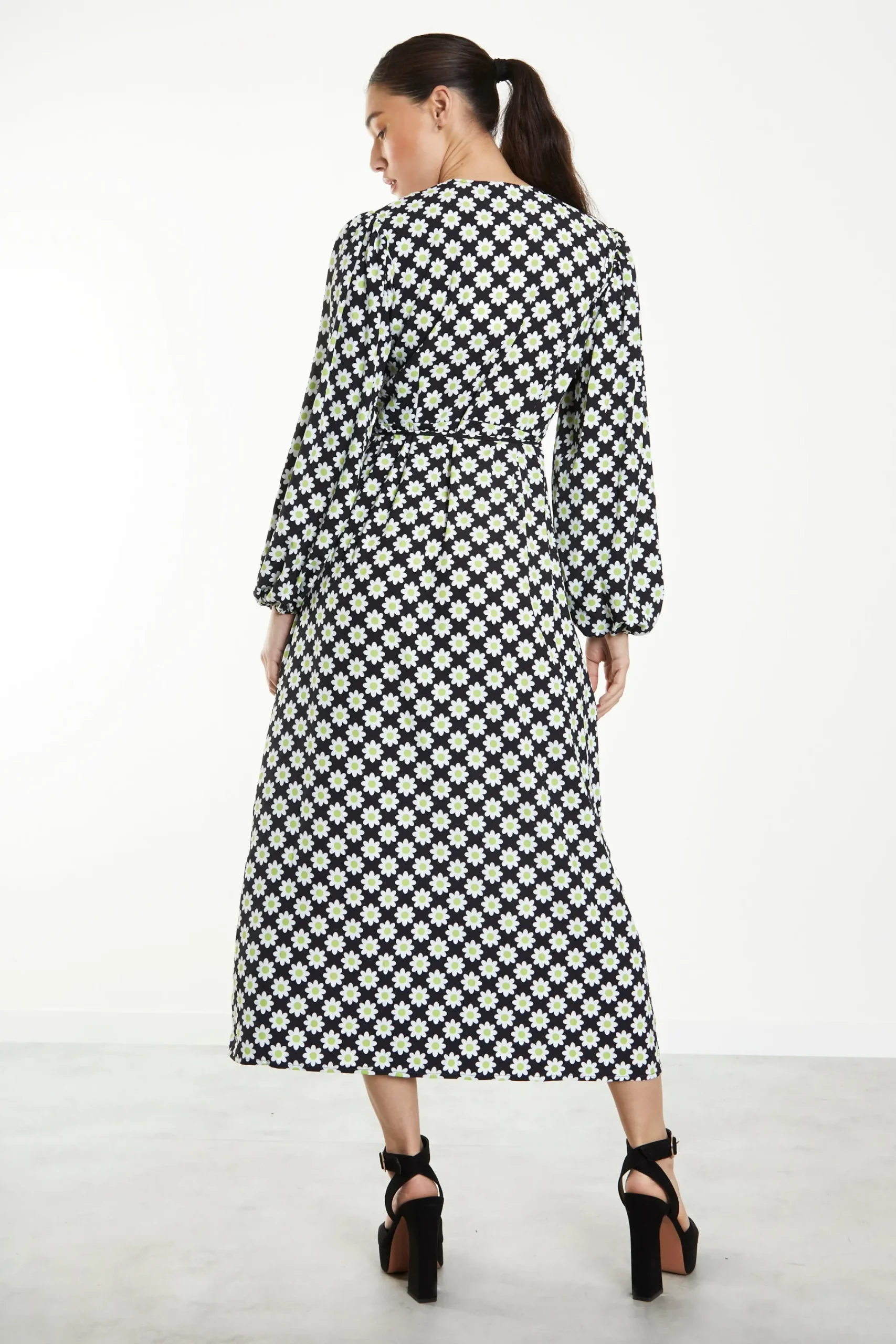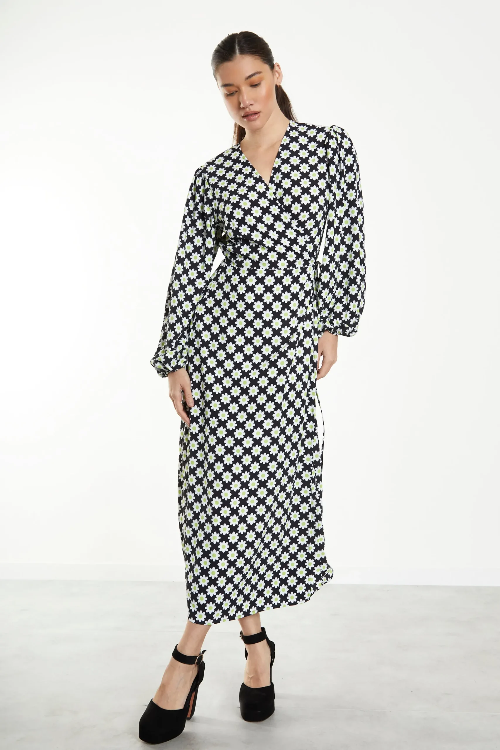 Glamorous Sixties Flower Long Sleeve Wrap Midi Dress. Fashion forward and feminine, this sixties flower print midi dress is the perfect daytime look. Featuring a flattering wrap cut, long sleeves and v-neckline, this wrap dress will not fail to impress. Take the outfit from day to night with some strappy heels and a shoulder bag.