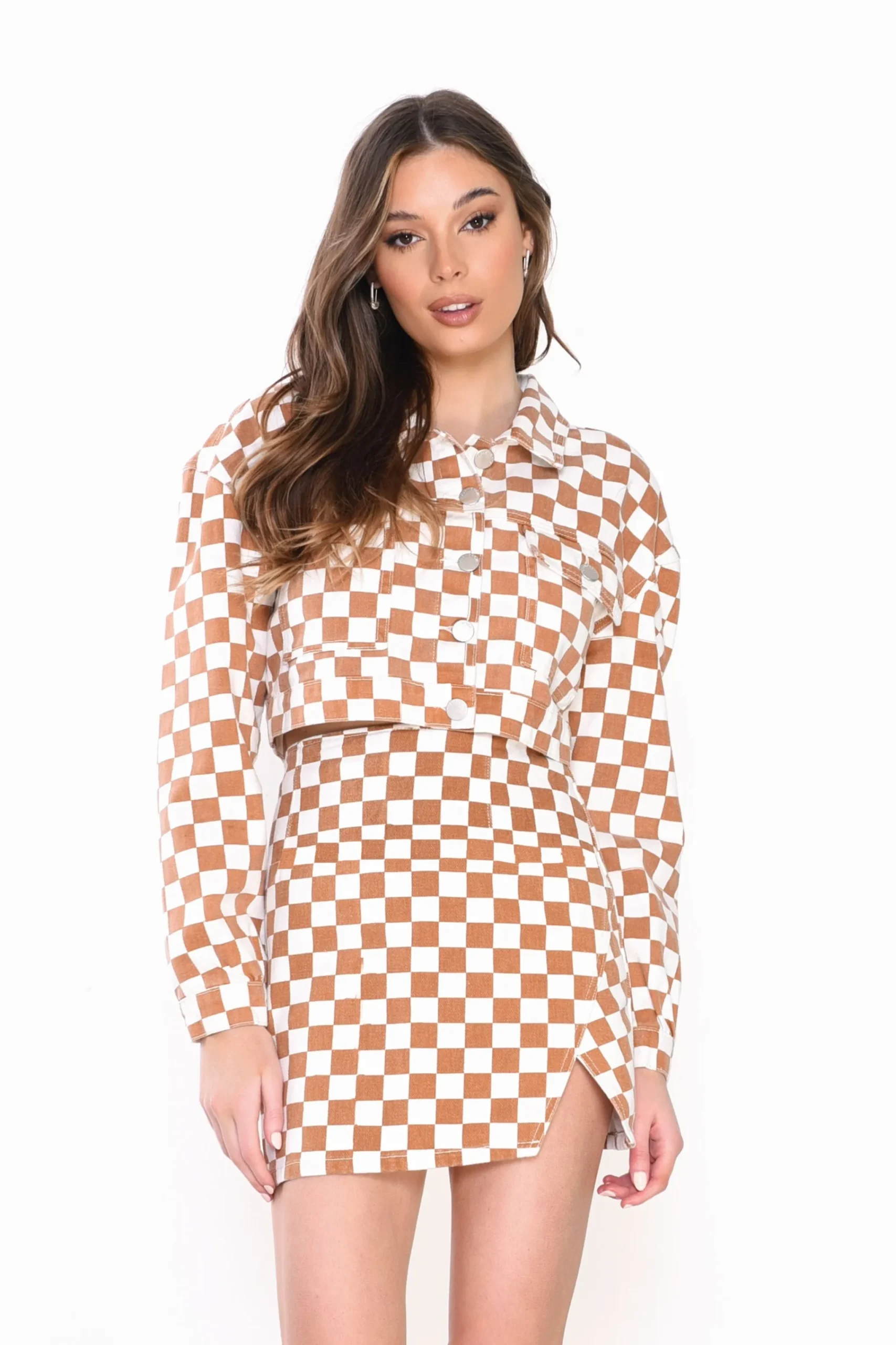 Glamorous Womens Brown White Checkerboard Pattern Denim Cropped Jacket. We are loving this super cropped denim jacket. This jacket co-ord is perfect for drinks with the girls or a date night. Style with matching mini skirt and your favourite heels to complete the look.