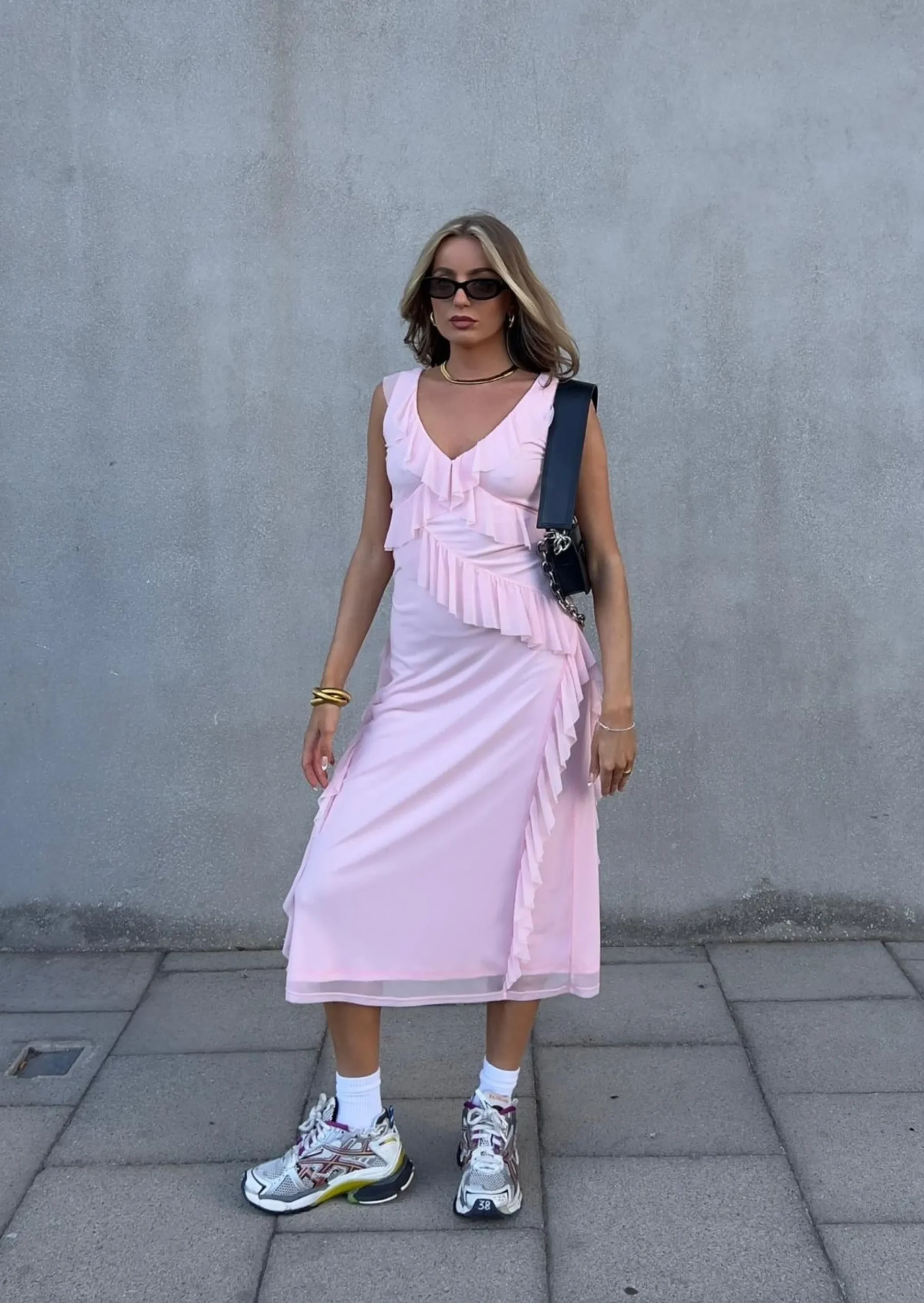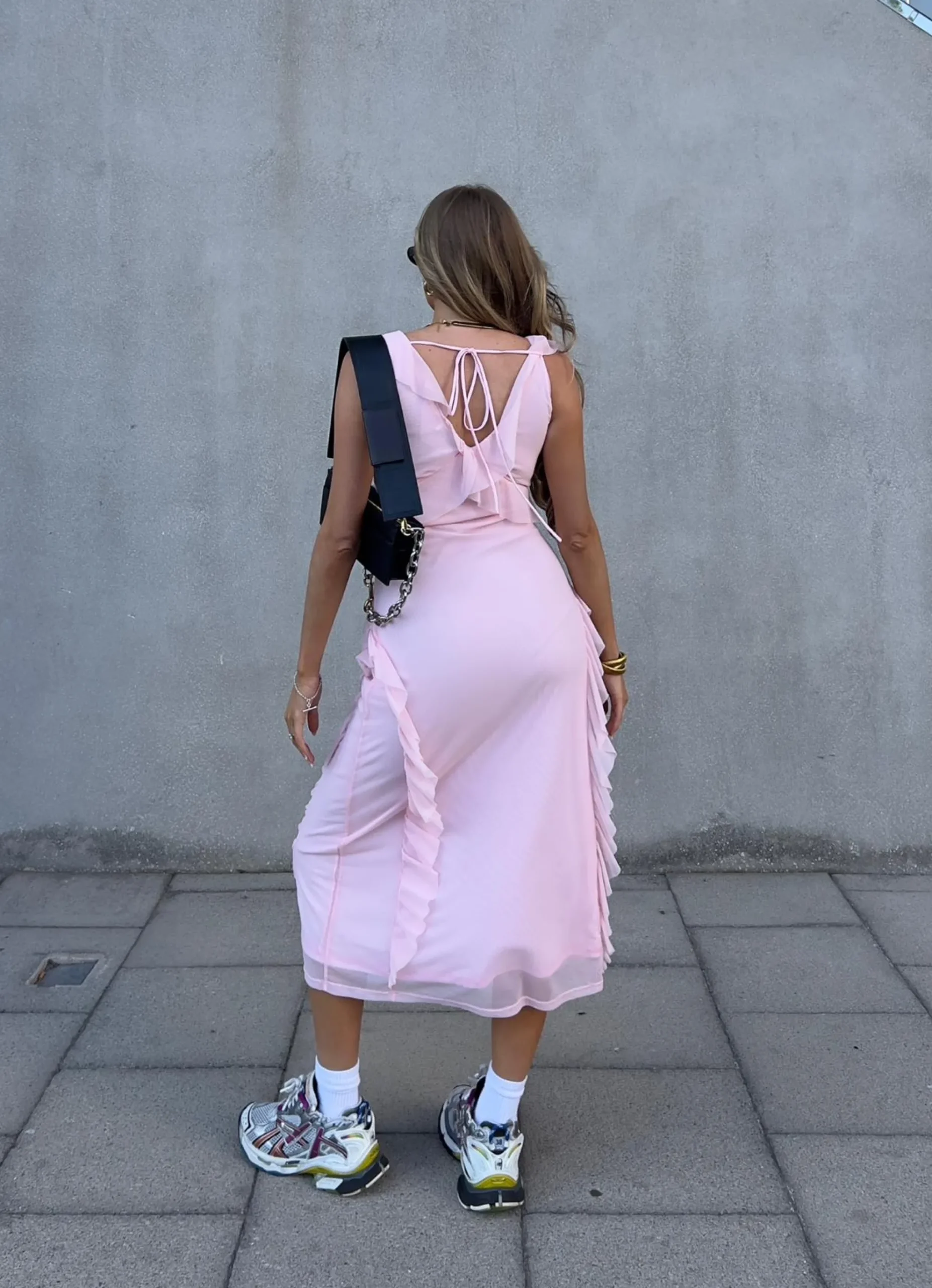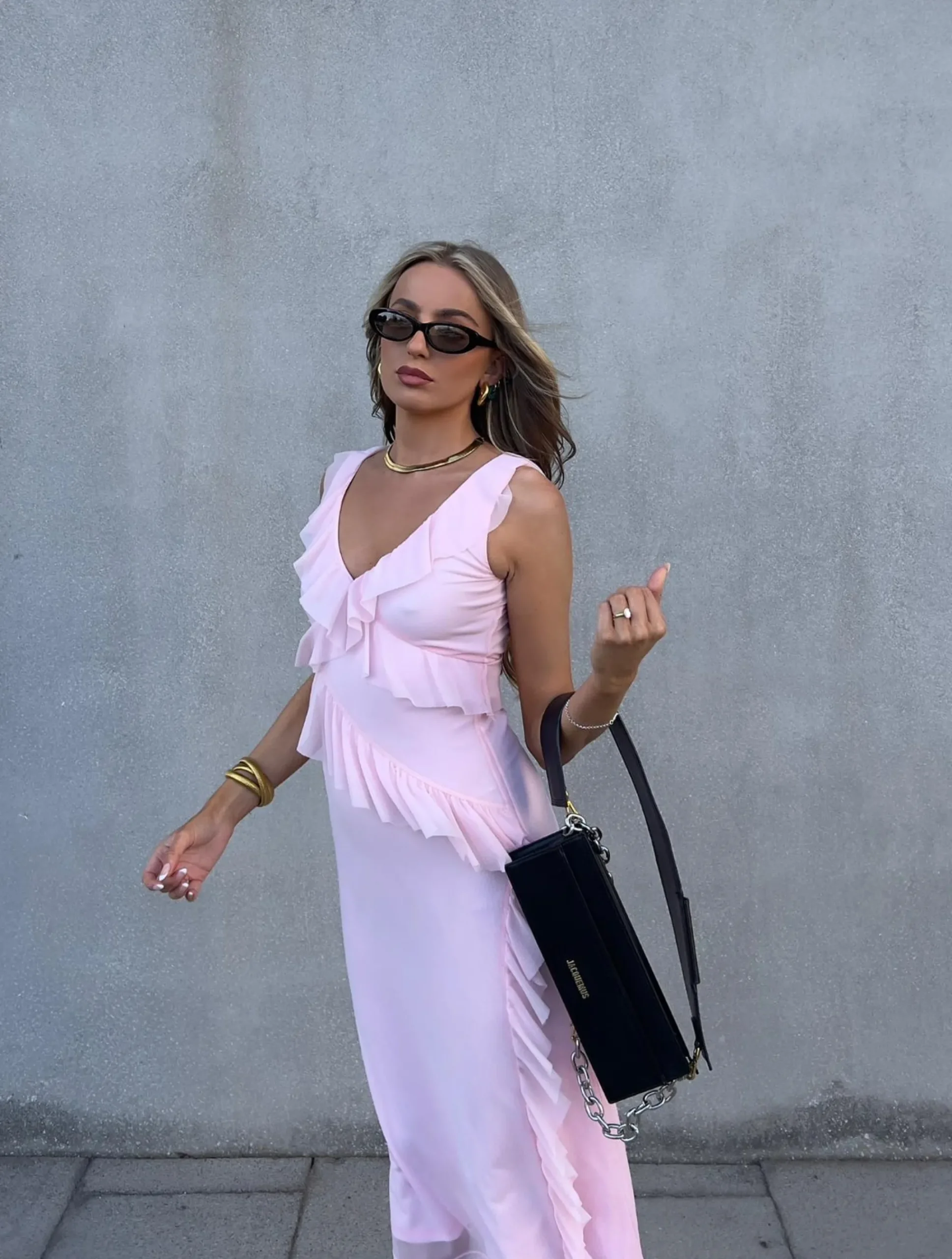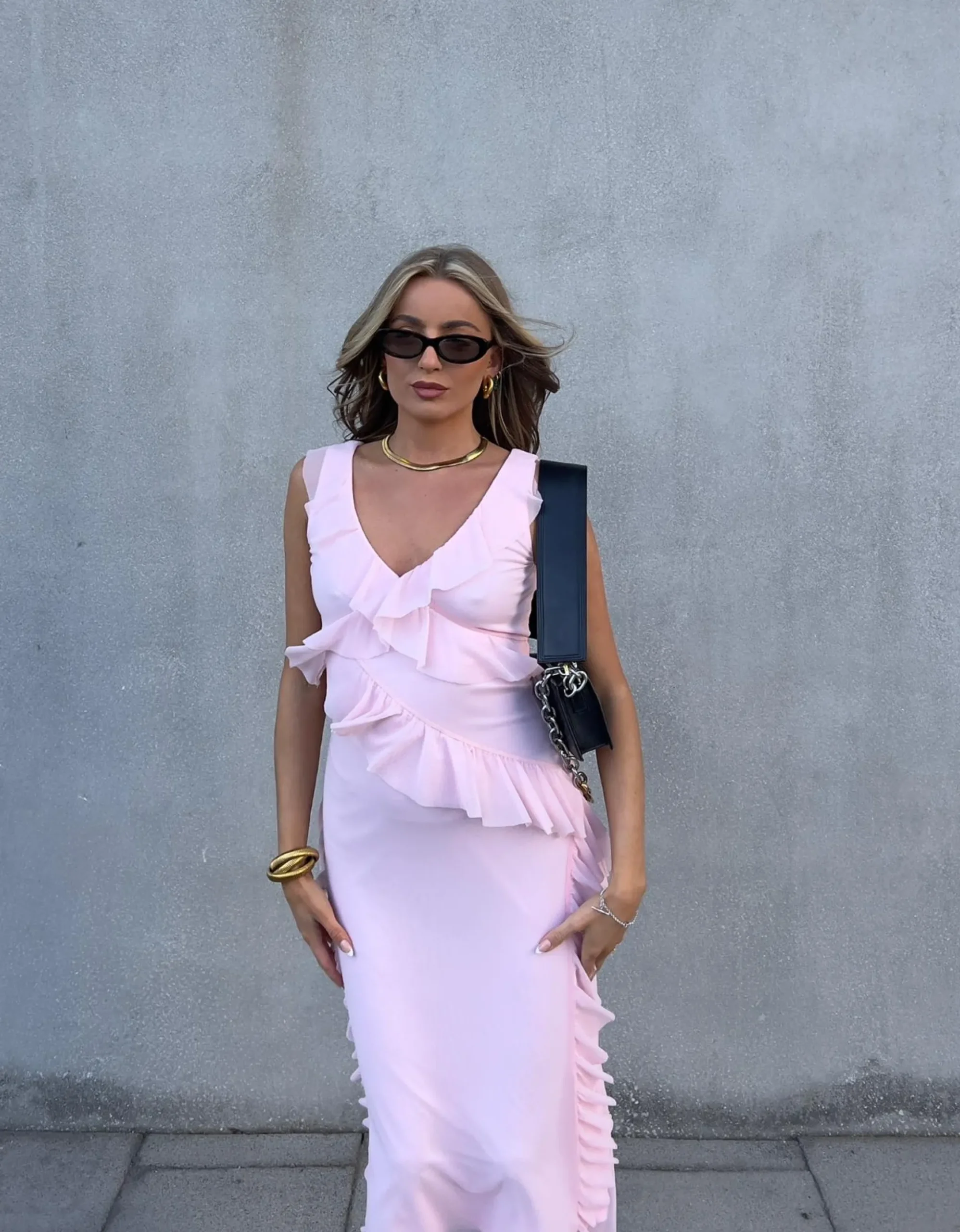 Collective the Label Women’s Khloe Ruffle Midaxi Dress -Pale Pink. Feel the love in this irresistibly romantic midaxi dress, with delicate ruffles and a plunging neckline to create that eye-catching piece. In a beautiful pale pink, the Khloe dress will be sure to make those boys wink. It is the ideal option for an effortless date night look.