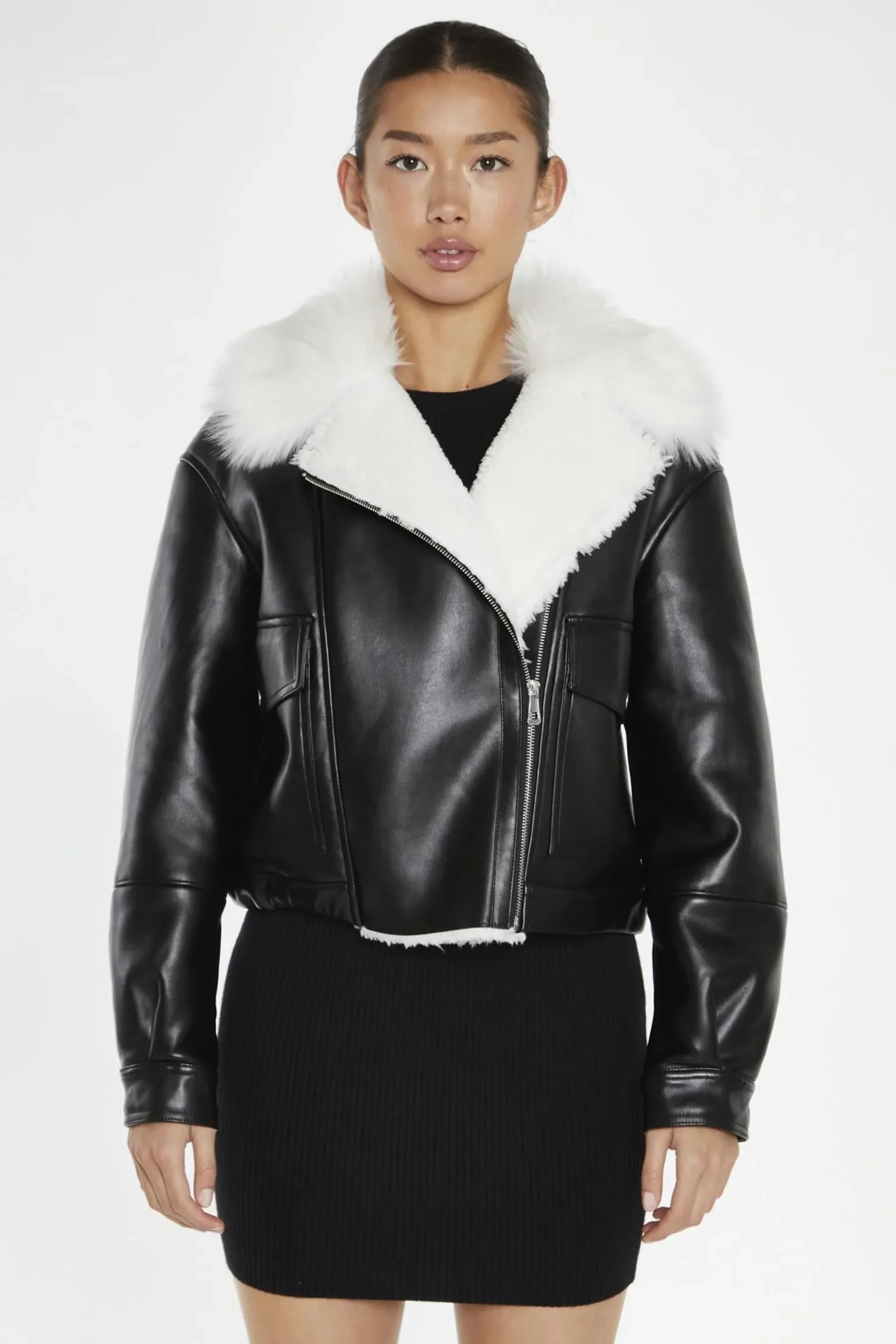 Glamorous Women’s Black-White Faux-Fur PU Jacket . Say hello to your new favourite cold-weather companion: the black and white PU leather jacket that’s as stylish as it is cozy. This long-sleeved beauty combines classic biker jacket vibes with a modern twist, thanks to its striking two-tone design. The waist belt lets you cinch it in for a more defined silhouette or leave it loose for a relaxed look. But the real star of the show is the plush fur lining, which wraps you in warmth on chilly days. And let’s not forget about the pockets – perfect for keeping your hands toasty or stashing your essentials. This jacket isn’t just practical; it’s a true style statement. Throw it over a simple tee and jeans for an instant cool-factor boost, or use it to toughen up a flowy dress. The black and white colour scheme makes it incredibly versatile, fitting seamlessly into any wardrobe. It’s the kind of jacket that makes you look forward to cooler weather, just so you have an excuse to wear it. Durable, comfortable, and undeniably chic, this PU leather jacket is ready to become your go-to outer layer for seasons to come.