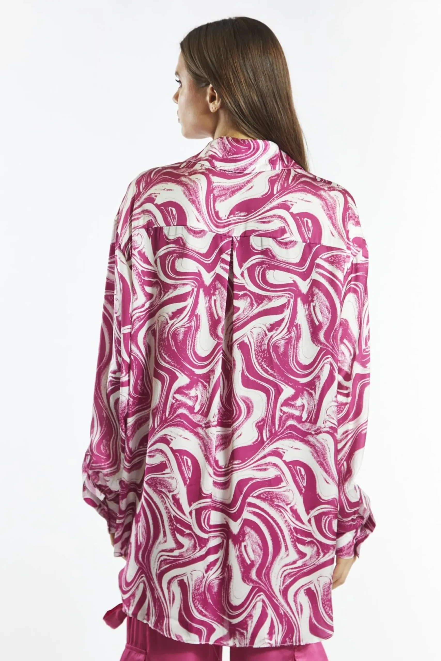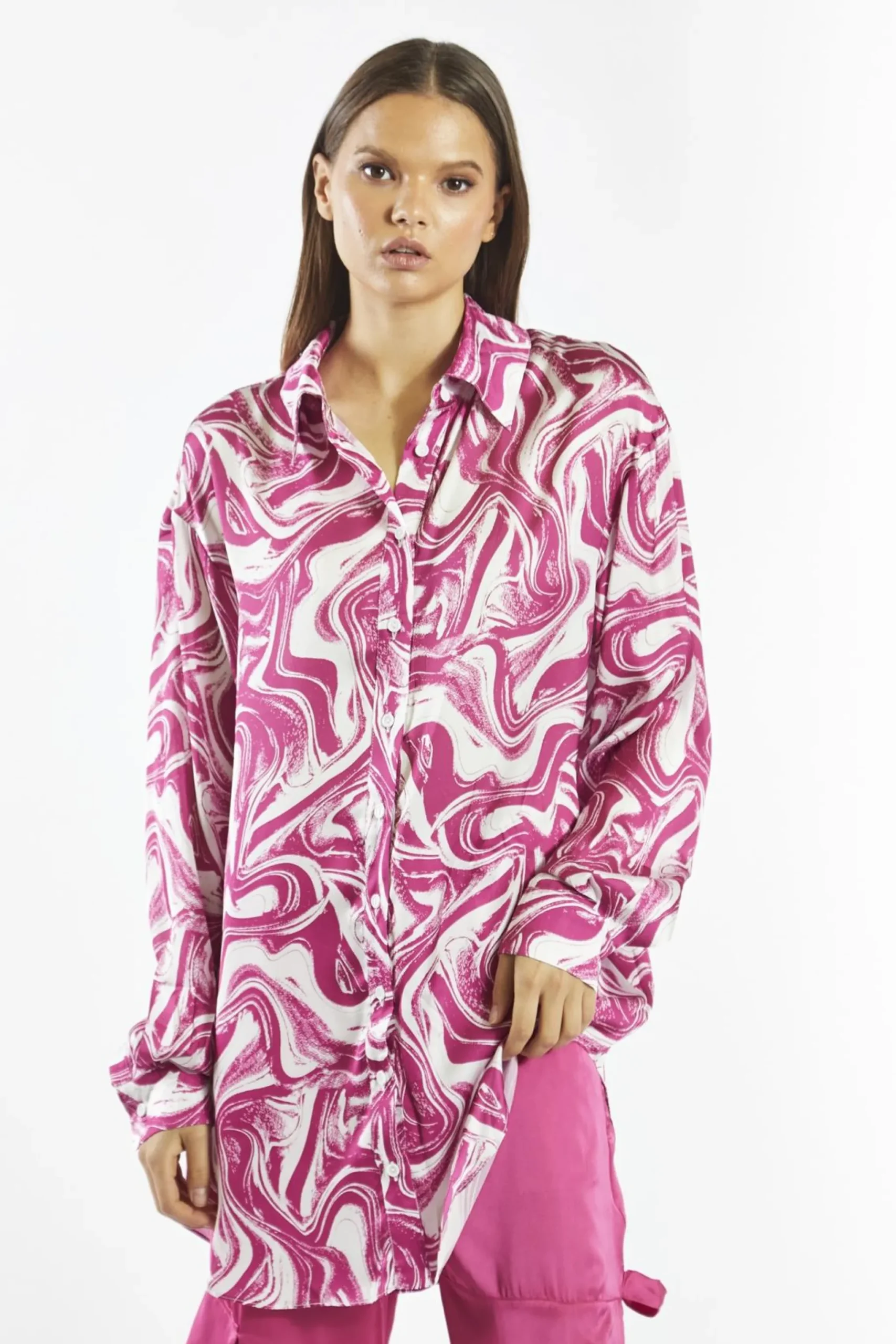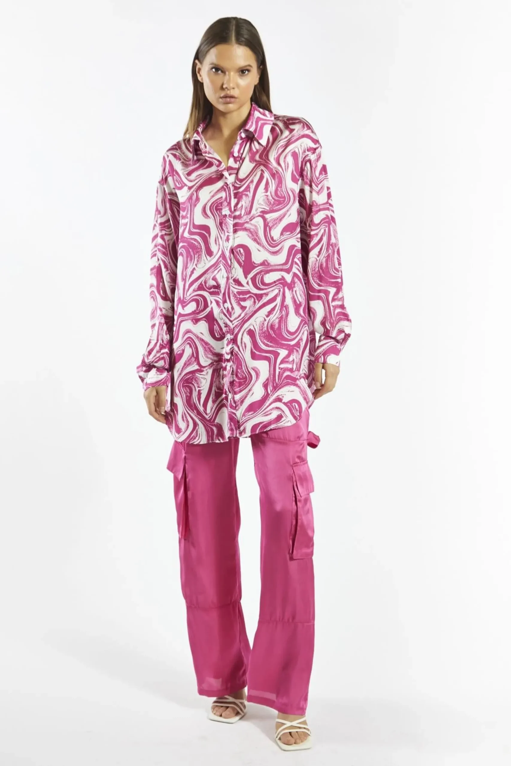 Glamorous Care Women’s Bright-Pink Marble Oversized-Shirt. Make a statement in this bright-pink marble print oversized shirt. The recycled polyester fabric is not only eco-friendly but also incredibly soft and comfortable. The oversized fit creates a relaxed, effortless vibe that’s perfect for laid-back days. Slip it on over a cami and jeans for a casual weekend look, or tuck it into a mini skirt for a night out. The button front closure allows you to adjust the fit and style to your liking. Pair it with our bright pink Cargo trousers for a trendy ensemble versatile outfit. This chic and eye-catching shirt will quickly become a wardrobe staple.