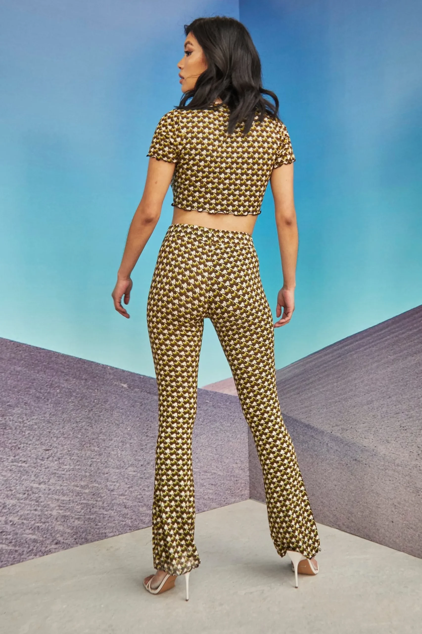 Glamorous Care Khaki Hounds tooth High Waisted Trousers. We cant get enough of these print trousers featuring a super on trend flattering fit. Join our positive journey towards reducing the impact that fashion has on our planet by styling this with matching co ord top some heels for the evening or trainers for the daytime for the perfect environmentally friendly look.